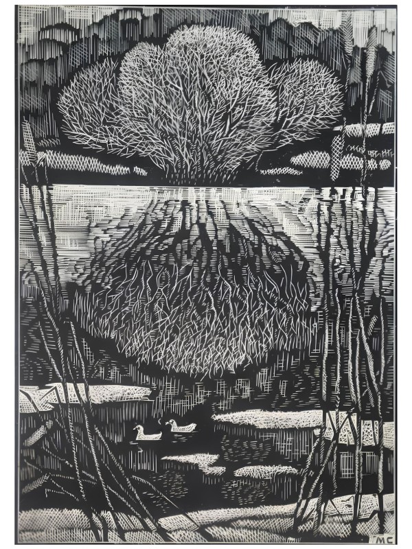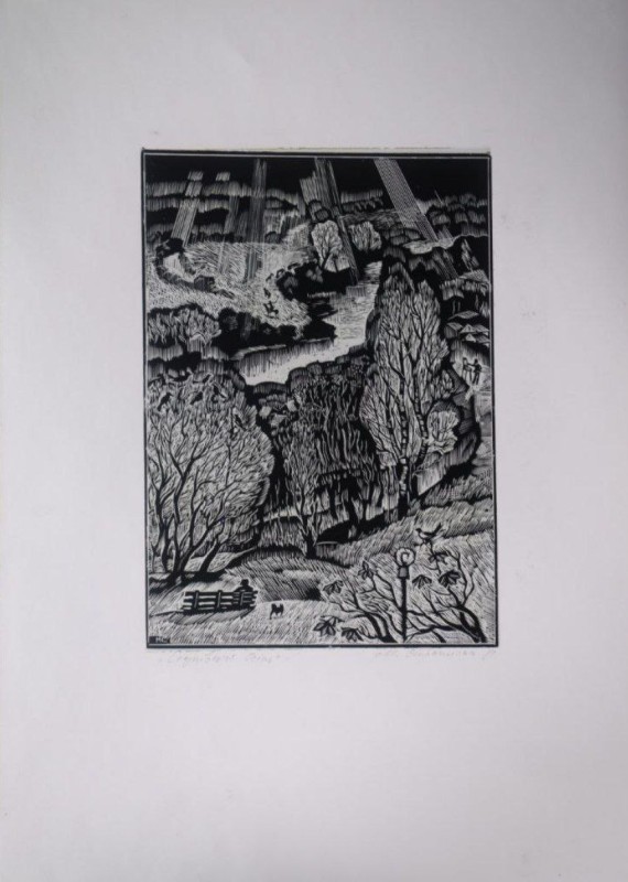 На передньому плані два дерева на кам'янистому березі гірської річки, далі — невеличке село в горах. До самого горизонту простяглися вершини карпатських гір. В нижньому лівому куточку ініціали художника: "МС." Внизу олівцем авторський напис: "М.Стратілат 1979 р." Оригінал.