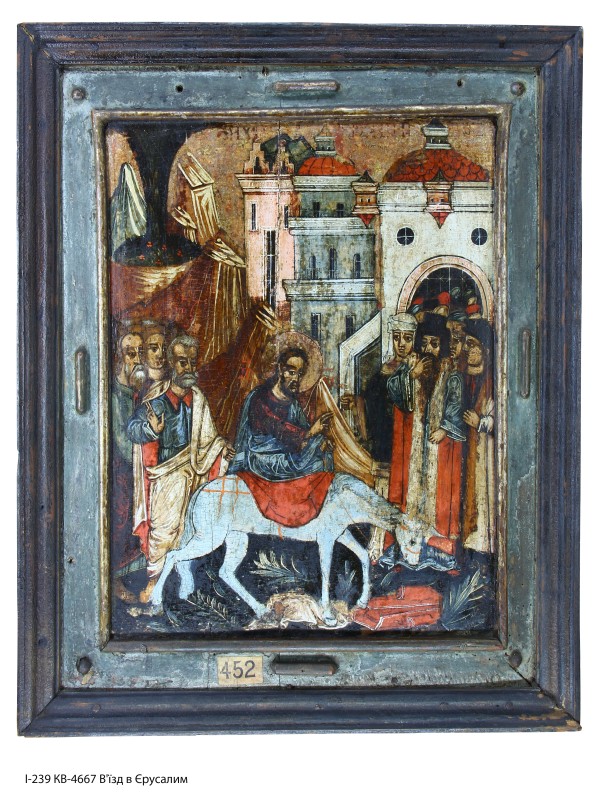 Ікона професійного виконання з празникового ряду іконостаса. У центрі, на першому плані – Спас верхи на сірому осляті з червоною вуздечкою та червоним покривалом. Христос у синьому гіматії поверх брунатного хітона; ноги опущені за тулуб осляти. Праворуч, на тлі архітектури міста, перед вхідною брамою – юрба міщан. Ліворуч, за Христом, ідуть апостоли. За ними – високі гірки-лещадки і деревце. Під ногами осляти розкинений одяг і пальмове гілля. Тло гладке, сріблене. Ікона у накладному профільованому обрамленні з боніями