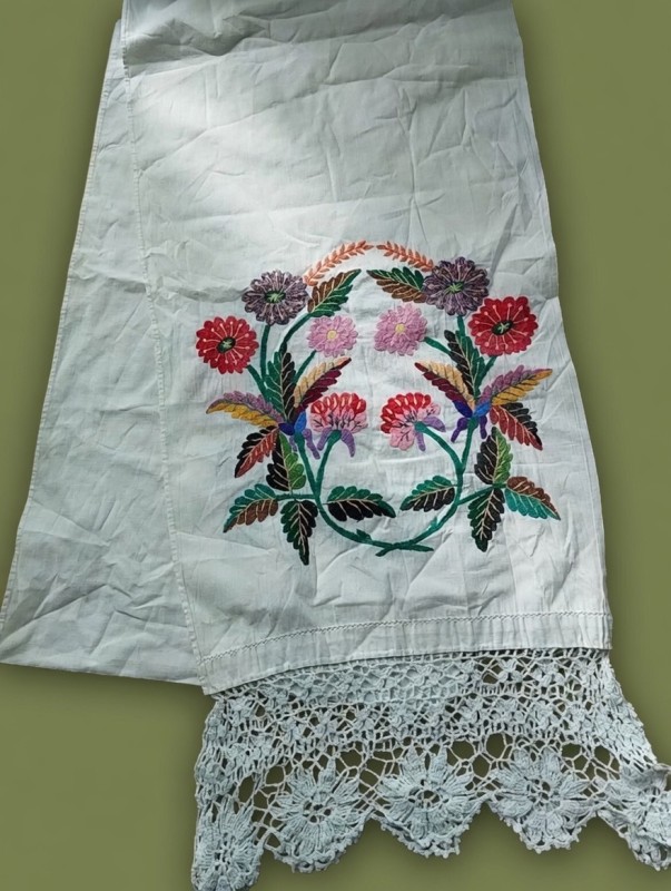 Текстильний виріб прямокутної форми, виконаний із тонкої світлої тканини. Уздовж центральної осі вишито декоративний орнамент із рослинними мотивами: гілки дуба з листям і жолудями, а також стилізовані шишки обрамлені гілочками хвої. Композиція симетрична, виконана нитками зелених, коричневих і бежевих відтінків. Краї виробу оздоблені вузькою мережкою.