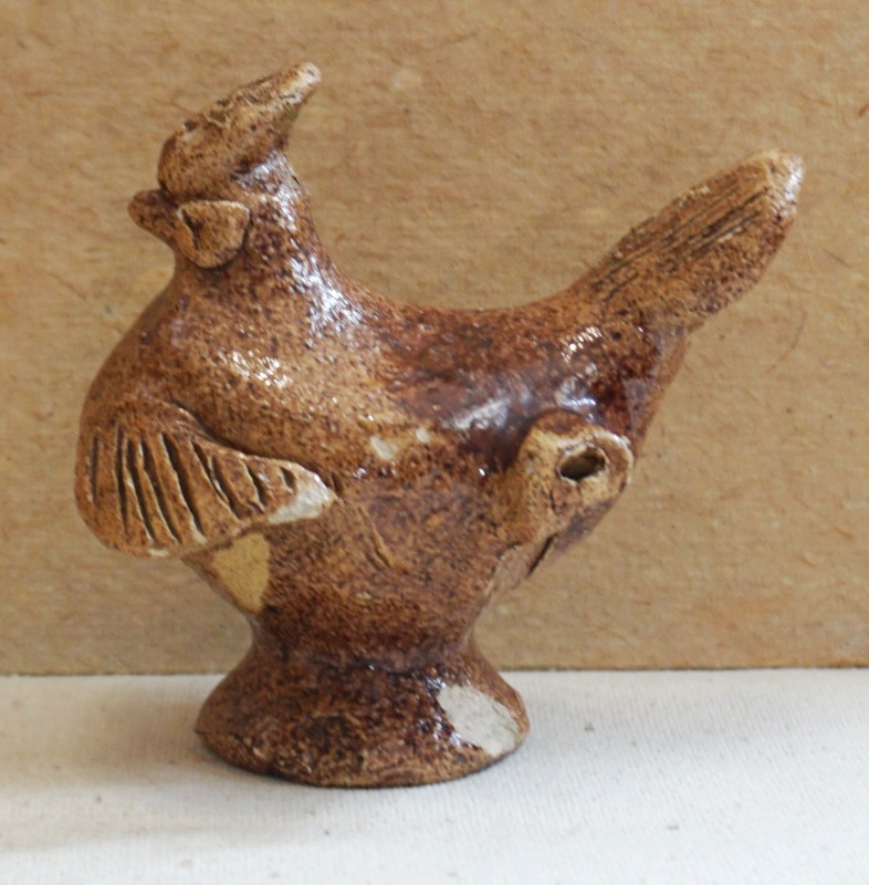 Іграшкова скульптурка квочки на круглій підставці. Голова мала, пряма; чубок високий. Крила невеликі, притиснуті до тулуба. Хвіст видовжений, піднятий догори, декорований «ритими» лініями, що імітують пір’я. З правого боку отвір для дуття та два отвори для виходу повітря з лівого боку. Зовні полива коричневого кольору.