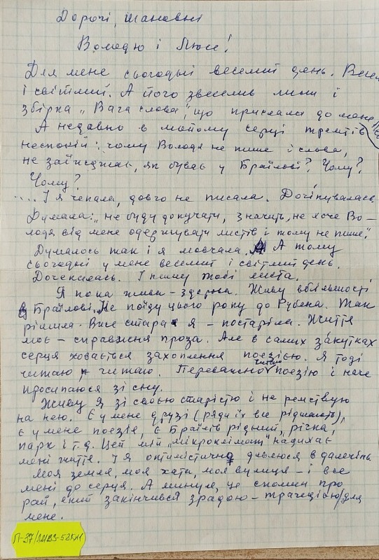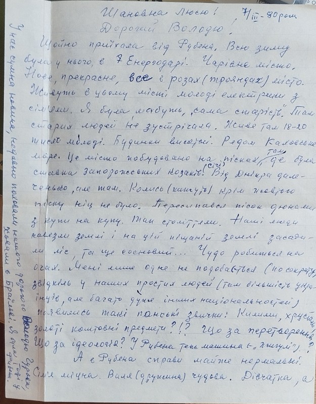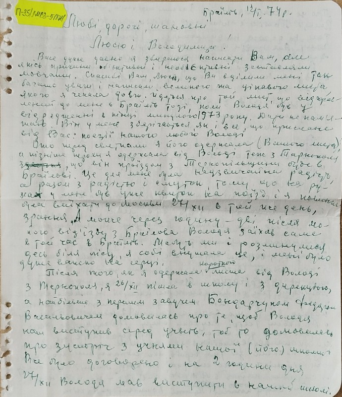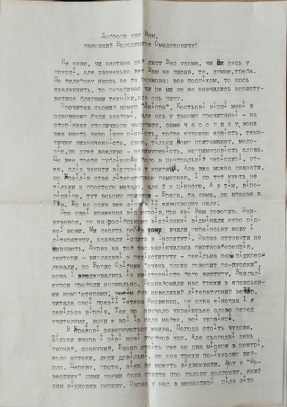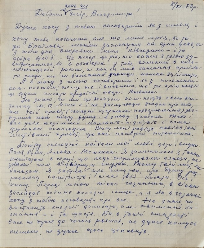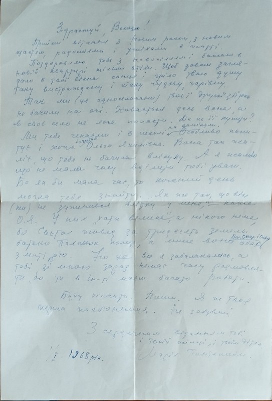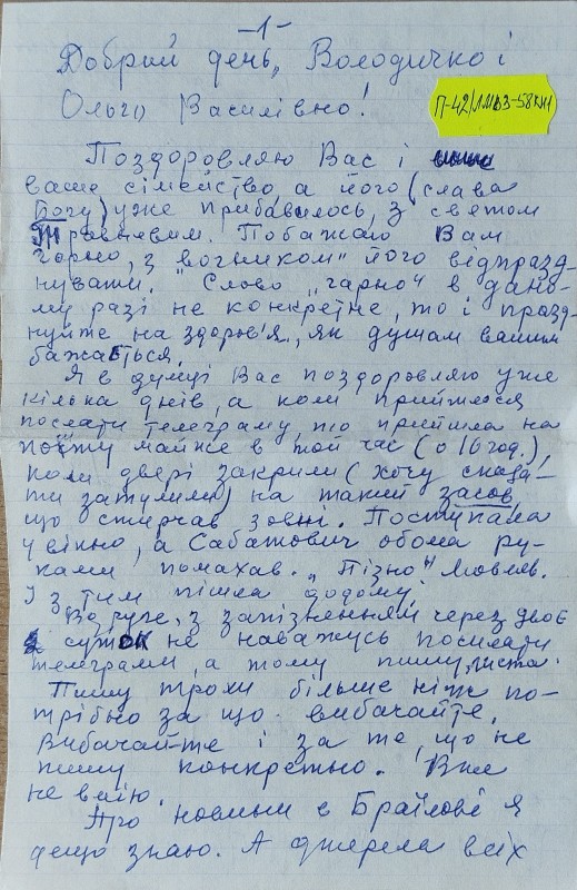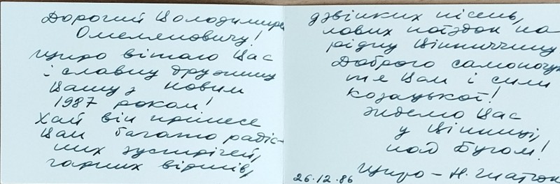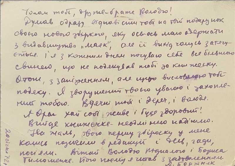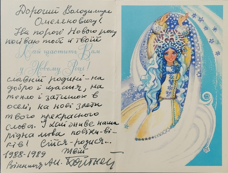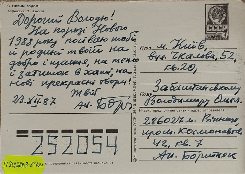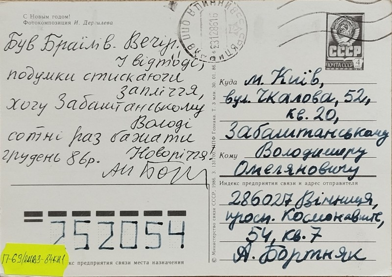 Листівка містить вітання Володимира Омеляновича Забаштанського з нагоди святкування Нового 1964 року. Текст має особистий, привітальний характер. Вітальна листівка має рукописний текст, виконаний кульковою ручкою синього кольору українською мовою. Містить поштову марку, штемпелі. Папір з ознаками природного старіння. Текст збережений, читабельний. Рукописний вітальний текст розміщений на зворотньому боці листівки.