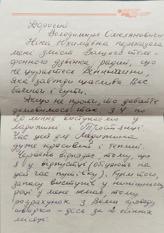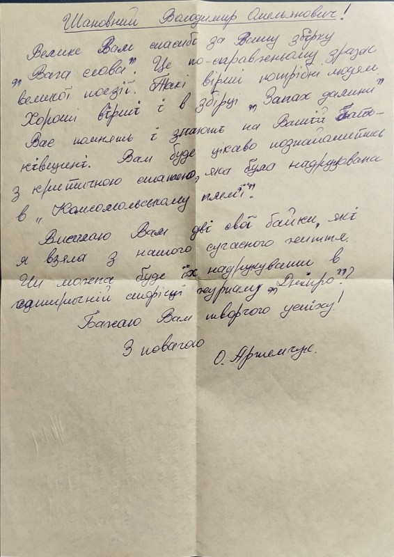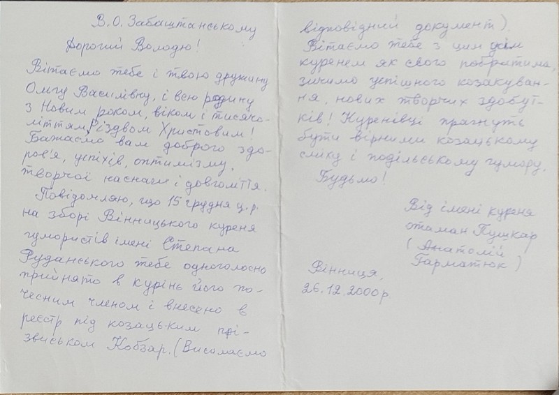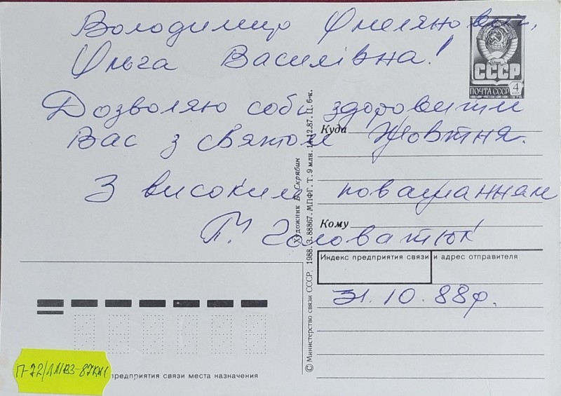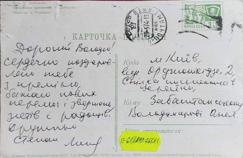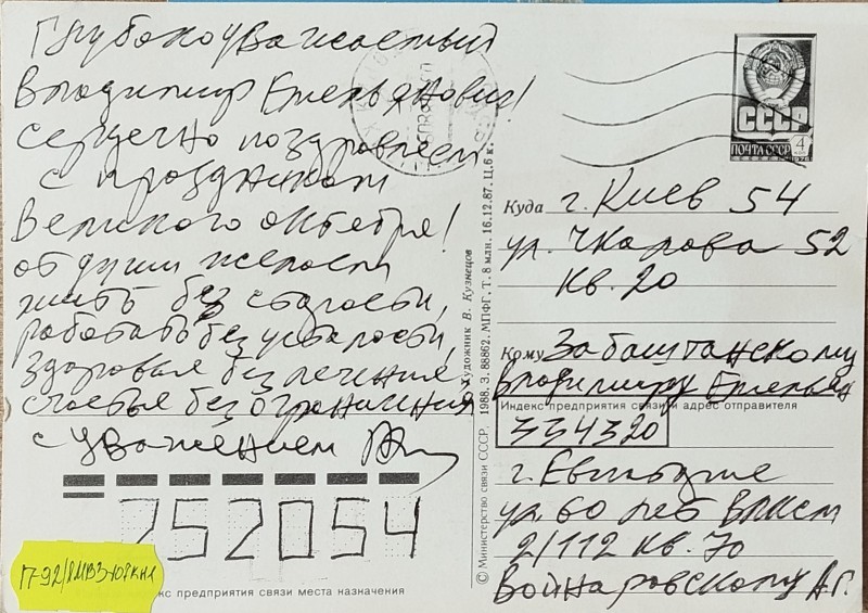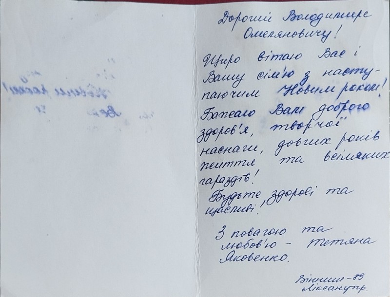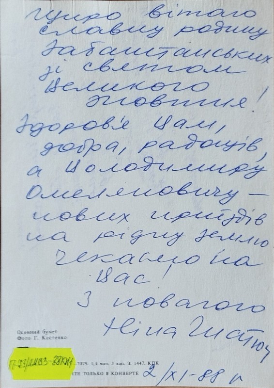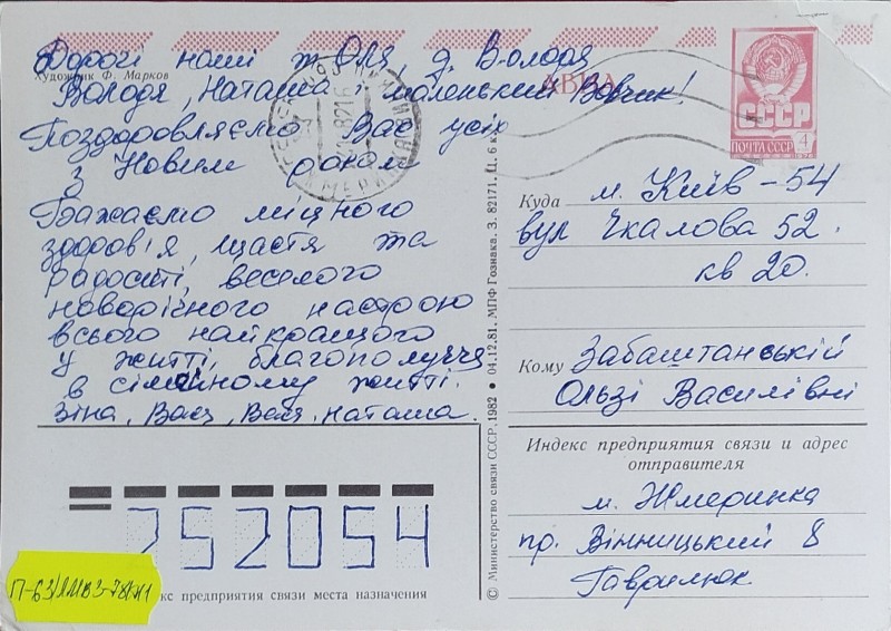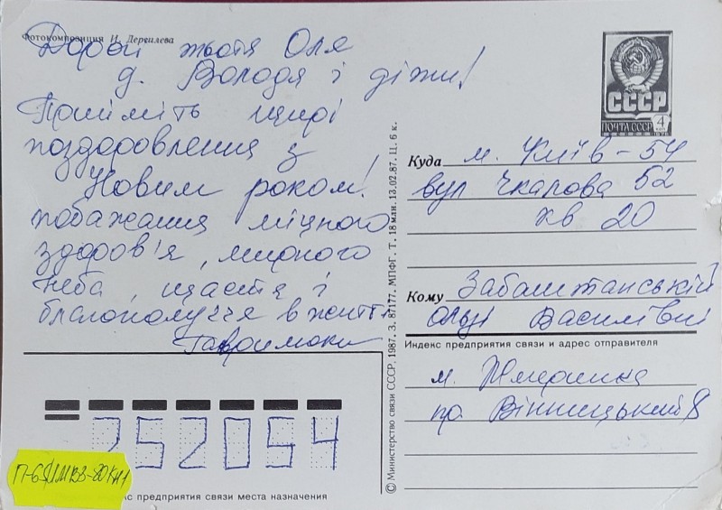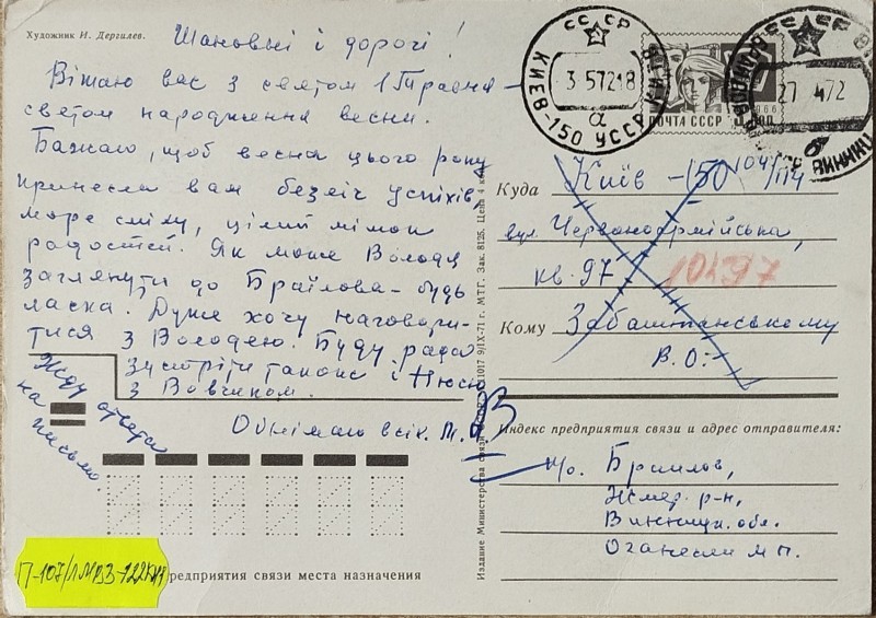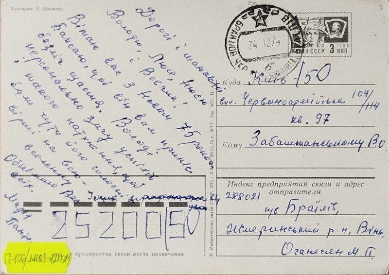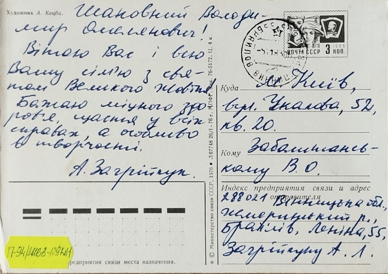 Листівка від М.П. Оганесян до В,О. Забаштанського