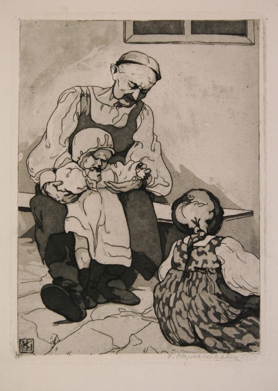 Побутова сцена. Під будинком, на тлі білої стіни, сидить на лавці у тричвертному повороті праворуч – старша жінка-селянка, яка підтримує малу дитину, що поривається йти. Праворуч на землі, спиною до глядача сидить ще одна дівчинка. Вона вбрана у літню квітчасту сукенку, волосся заплетене у косу, що спадає на спину. Авторські сигнатури: на нижньому полі ліворуч -напис: "Бабуня"; праворуч- підпис: "О.Кульчицька" і дата: "1913".