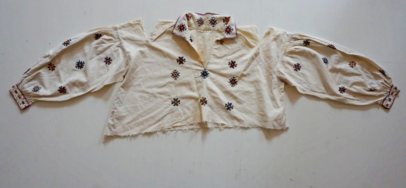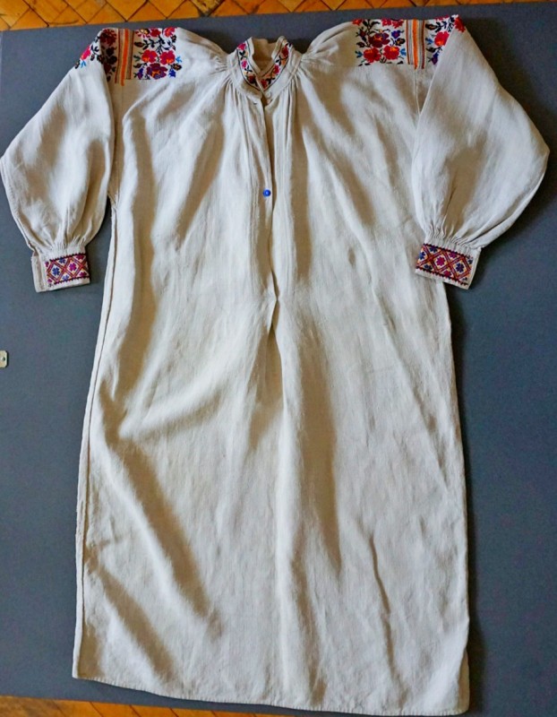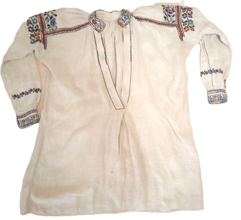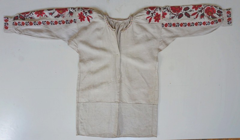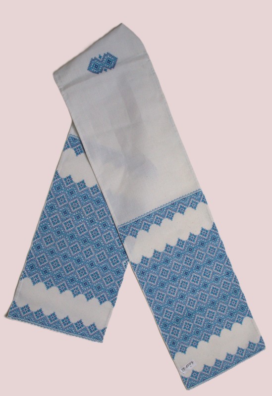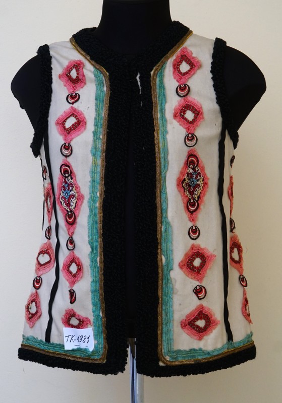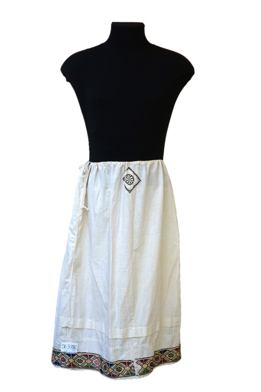 Одношовний, пошитий із вовняної тканини чорного кольору у білі горошки. Низ декорований трьохярусною композицією із шістьох безорнаментних стрічок червоного й рожевого кольорів та трьох рядів промислового мережива червоного кольору. До верхніх кінців пришиті по одній полотняній зав'язці чорного кольору. Належала актрисі театру «Руська бесіда» Філомені Лопатинській, у якому вона виступала у п’єсі «Катерина» М. Аркаса упродовж 1870-1940 рр.