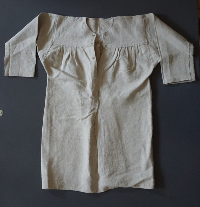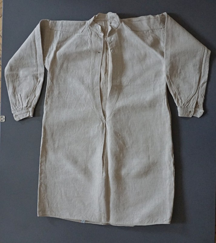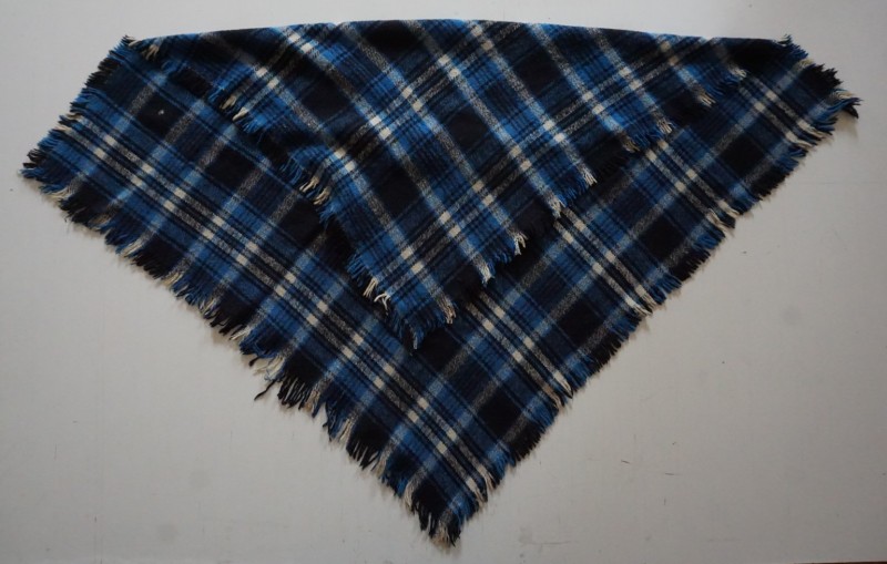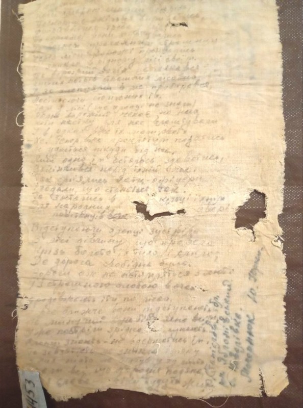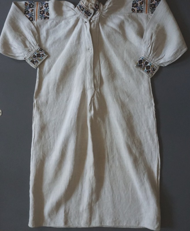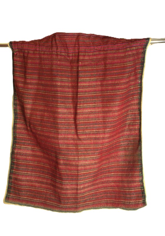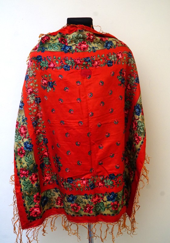 Одношовний, пошитий із вовняної тканини чорного кольору у білі горошки. Низ декорований трьохярусною композицією із шістьох безорнаментних стрічок червоного й рожевого кольорів та трьох рядів промислового мережива червоного кольору. До верхніх кінців пришиті по одній полотняній зав'язці чорного кольору. Належала актрисі театру «Руська бесіда» Філомені Лопатинській, у якому вона виступала у п’єсі «Катерина» М. Аркаса упродовж 1870-1940 рр.