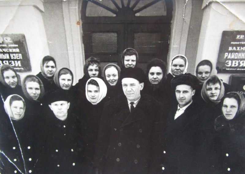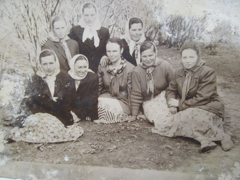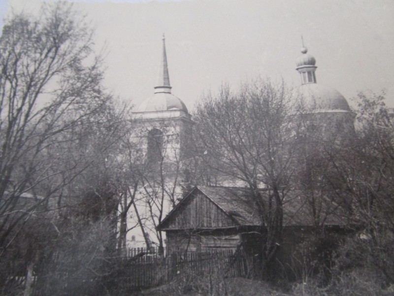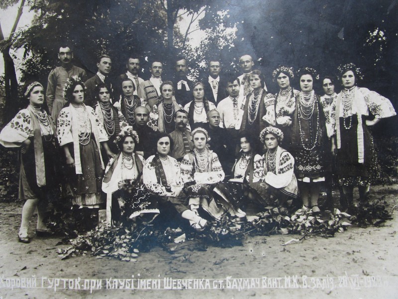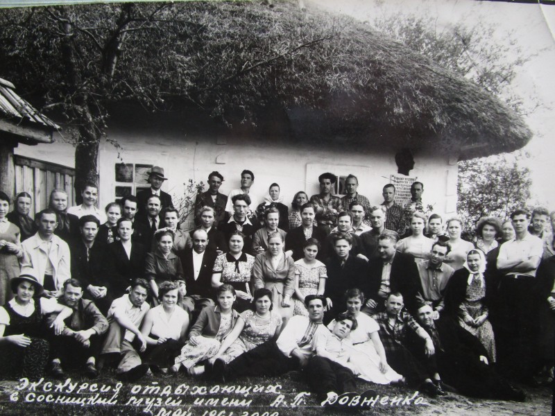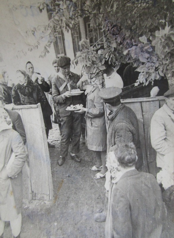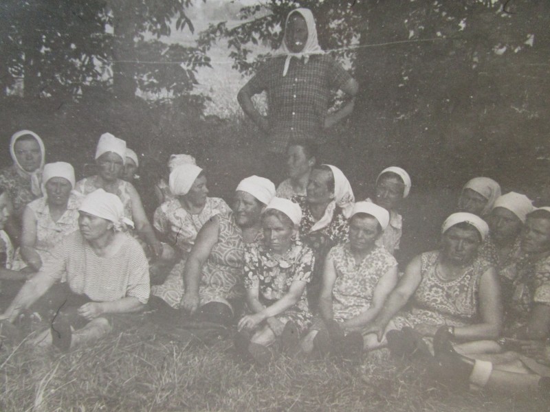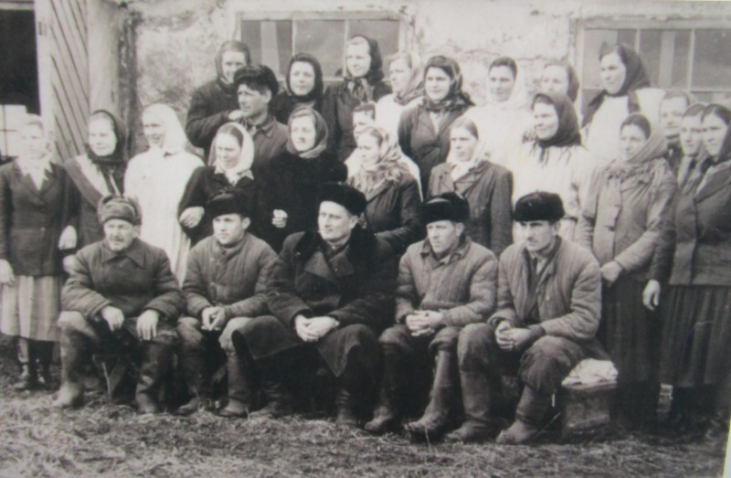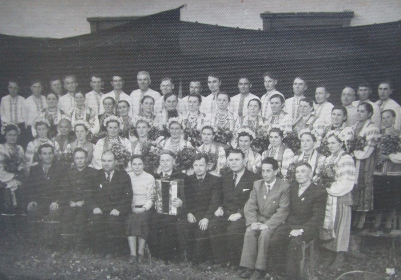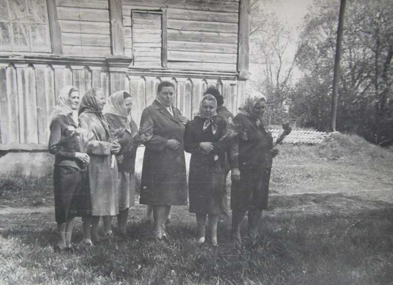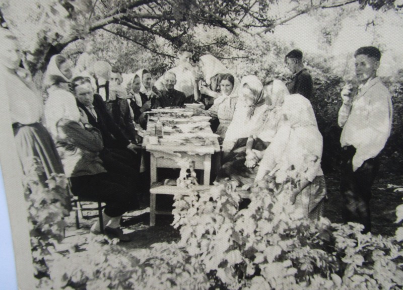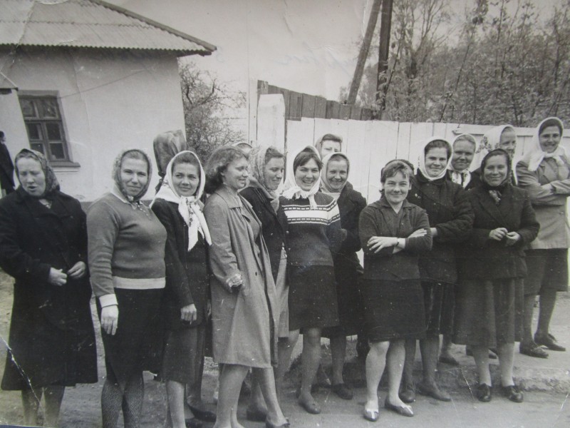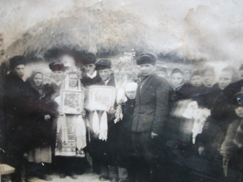 Біля церкви. На фото група людей: церковний хор і прихожани Свято-Преображенської церкви після хресного ходу навколо церкви. По центру протоієрей Чаленко Іван Григорович та протодиякон Прокопенко Іван Федорович одягнені у церковний одяг. На задньому плані дерев'яна церква. м. Бахмач, 50-ті рр. ХХ ст.