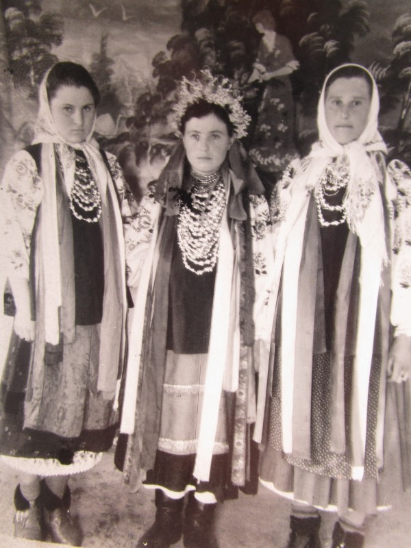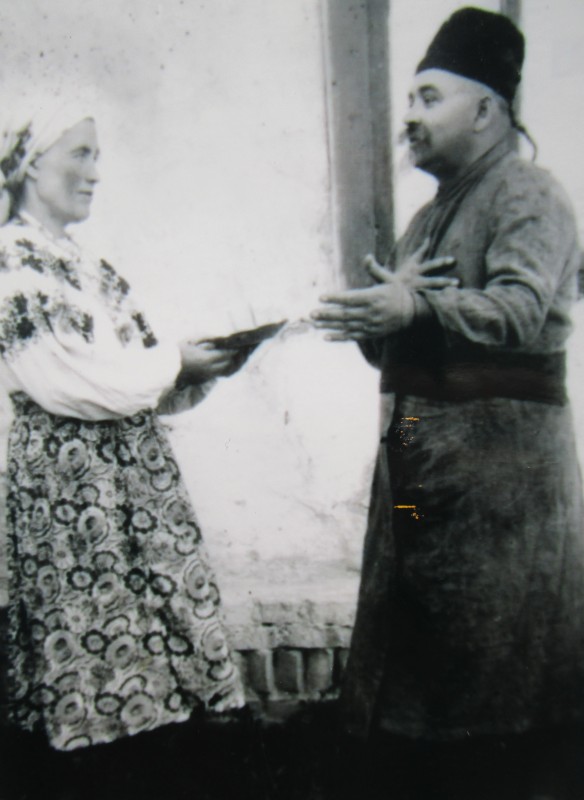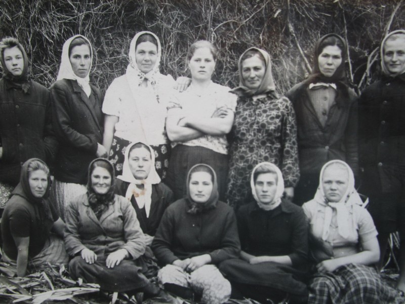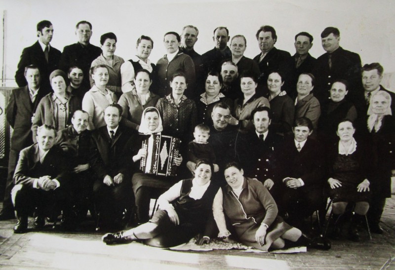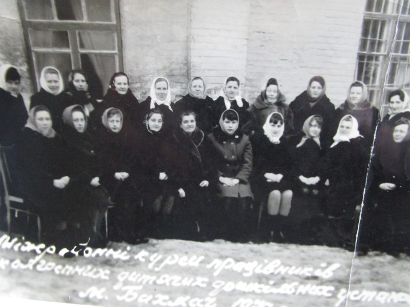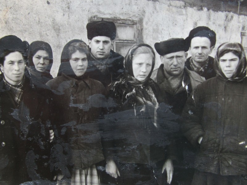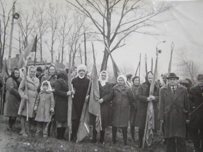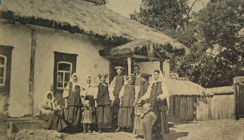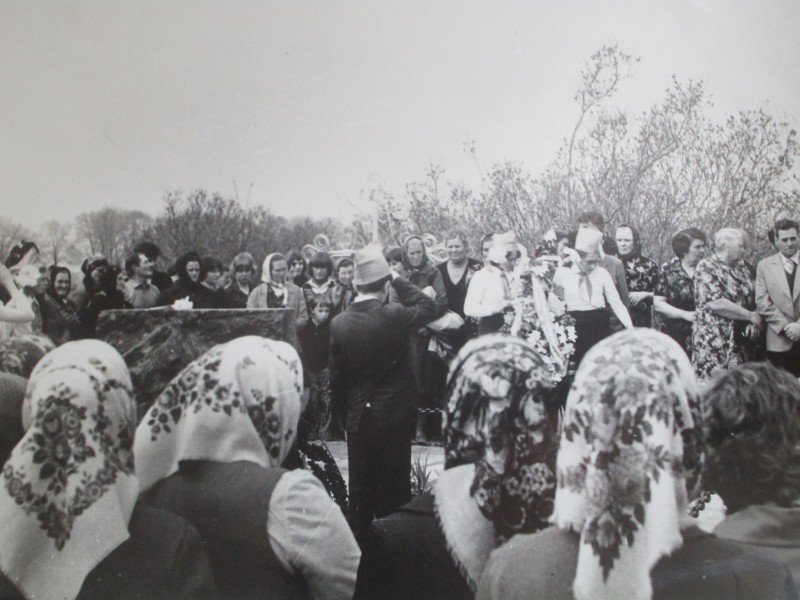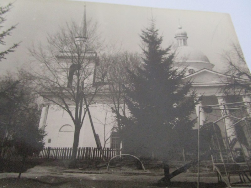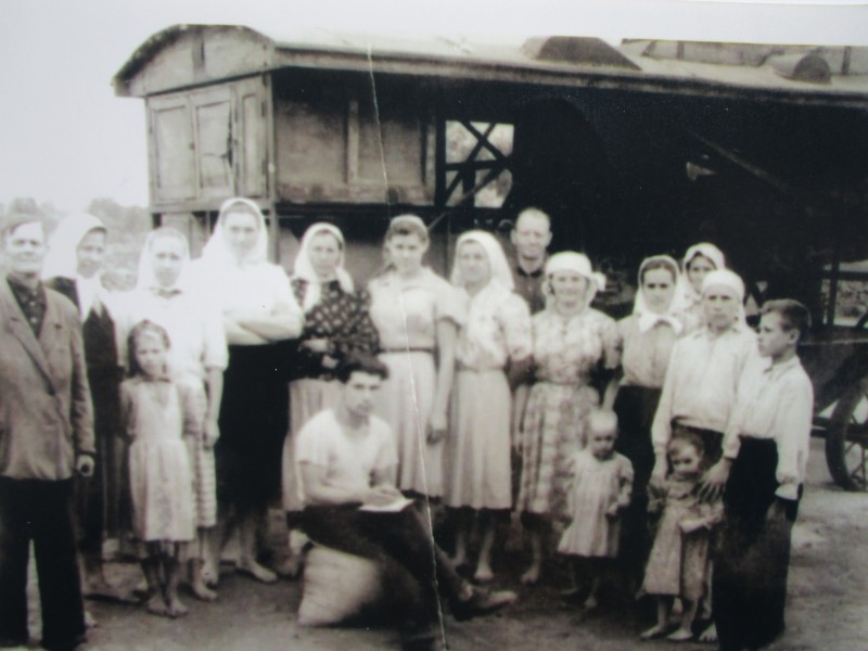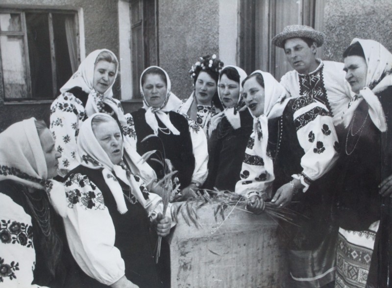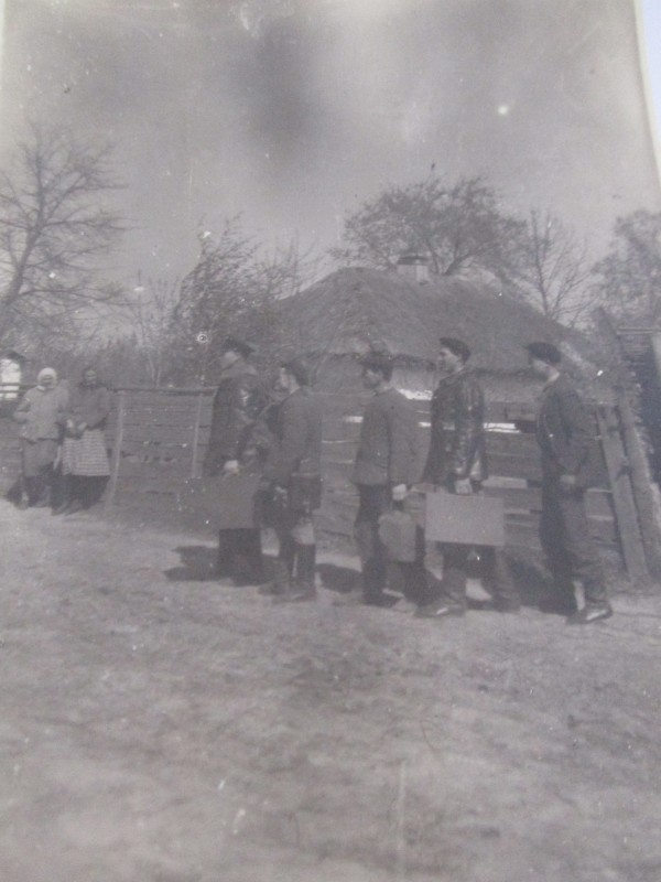Біля церкви. На фото група людей: церковний хор і прихожани Свято-Преображенської церкви після хресного ходу навколо церкви. По центру протоієрей Чаленко Іван Григорович та протодиякон Прокопенко Іван Федорович одягнені у церковний одяг. На задньому плані дерев'яна церква. м. Бахмач, 50-ті рр. ХХ ст.