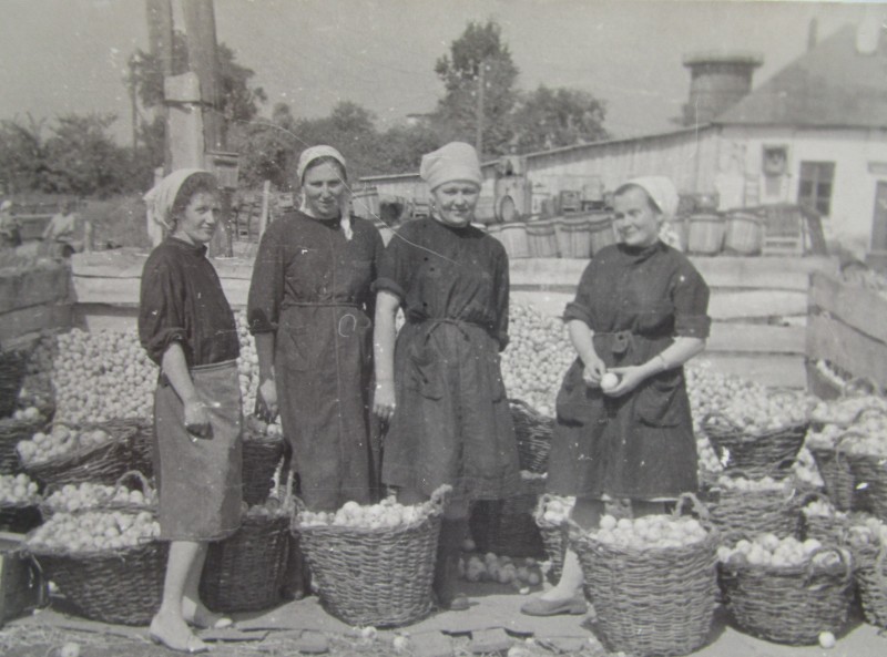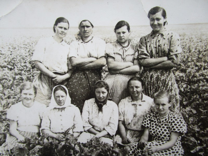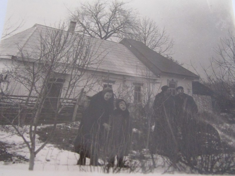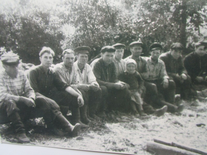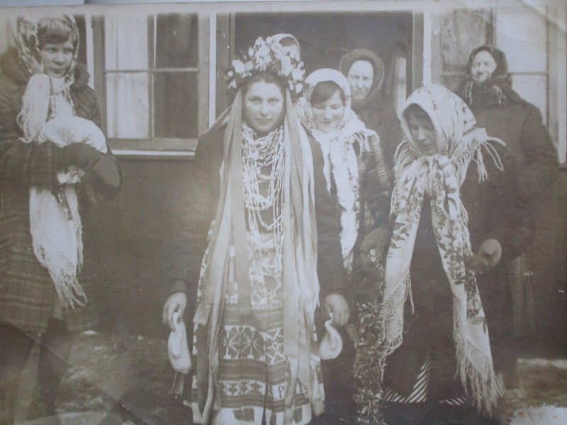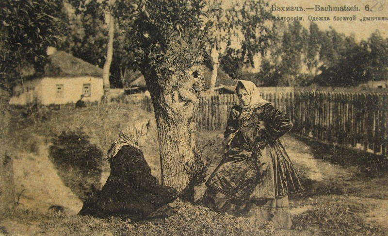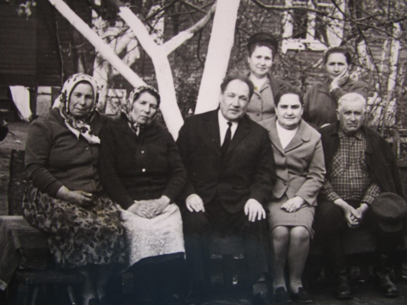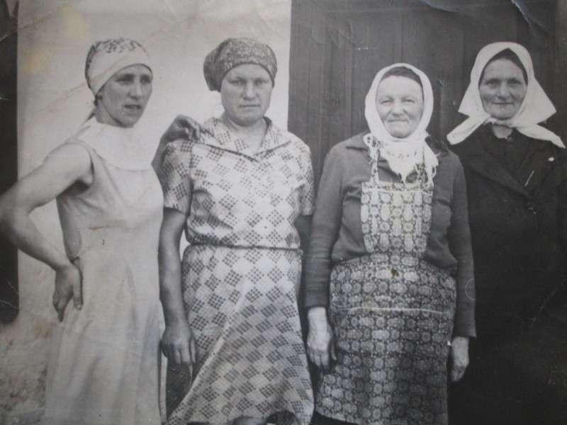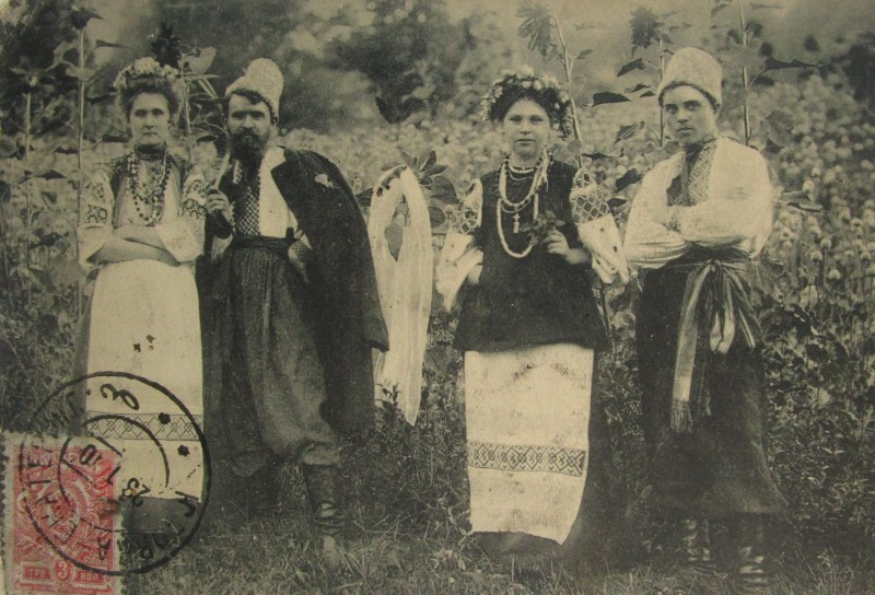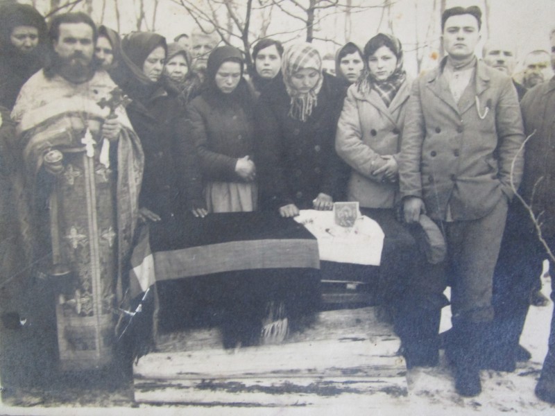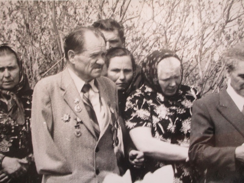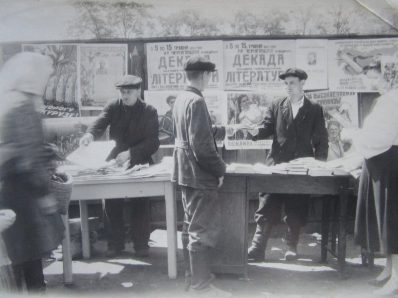 Біля церкви. На фото група людей: церковний хор і прихожани Свято-Преображенської церкви після хресного ходу навколо церкви. По центру протоієрей Чаленко Іван Григорович та протодиякон Прокопенко Іван Федорович одягнені у церковний одяг. На задньому плані дерев'яна церква. м. Бахмач, 50-ті рр. ХХ ст.