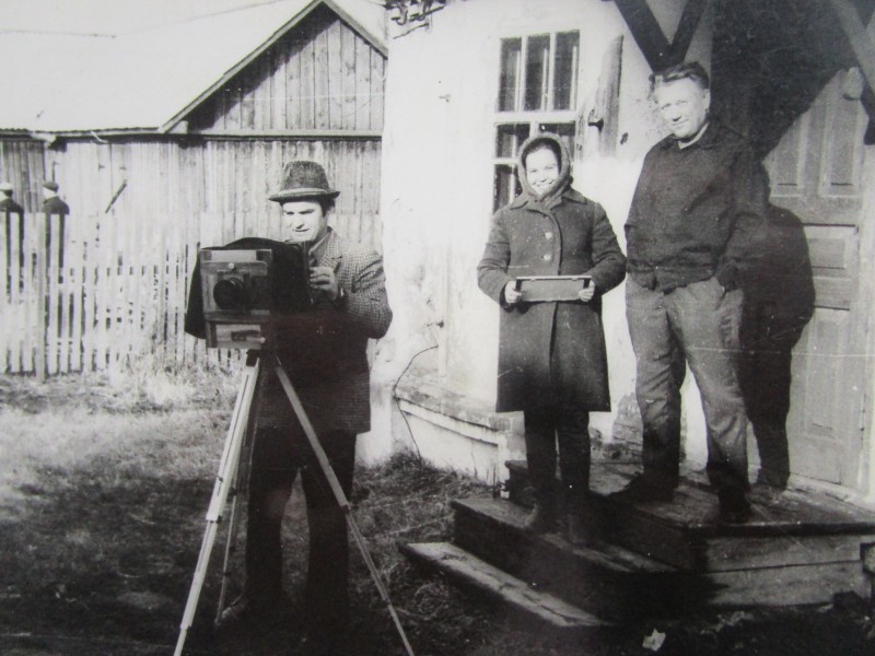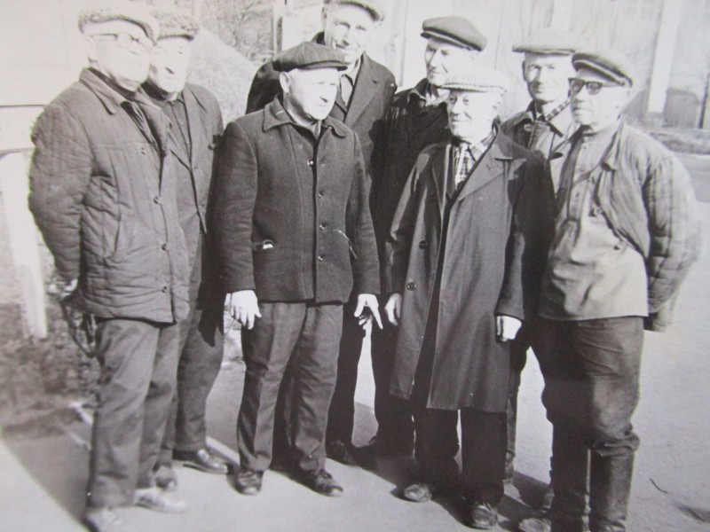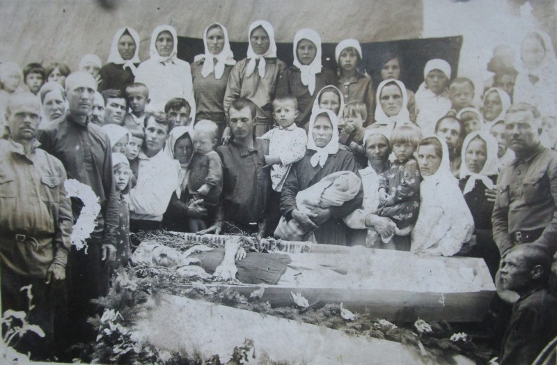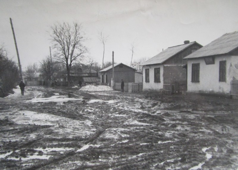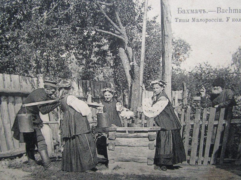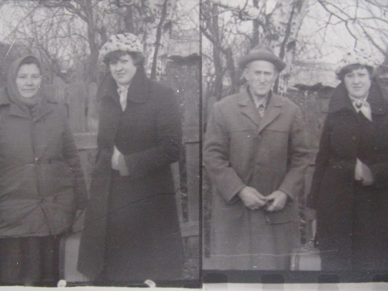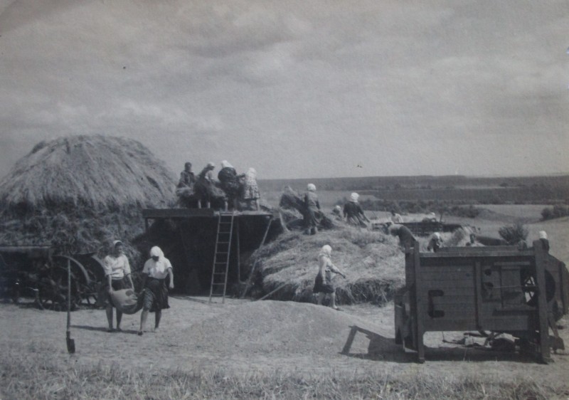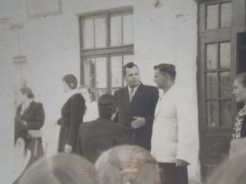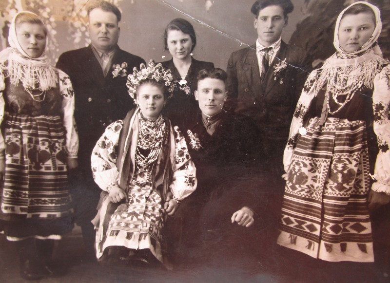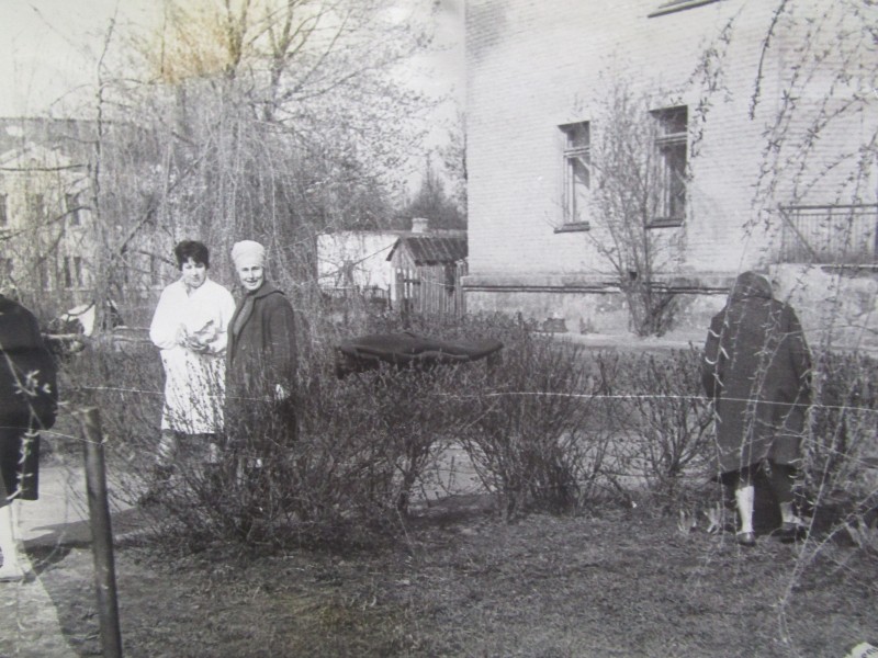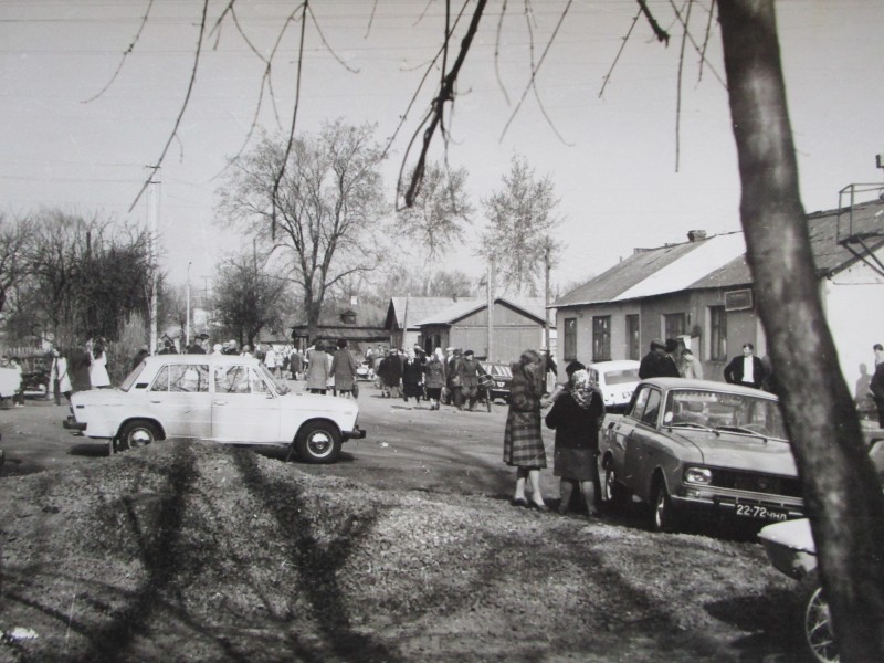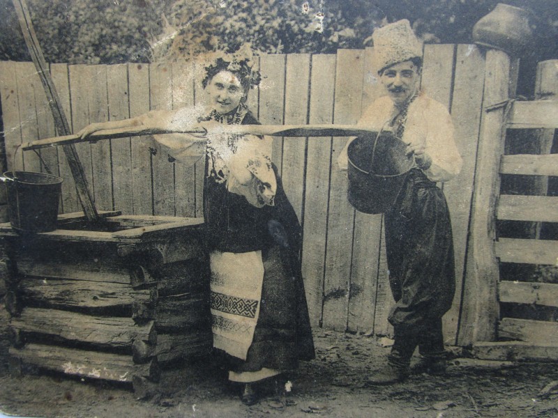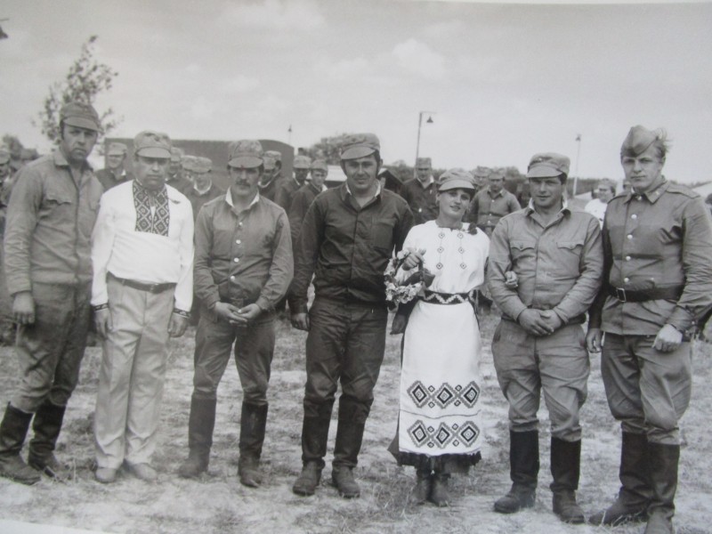 Біля церкви. На фото група людей: церковний хор і прихожани Свято-Преображенської церкви після хресного ходу навколо церкви. По центру протоієрей Чаленко Іван Григорович та протодиякон Прокопенко Іван Федорович одягнені у церковний одяг. На задньому плані дерев'яна церква. м. Бахмач, 50-ті рр. ХХ ст.