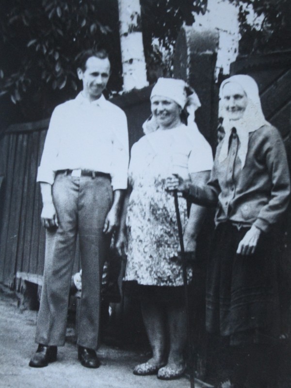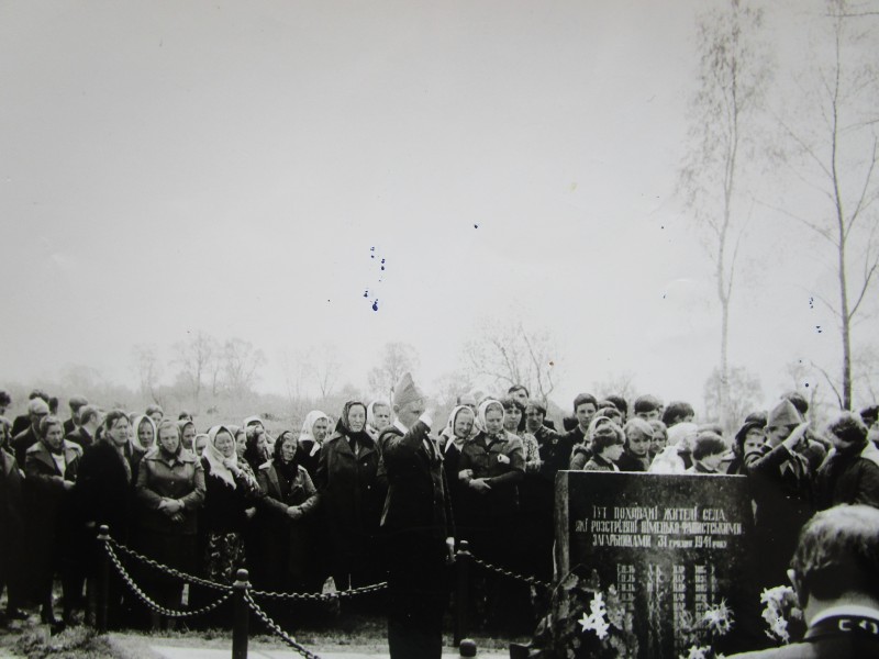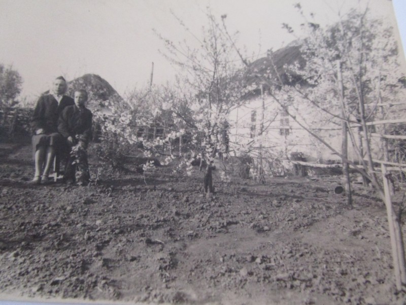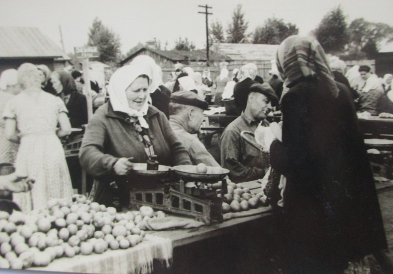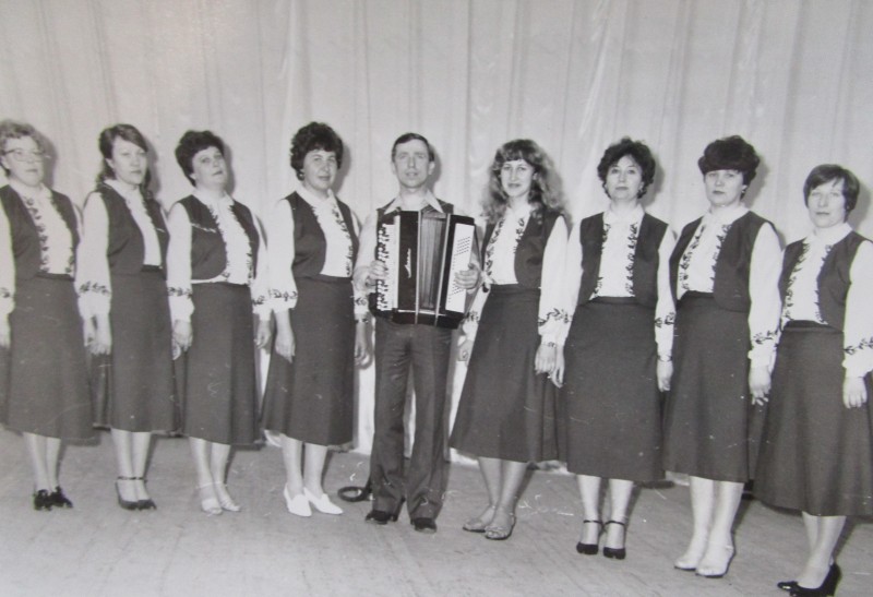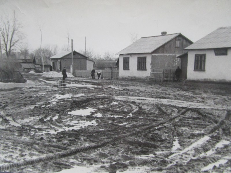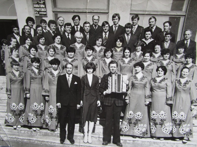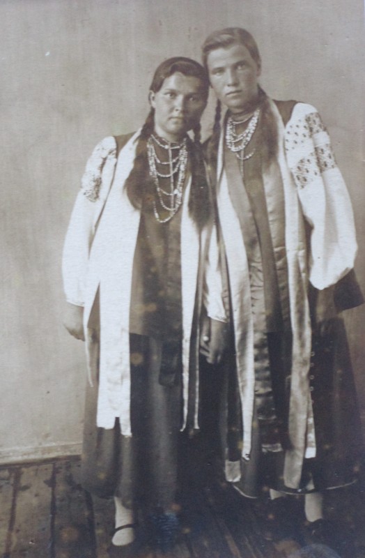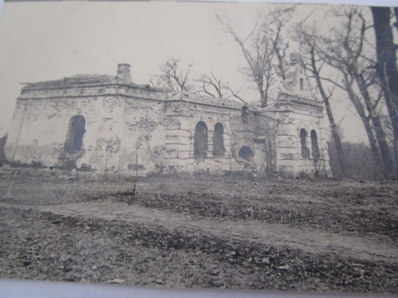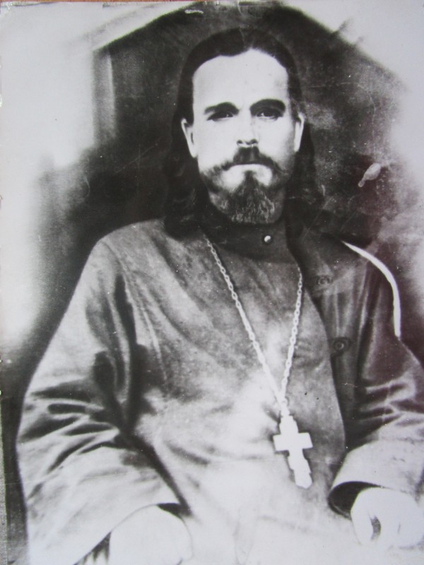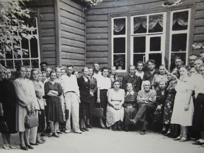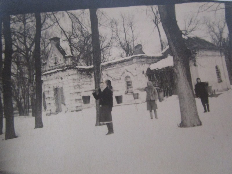 Біля церкви. На фото група людей: церковний хор і прихожани Свято-Преображенської церкви після хресного ходу навколо церкви. По центру протоієрей Чаленко Іван Григорович та протодиякон Прокопенко Іван Федорович одягнені у церковний одяг. На задньому плані дерев'яна церква. м. Бахмач, 50-ті рр. ХХ ст.