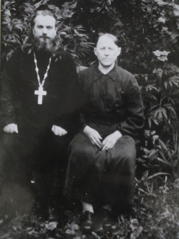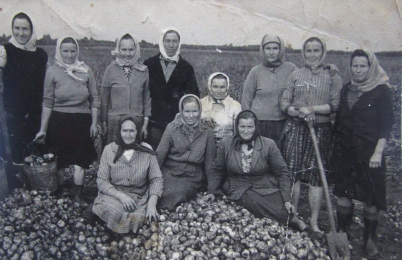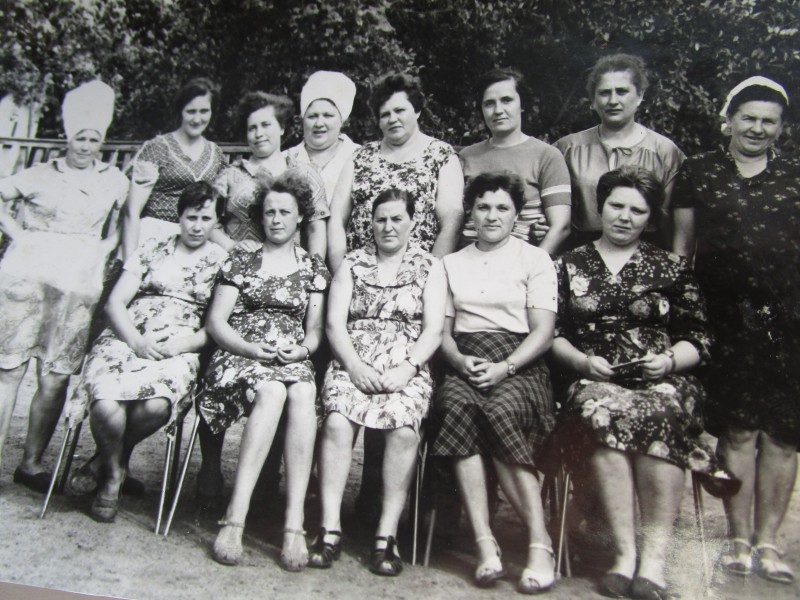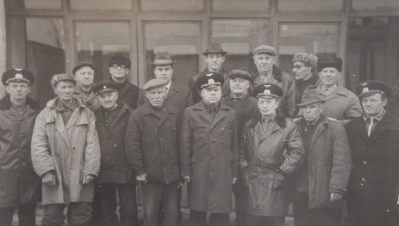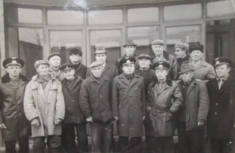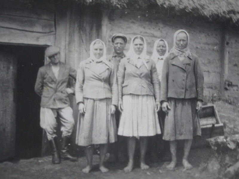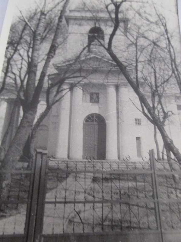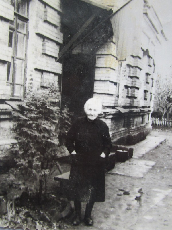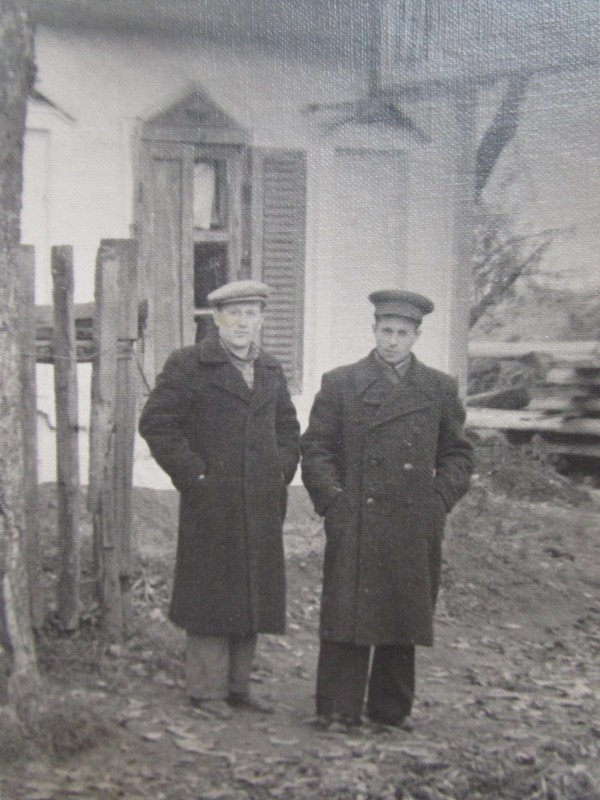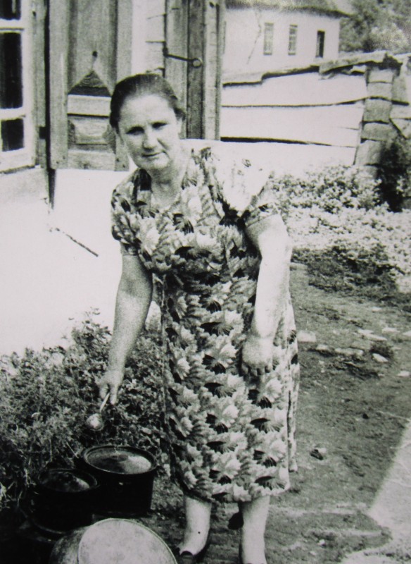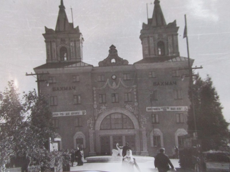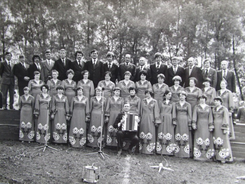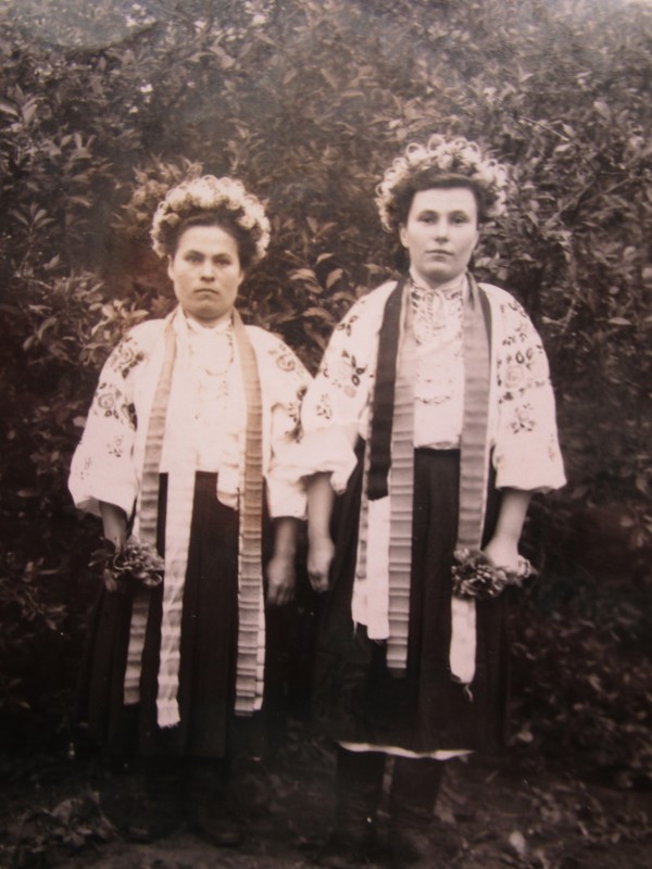 Біля церкви. На фото група людей: церковний хор і прихожани Свято-Преображенської церкви після хресного ходу навколо церкви. По центру протоієрей Чаленко Іван Григорович та протодиякон Прокопенко Іван Федорович одягнені у церковний одяг. На задньому плані дерев'яна церква. м. Бахмач, 50-ті рр. ХХ ст.