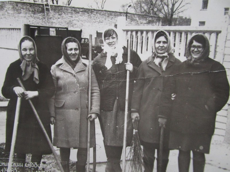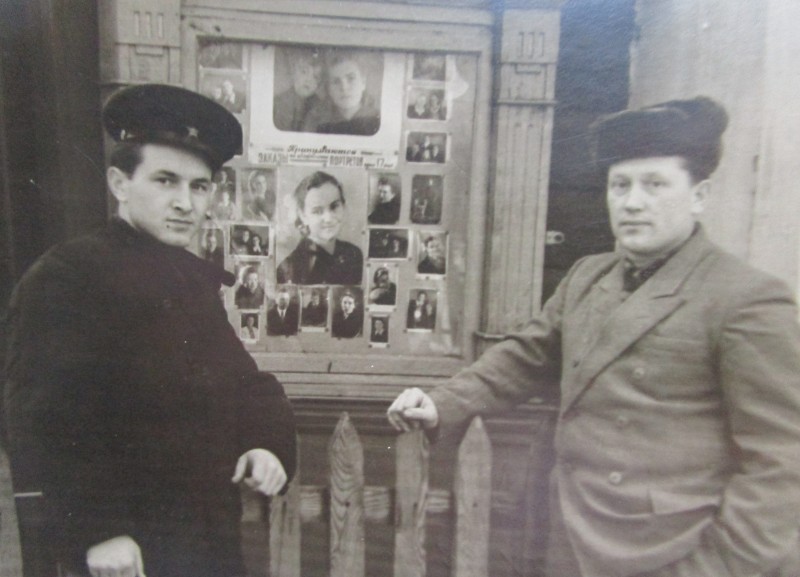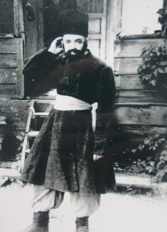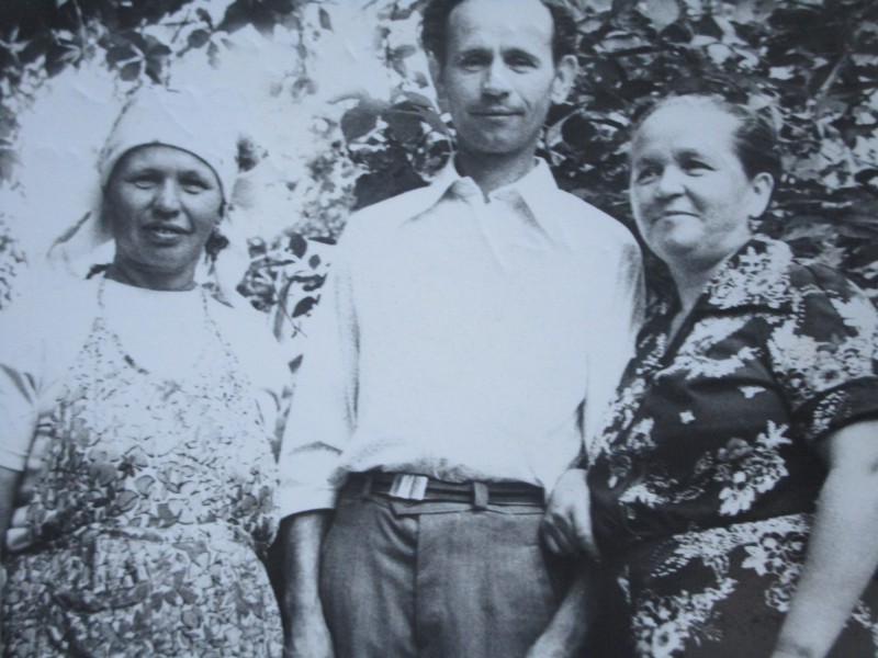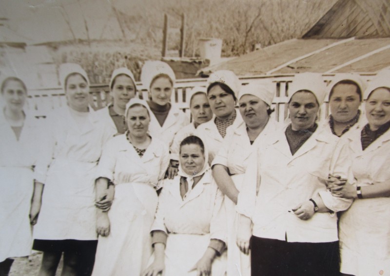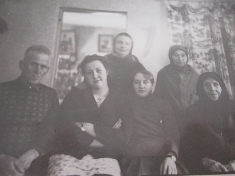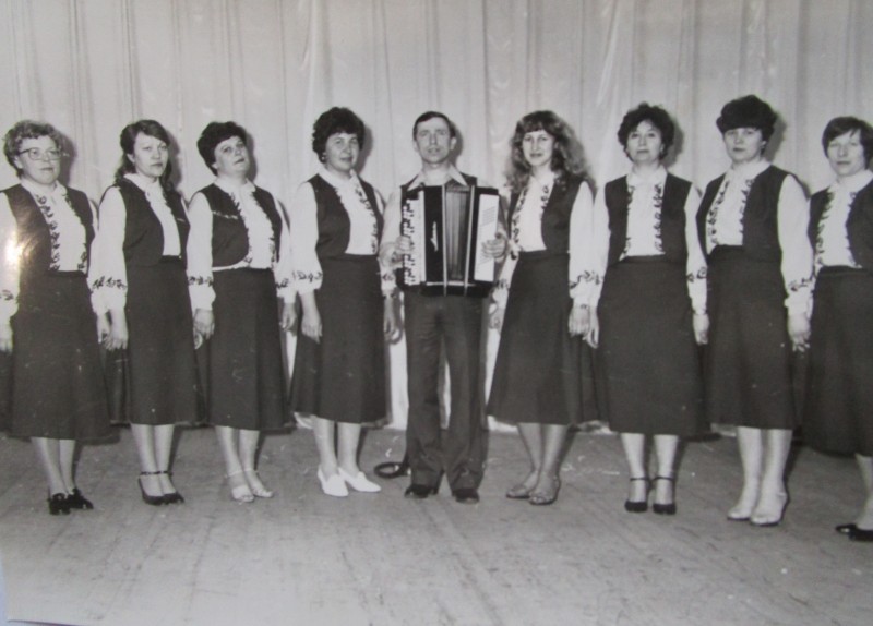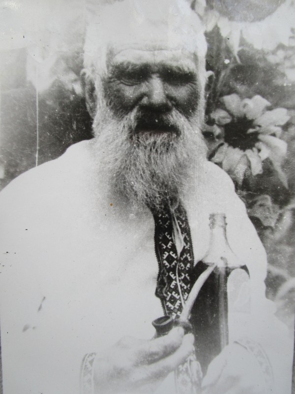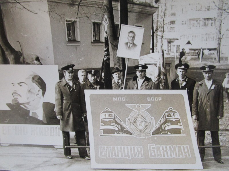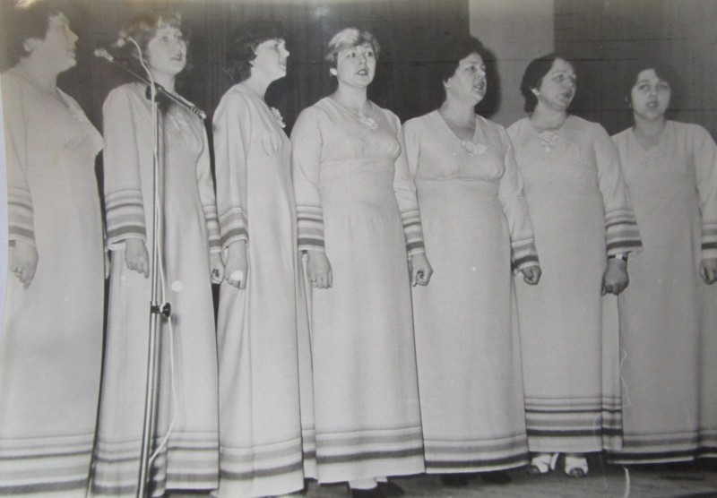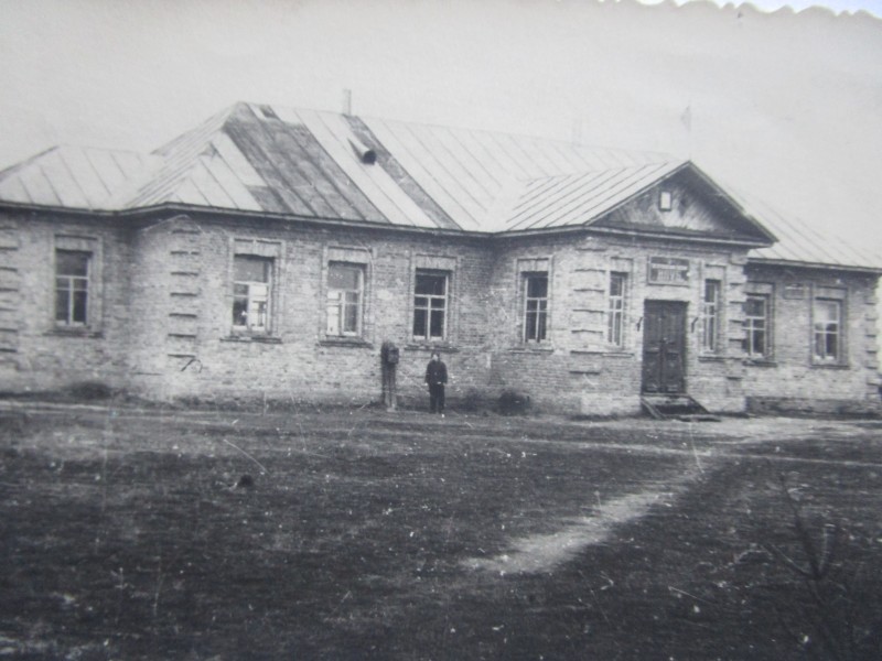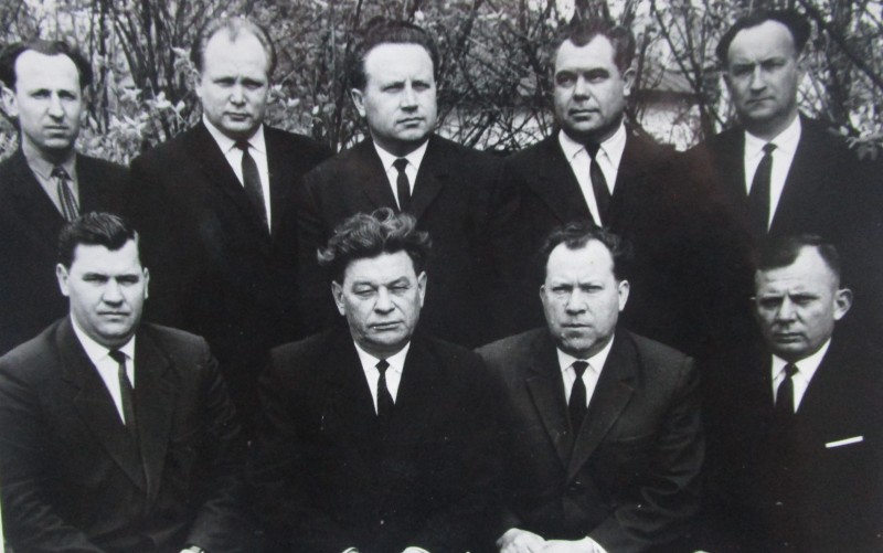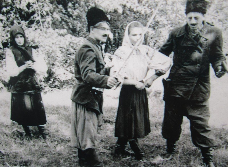 Біля церкви. На фото група людей: церковний хор і прихожани Свято-Преображенської церкви після хресного ходу навколо церкви. По центру протоієрей Чаленко Іван Григорович та протодиякон Прокопенко Іван Федорович одягнені у церковний одяг. На задньому плані дерев'яна церква. м. Бахмач, 50-ті рр. ХХ ст.