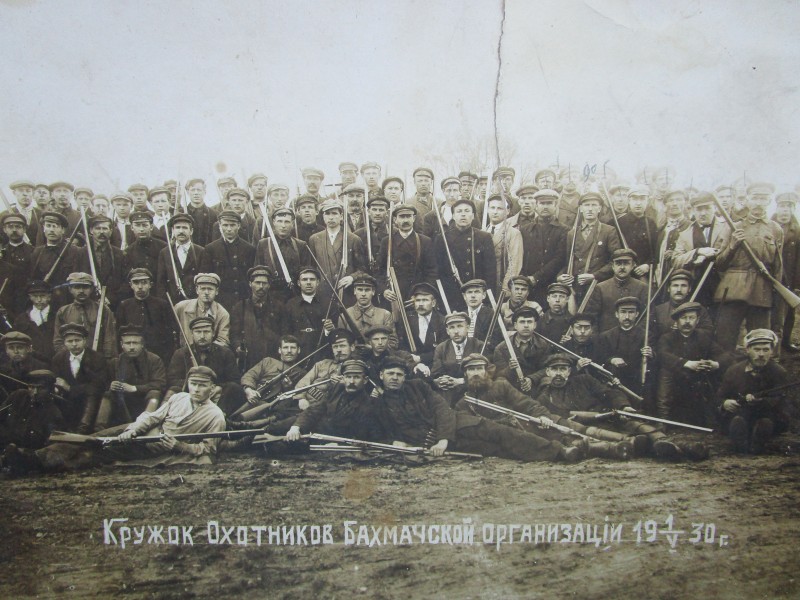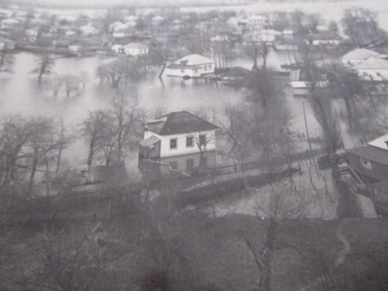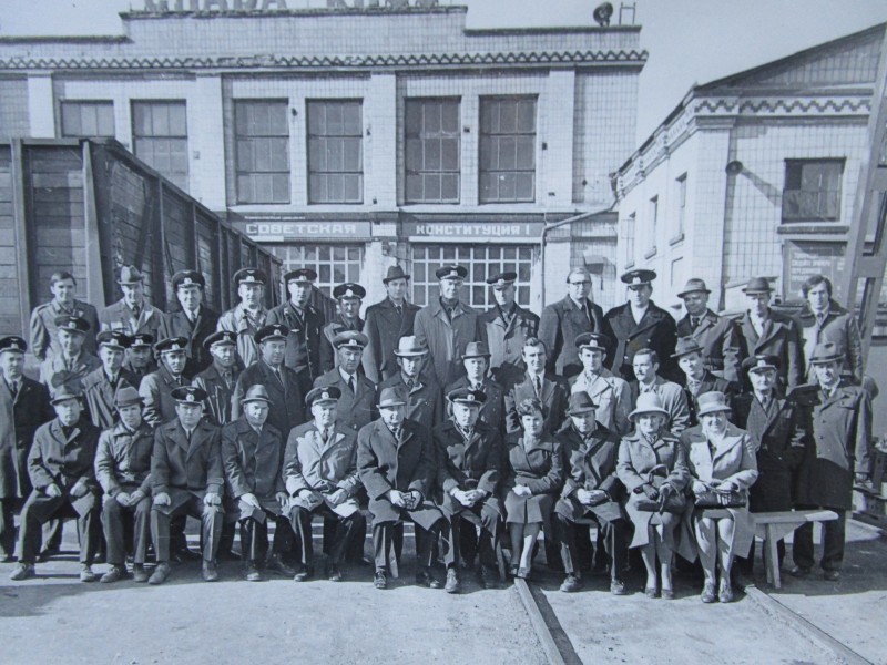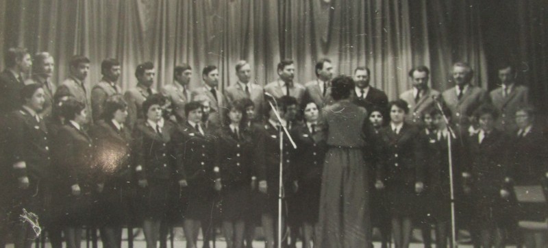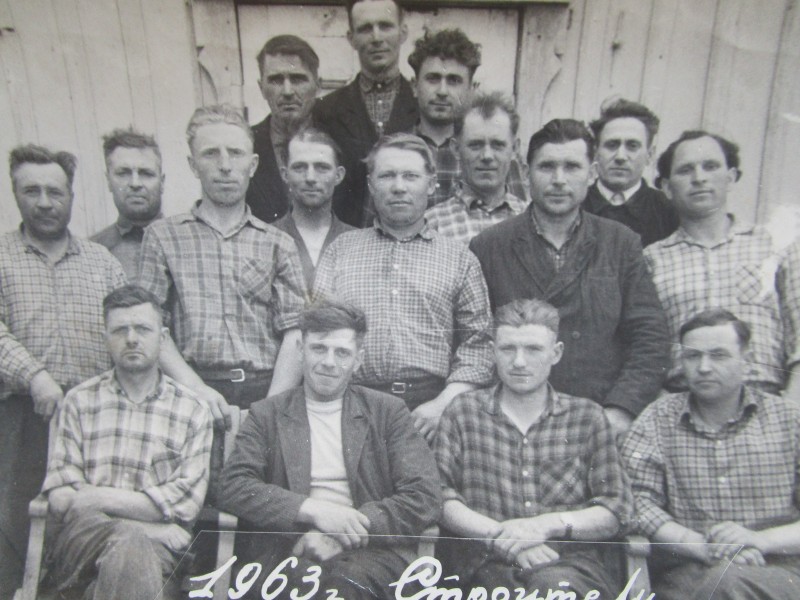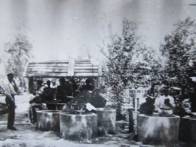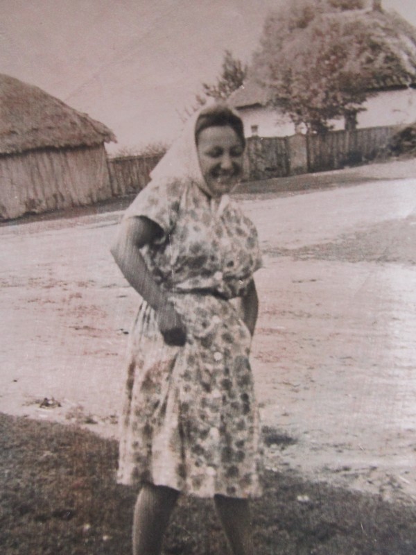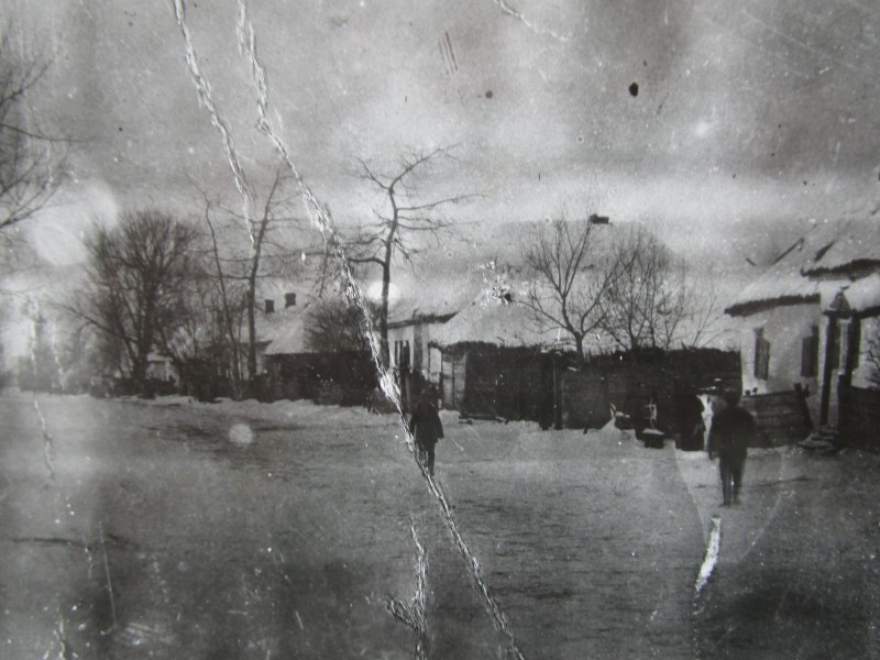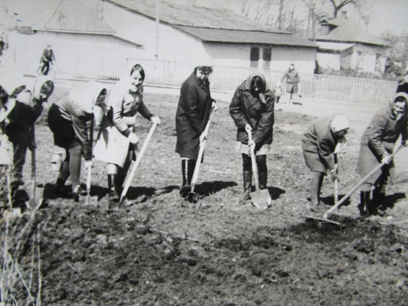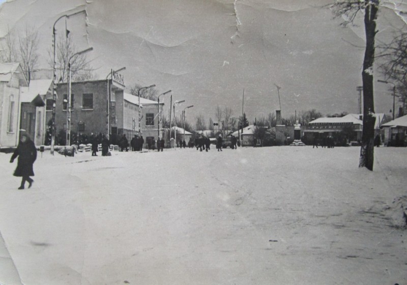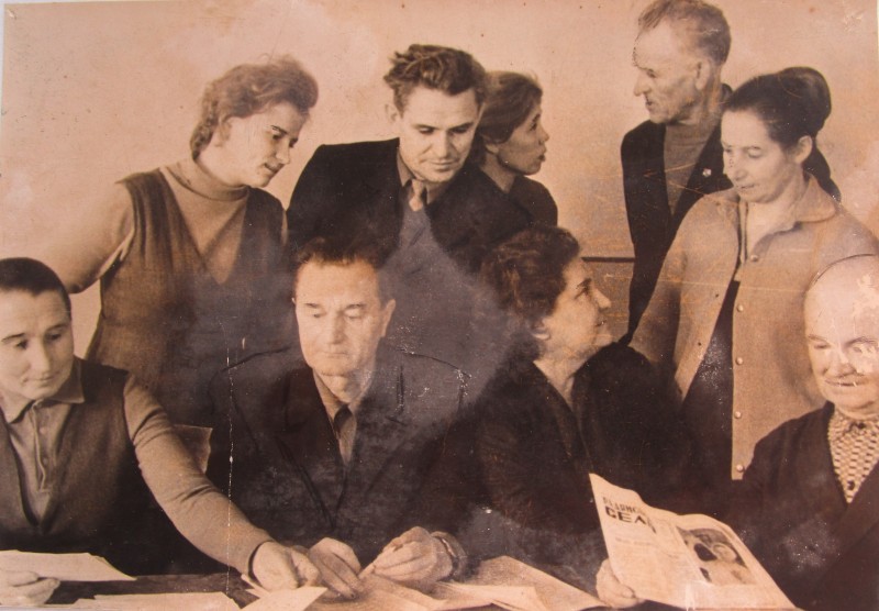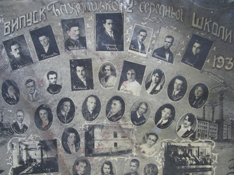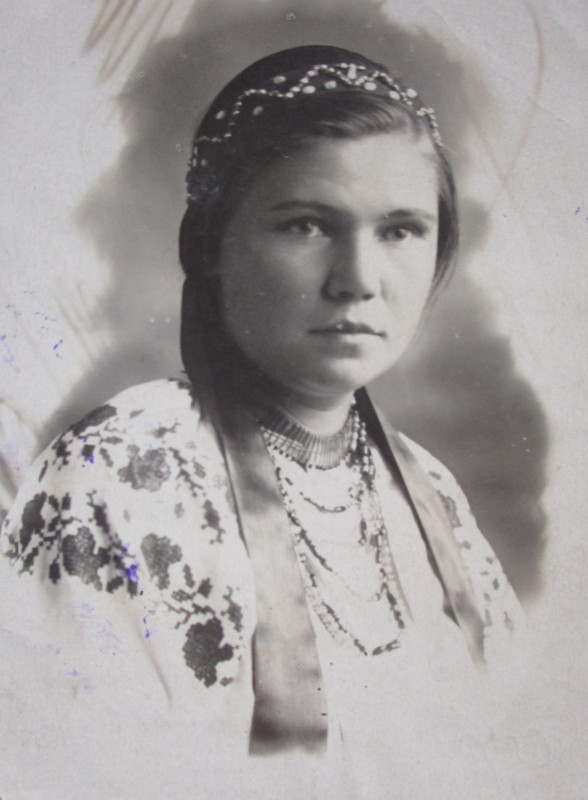 Біля церкви. На фото група людей: церковний хор і прихожани Свято-Преображенської церкви після хресного ходу навколо церкви. По центру протоієрей Чаленко Іван Григорович та протодиякон Прокопенко Іван Федорович одягнені у церковний одяг. На задньому плані дерев'яна церква. м. Бахмач, 50-ті рр. ХХ ст.