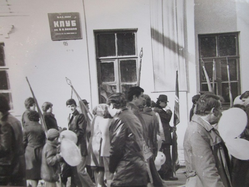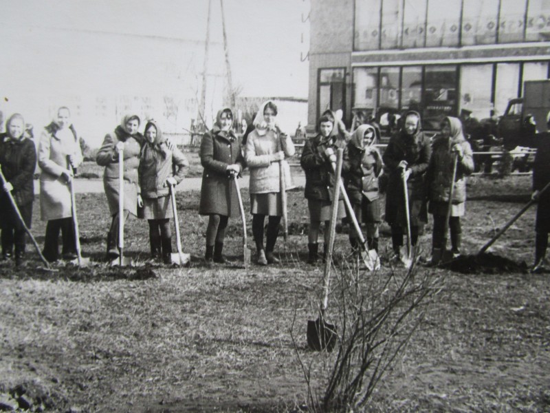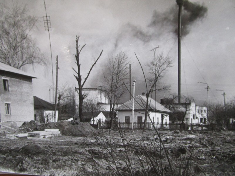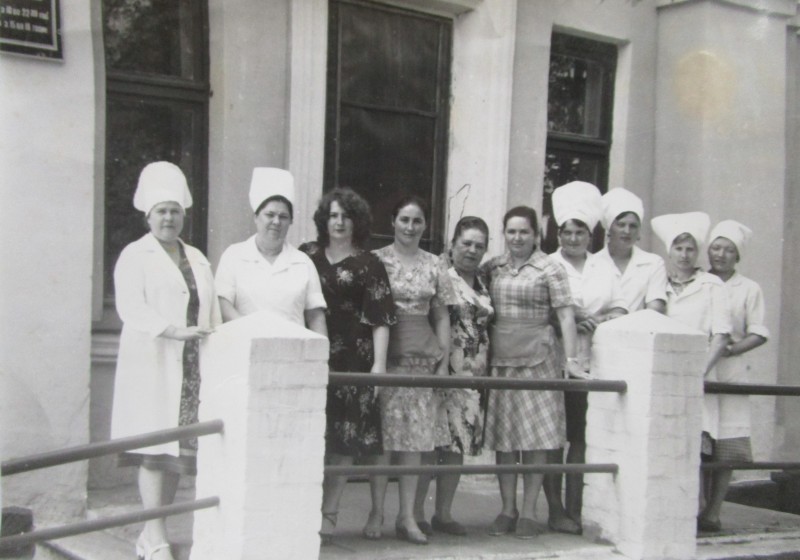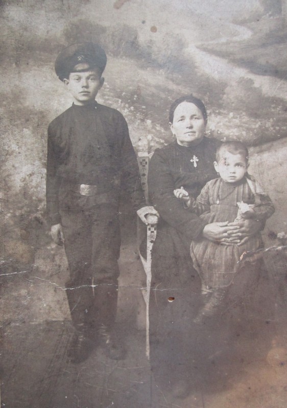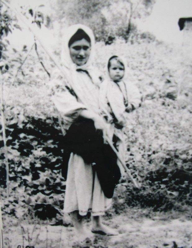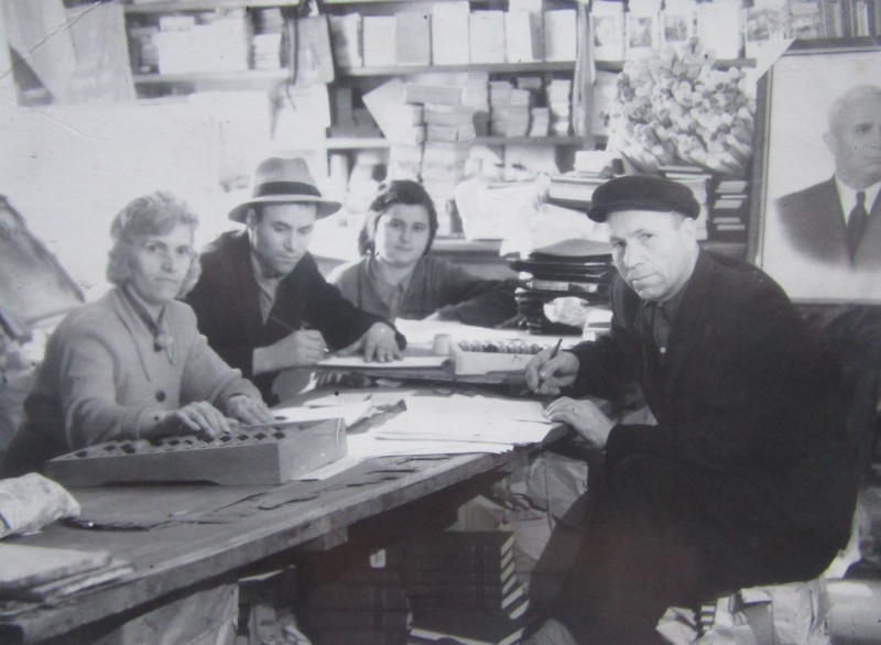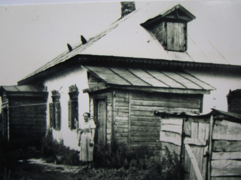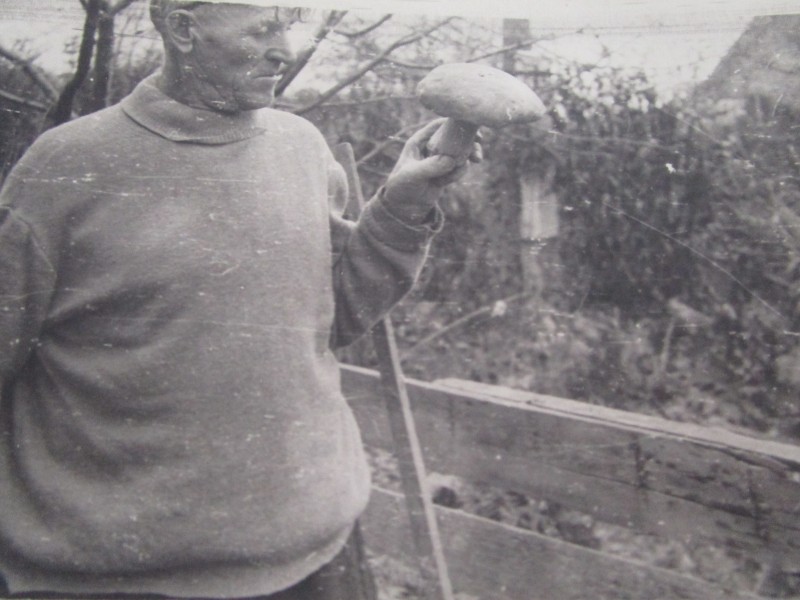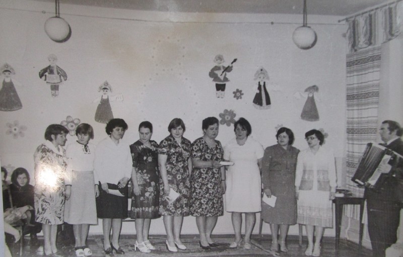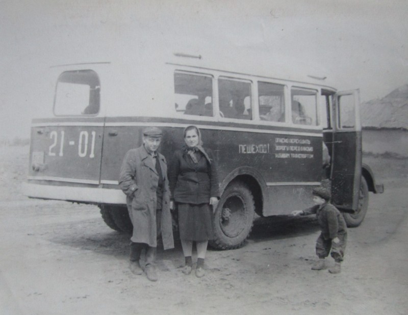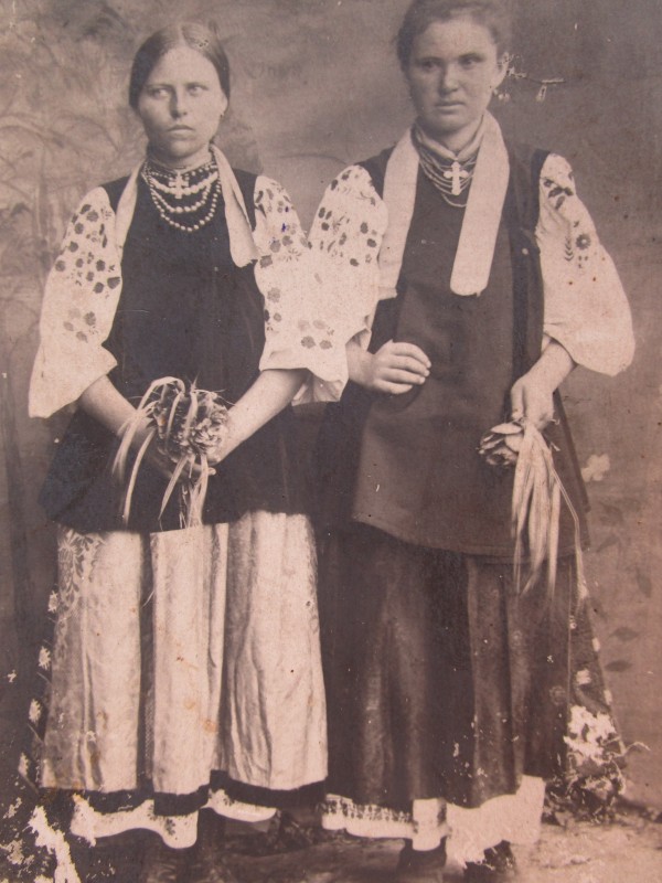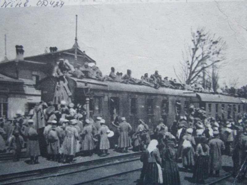 Біля церкви. На фото група людей: церковний хор і прихожани Свято-Преображенської церкви після хресного ходу навколо церкви. По центру протоієрей Чаленко Іван Григорович та протодиякон Прокопенко Іван Федорович одягнені у церковний одяг. На задньому плані дерев'яна церква. м. Бахмач, 50-ті рр. ХХ ст.