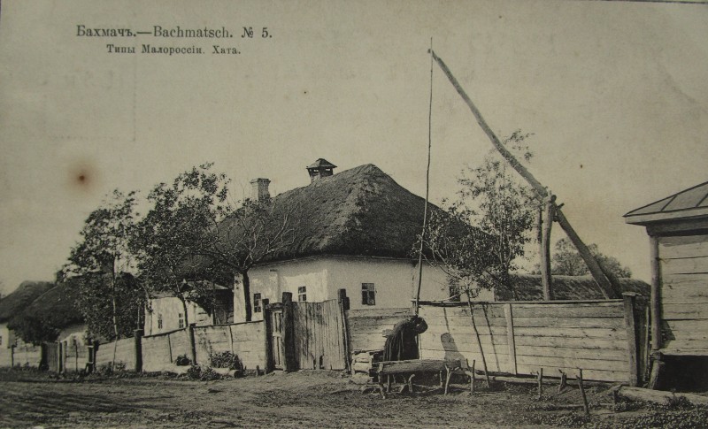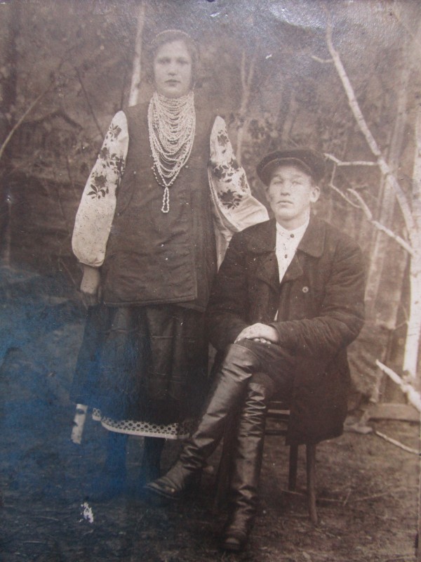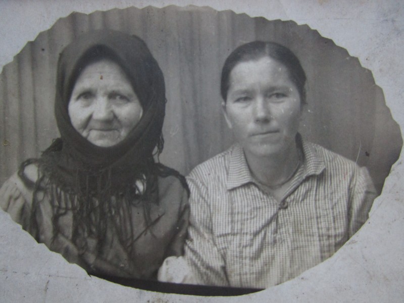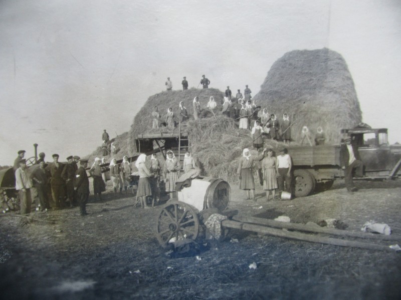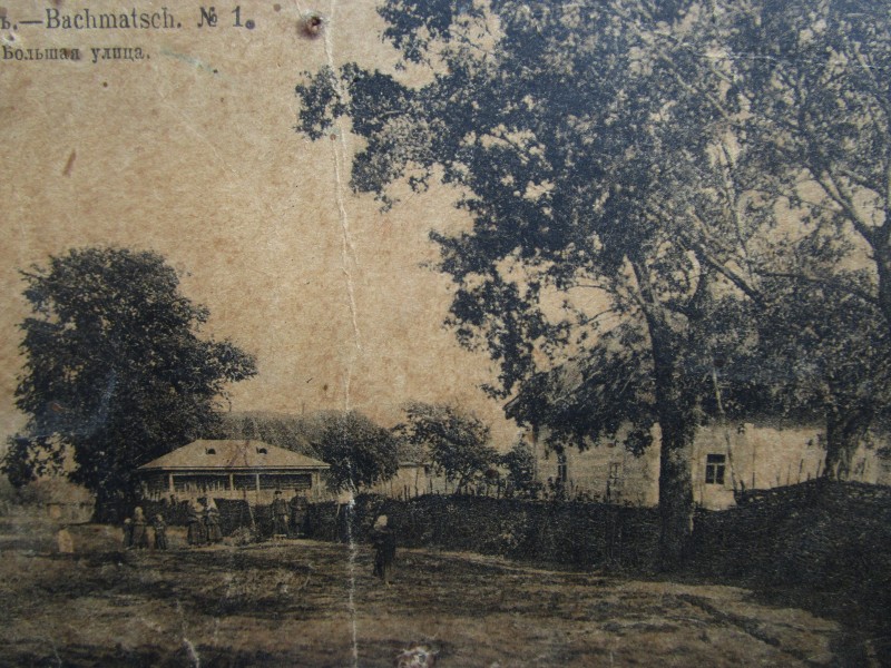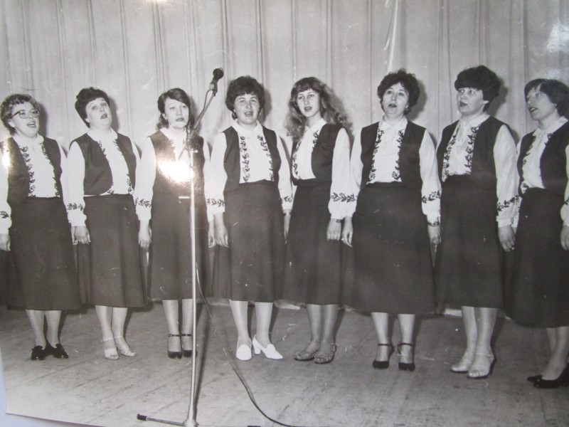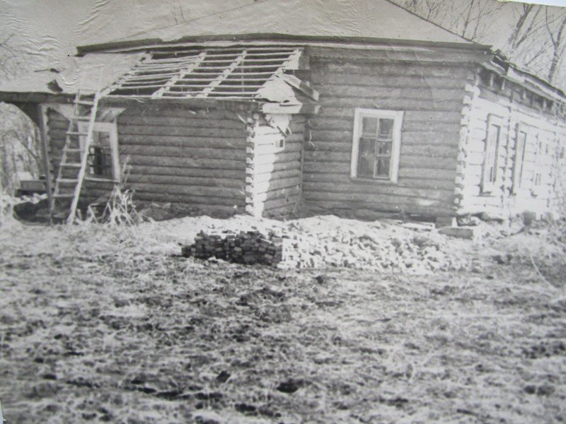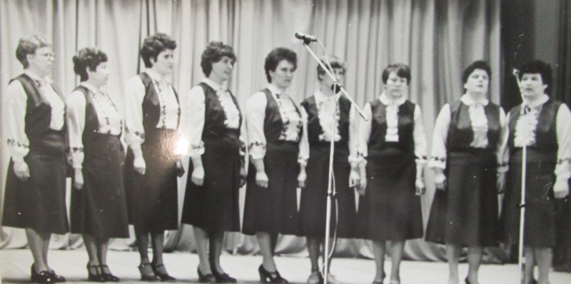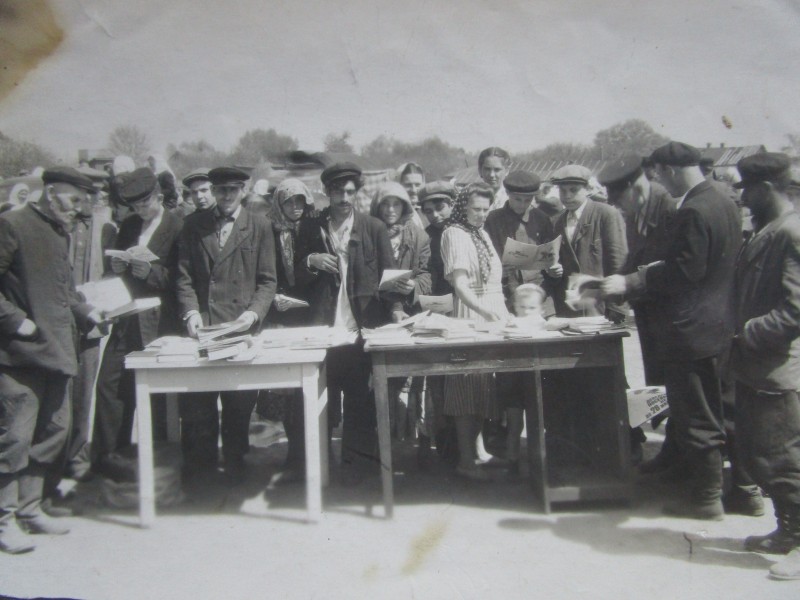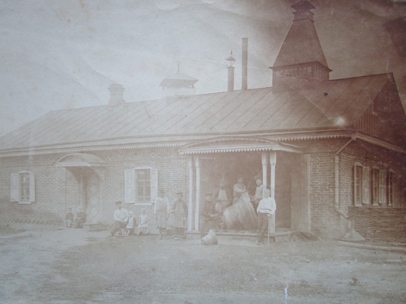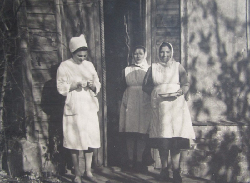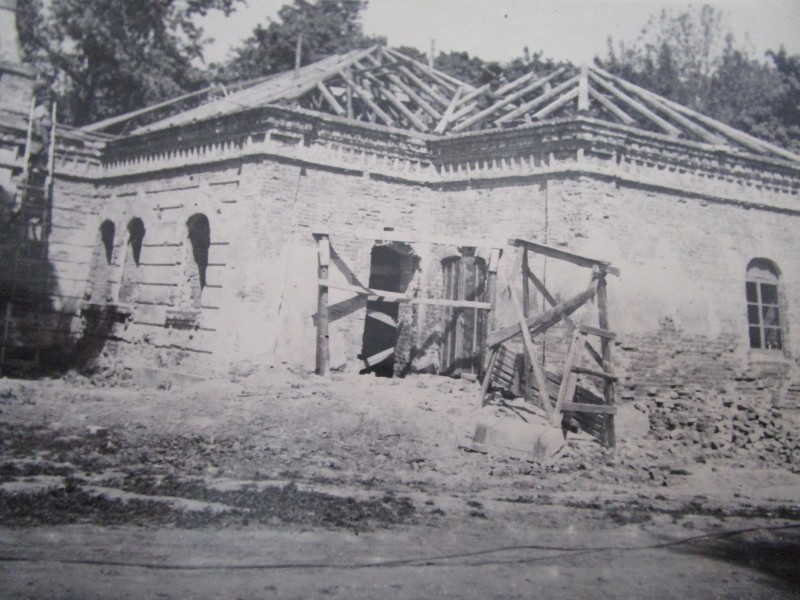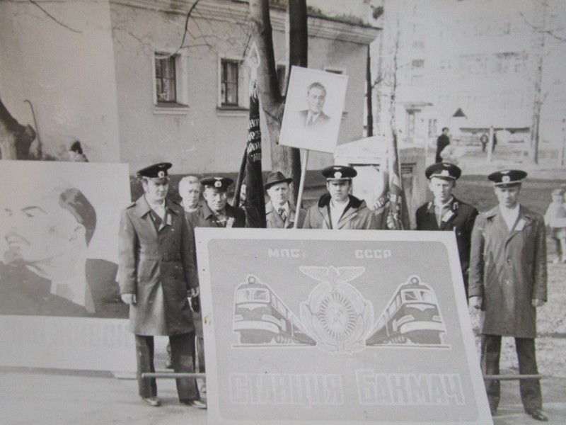 Біля церкви. На фото група людей: церковний хор і прихожани Свято-Преображенської церкви після хресного ходу навколо церкви. По центру протоієрей Чаленко Іван Григорович та протодиякон Прокопенко Іван Федорович одягнені у церковний одяг. На задньому плані дерев'яна церква. м. Бахмач, 50-ті рр. ХХ ст.