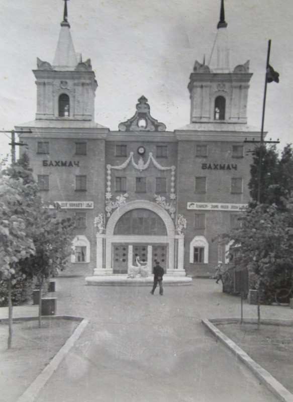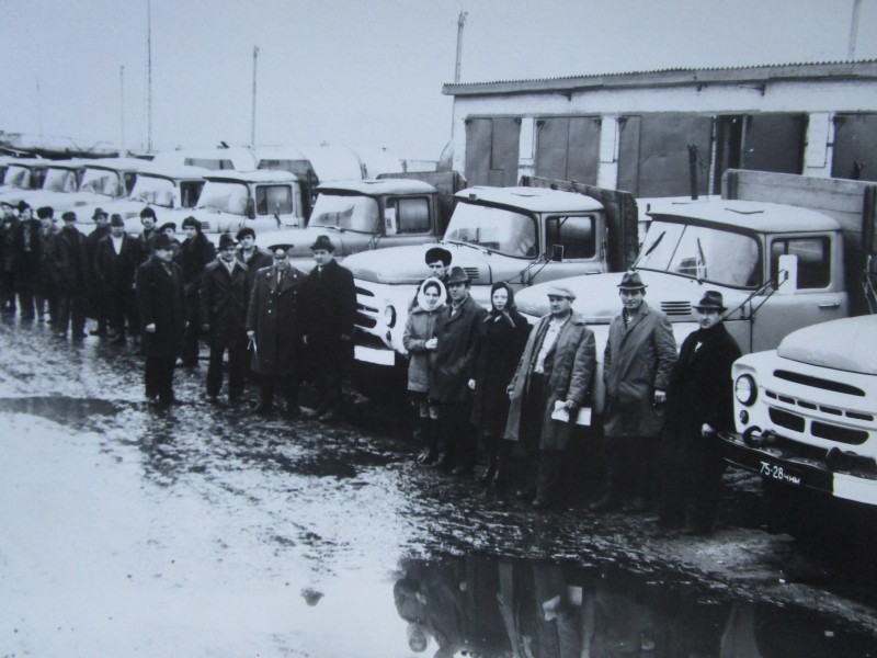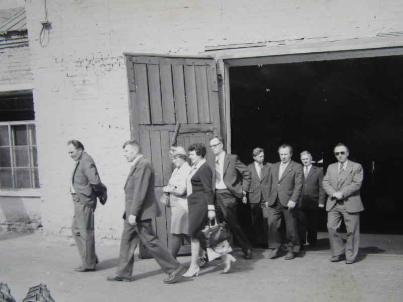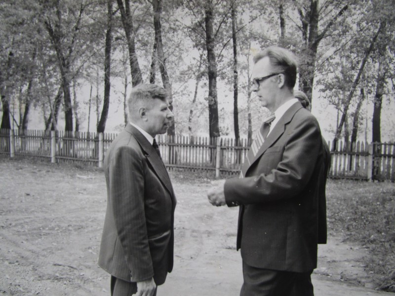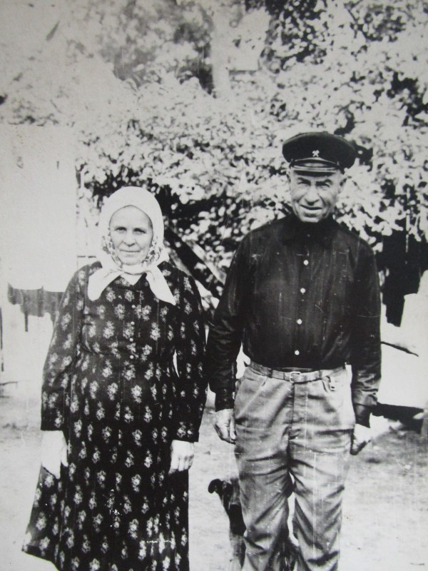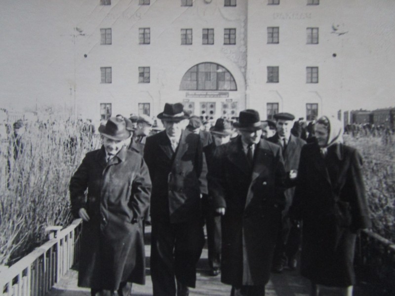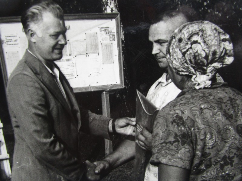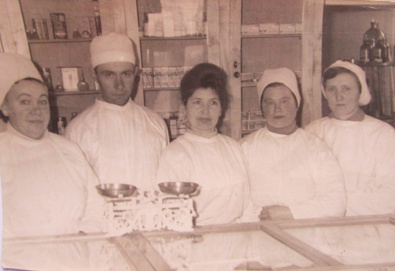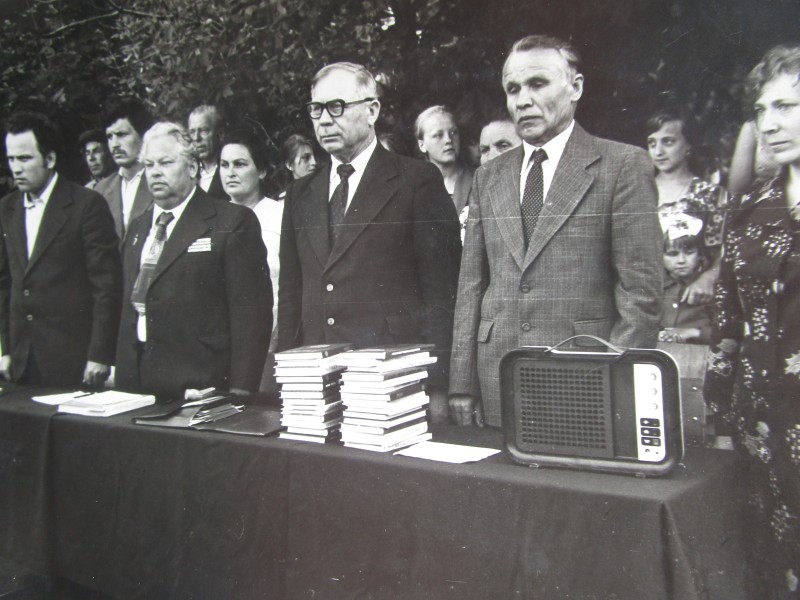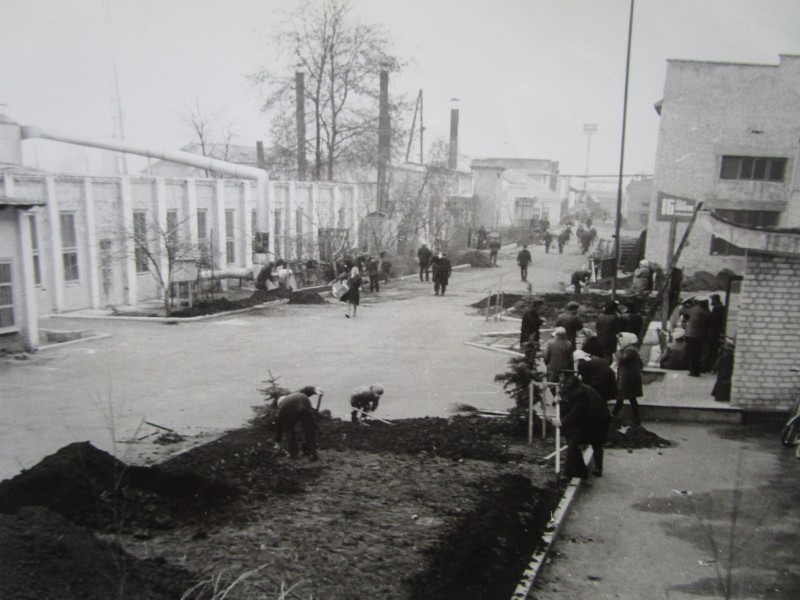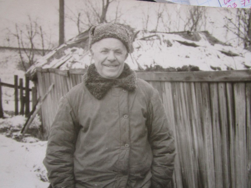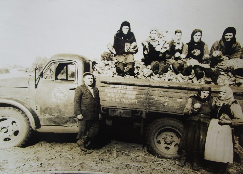 Біля церкви. На фото група людей: церковний хор і прихожани Свято-Преображенської церкви після хресного ходу навколо церкви. По центру протоієрей Чаленко Іван Григорович та протодиякон Прокопенко Іван Федорович одягнені у церковний одяг. На задньому плані дерев'яна церква. м. Бахмач, 50-ті рр. ХХ ст.