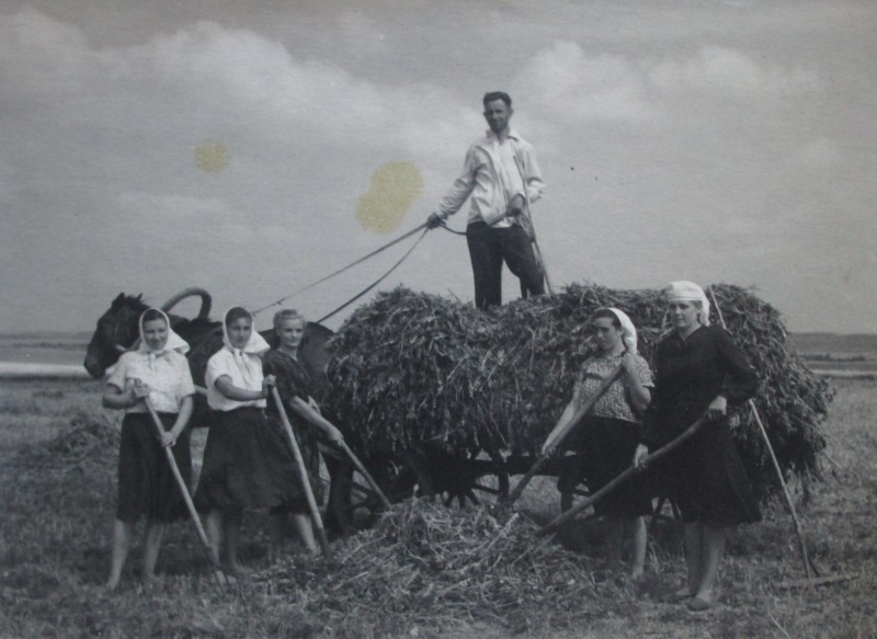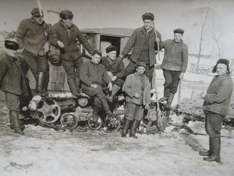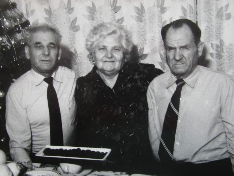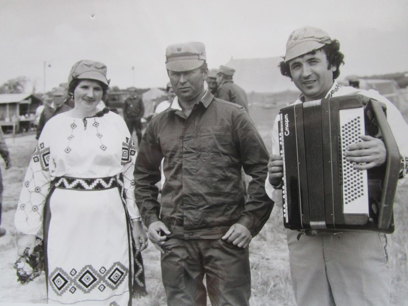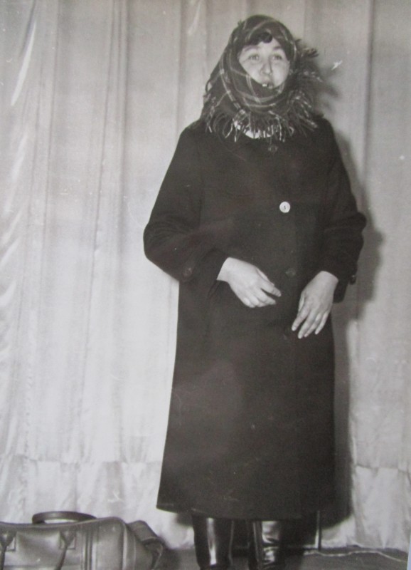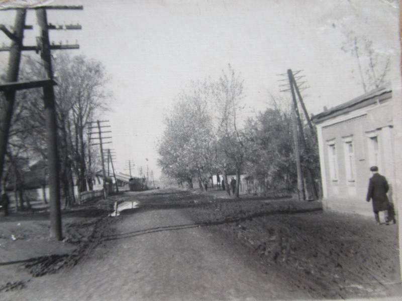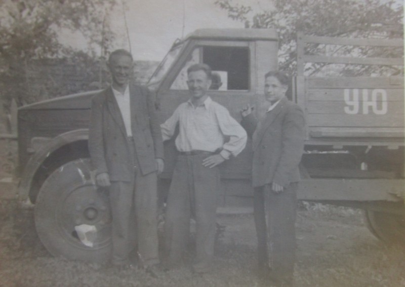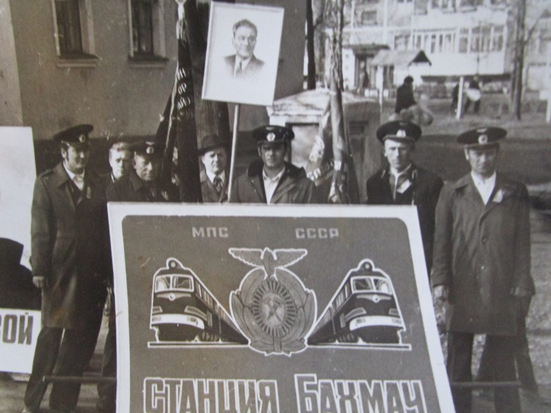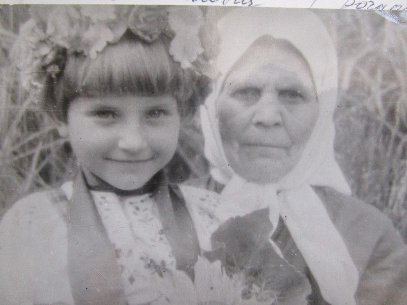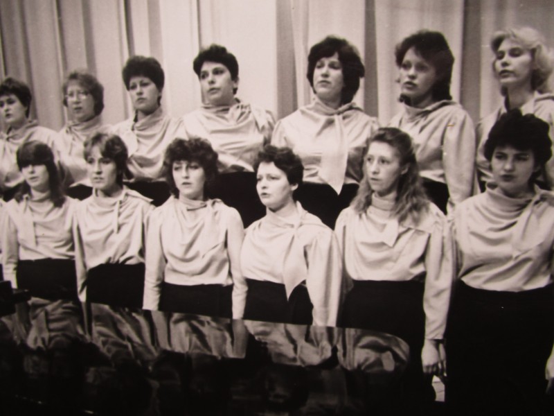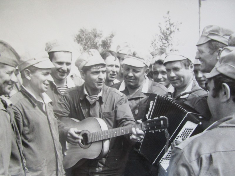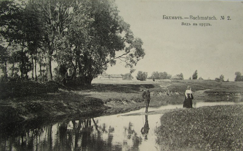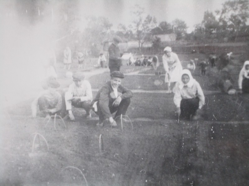 Біля церкви. На фото група людей: церковний хор і прихожани Свято-Преображенської церкви після хресного ходу навколо церкви. По центру протоієрей Чаленко Іван Григорович та протодиякон Прокопенко Іван Федорович одягнені у церковний одяг. На задньому плані дерев'яна церква. м. Бахмач, 50-ті рр. ХХ ст.