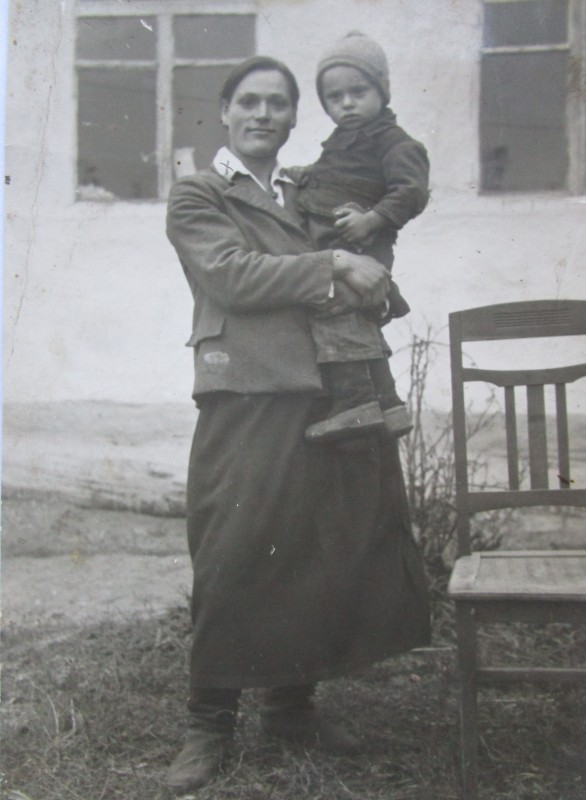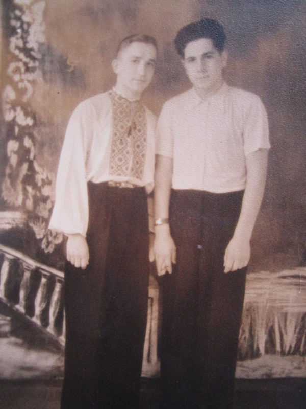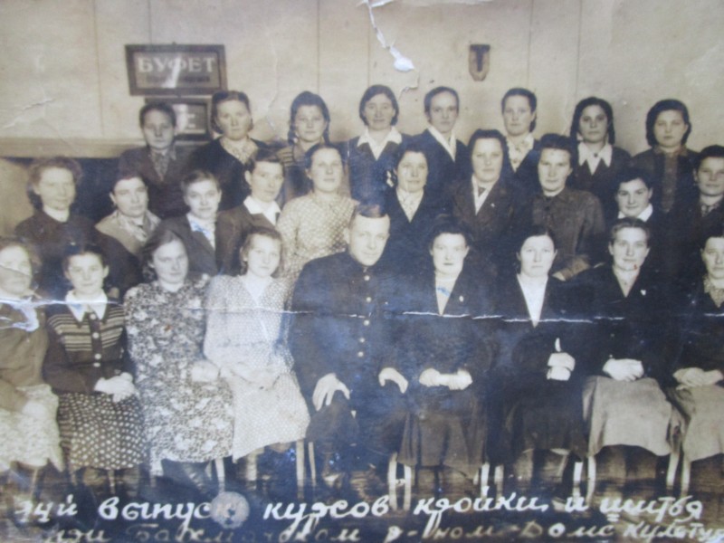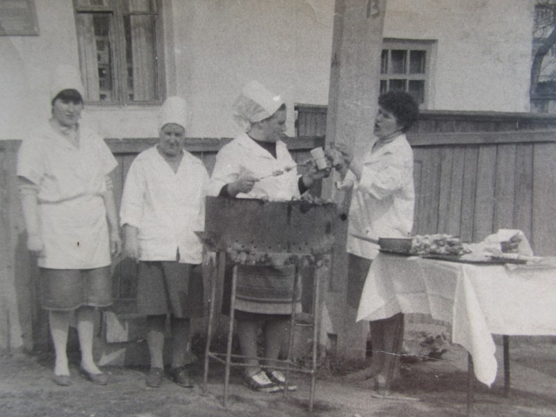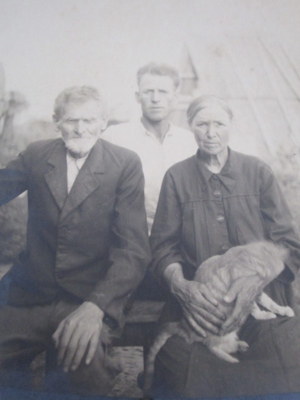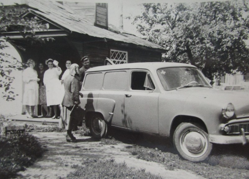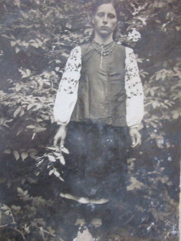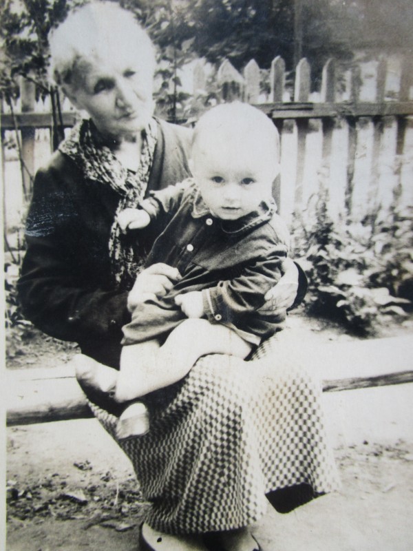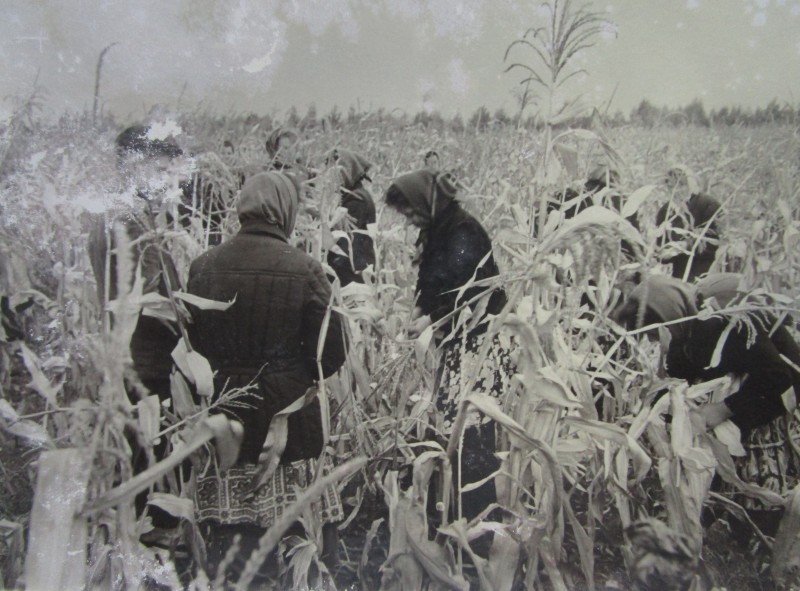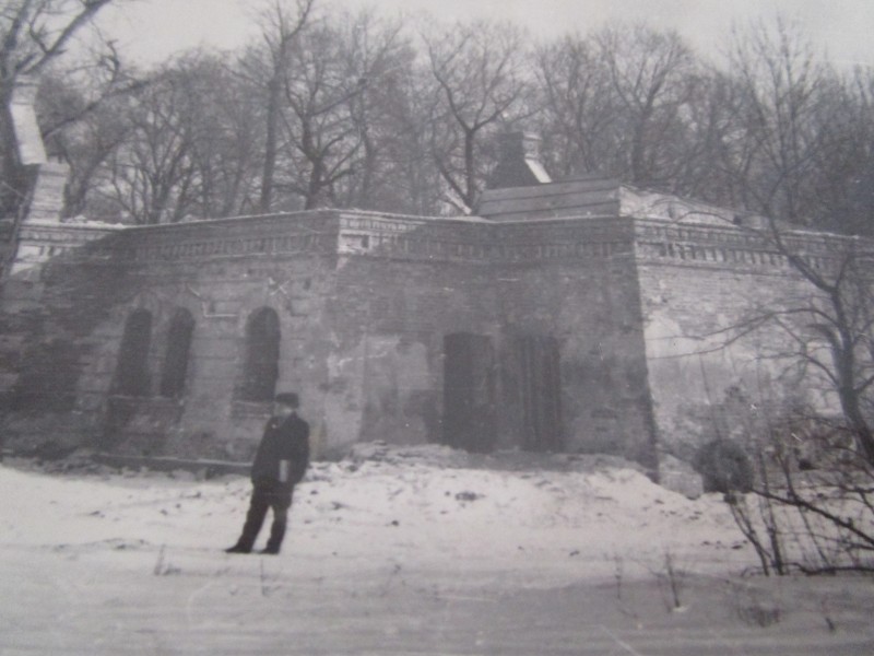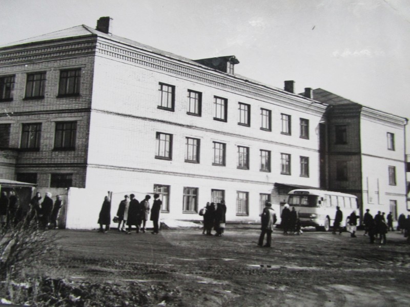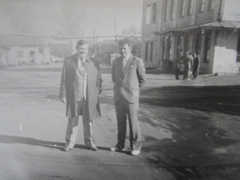Біля церкви. На фото група людей: церковний хор і прихожани Свято-Преображенської церкви після хресного ходу навколо церкви. По центру протоієрей Чаленко Іван Григорович та протодиякон Прокопенко Іван Федорович одягнені у церковний одяг. На задньому плані дерев'яна церква. м. Бахмач, 50-ті рр. ХХ ст.