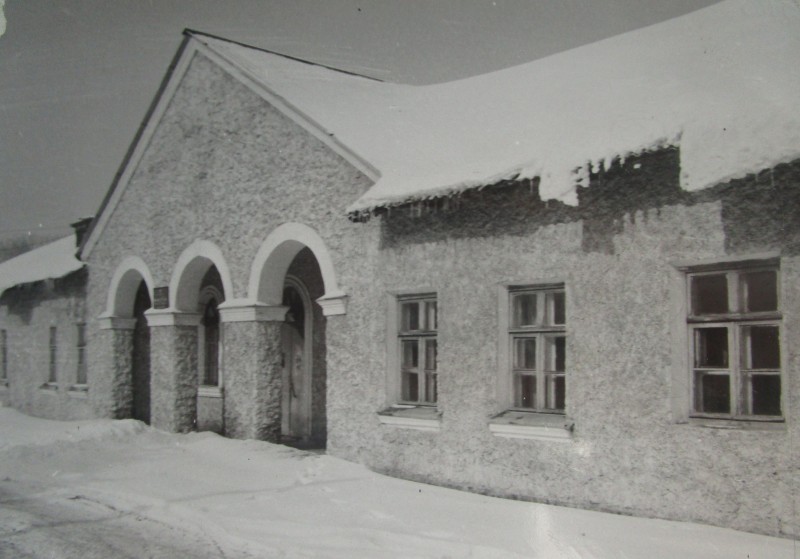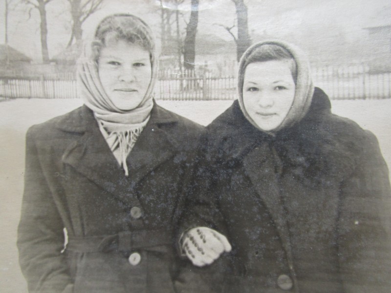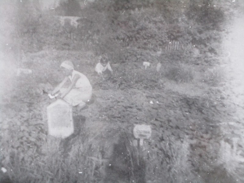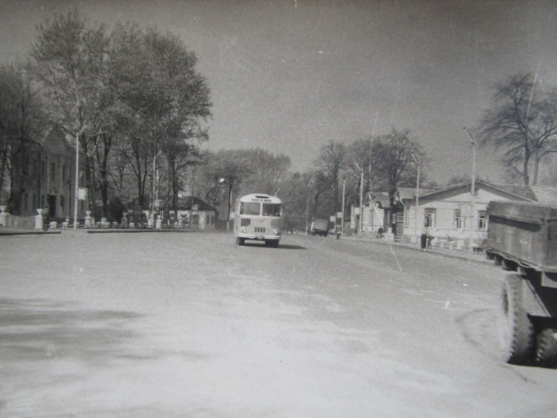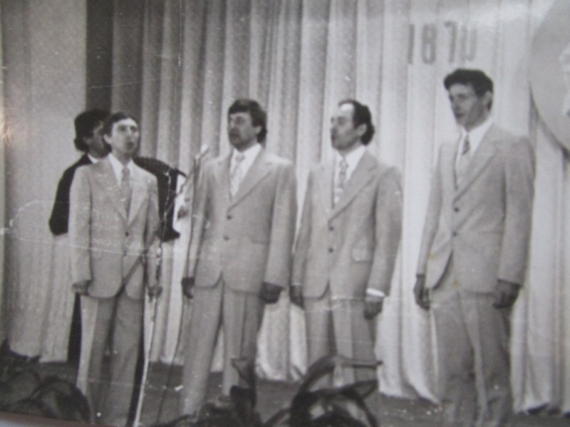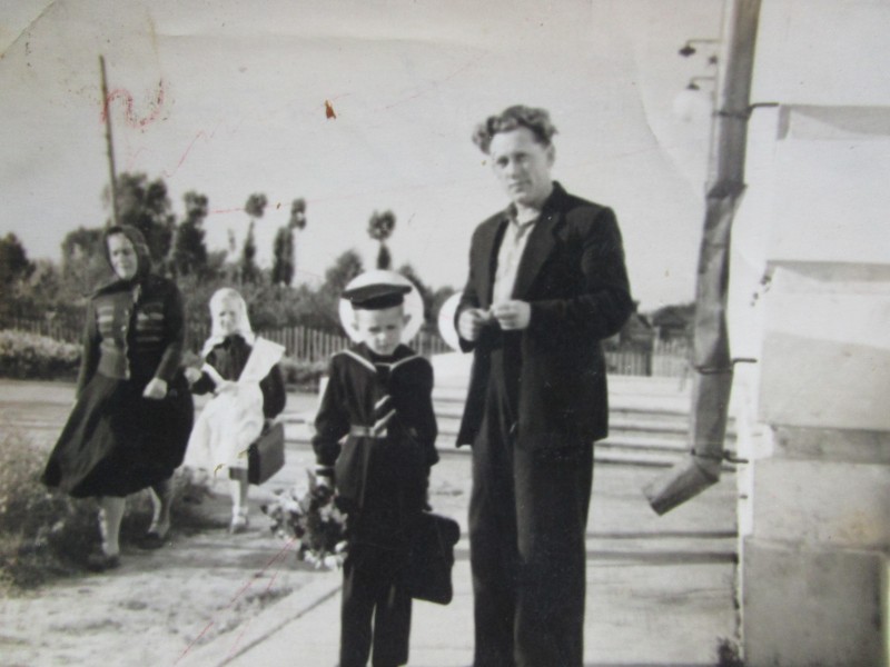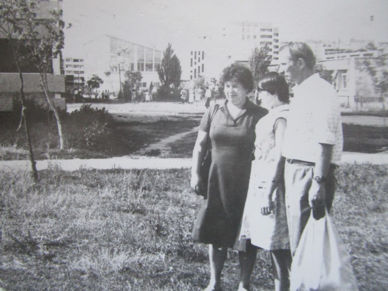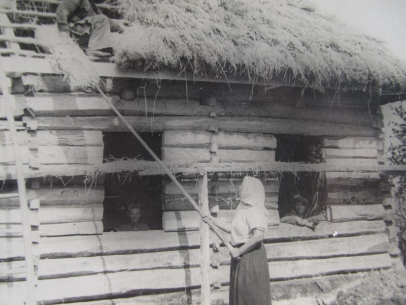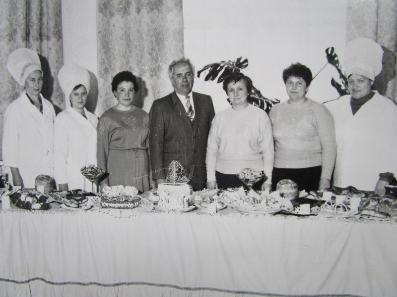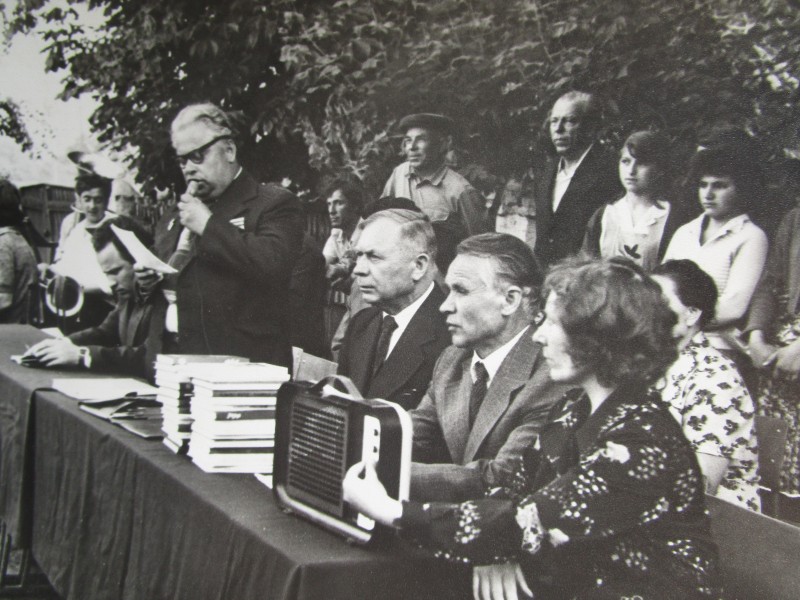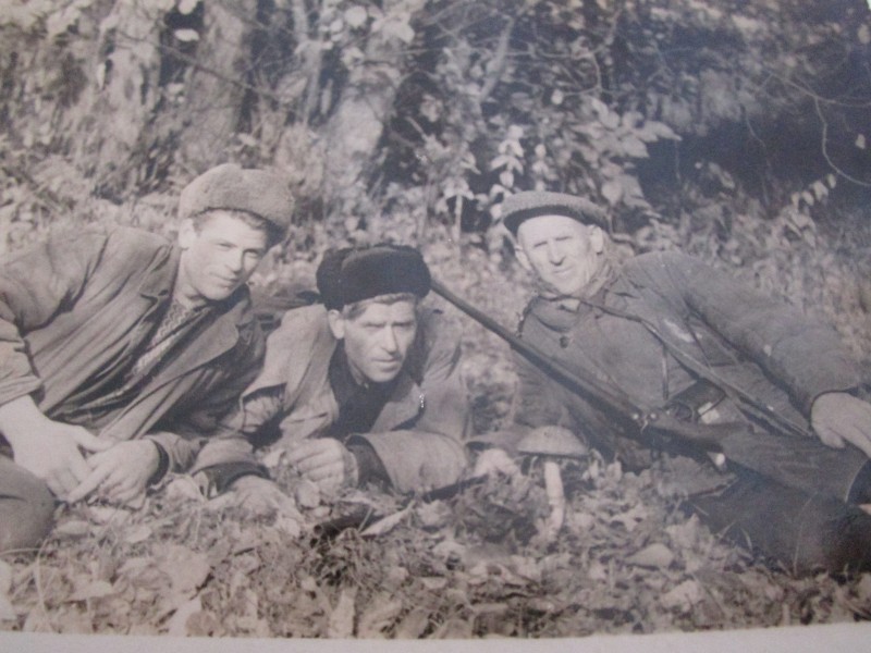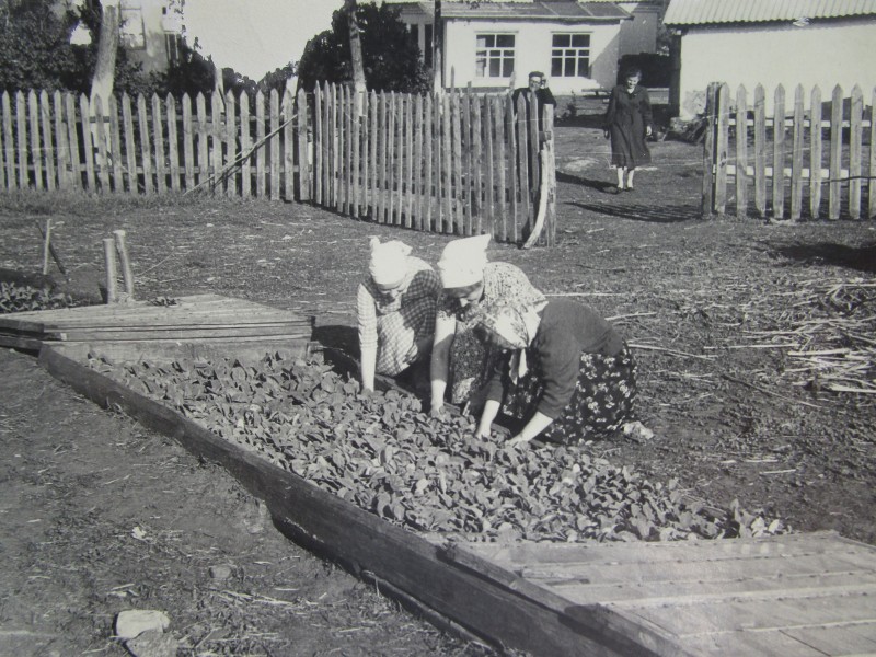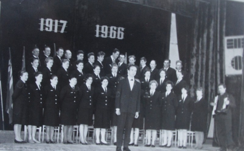 Біля церкви. На фото група людей: церковний хор і прихожани Свято-Преображенської церкви після хресного ходу навколо церкви. По центру протоієрей Чаленко Іван Григорович та протодиякон Прокопенко Іван Федорович одягнені у церковний одяг. На задньому плані дерев'яна церква. м. Бахмач, 50-ті рр. ХХ ст.