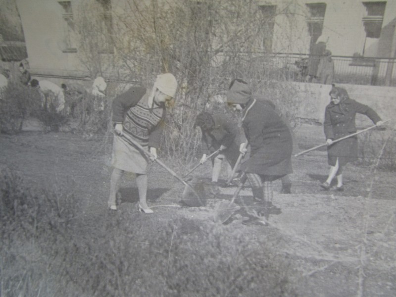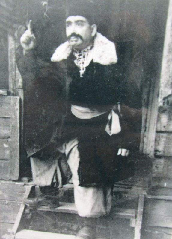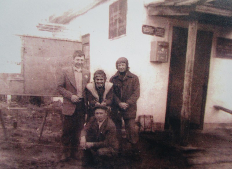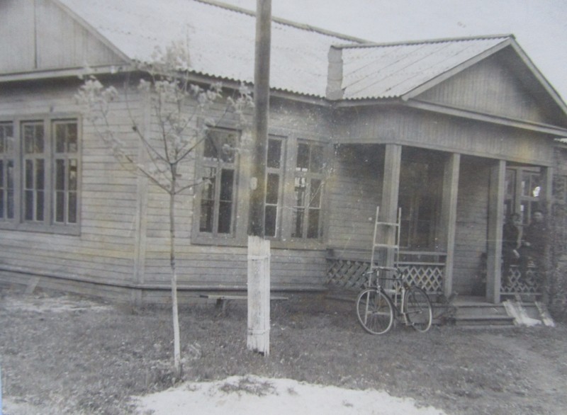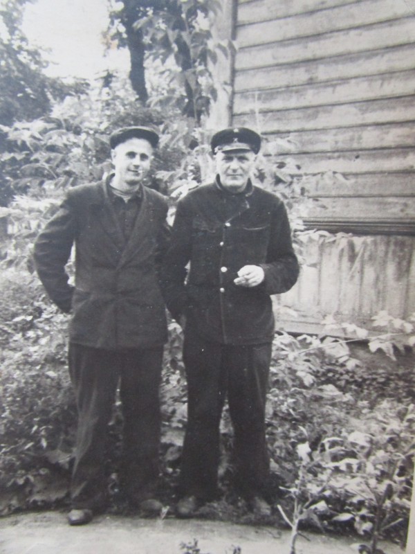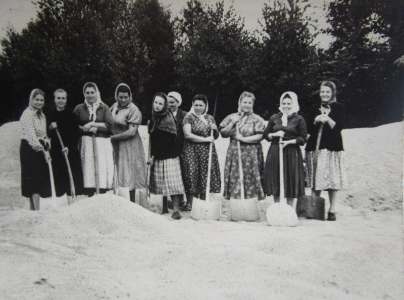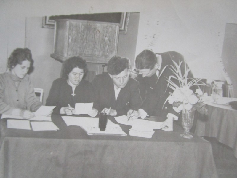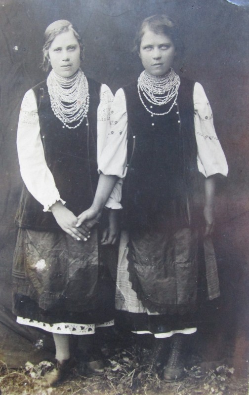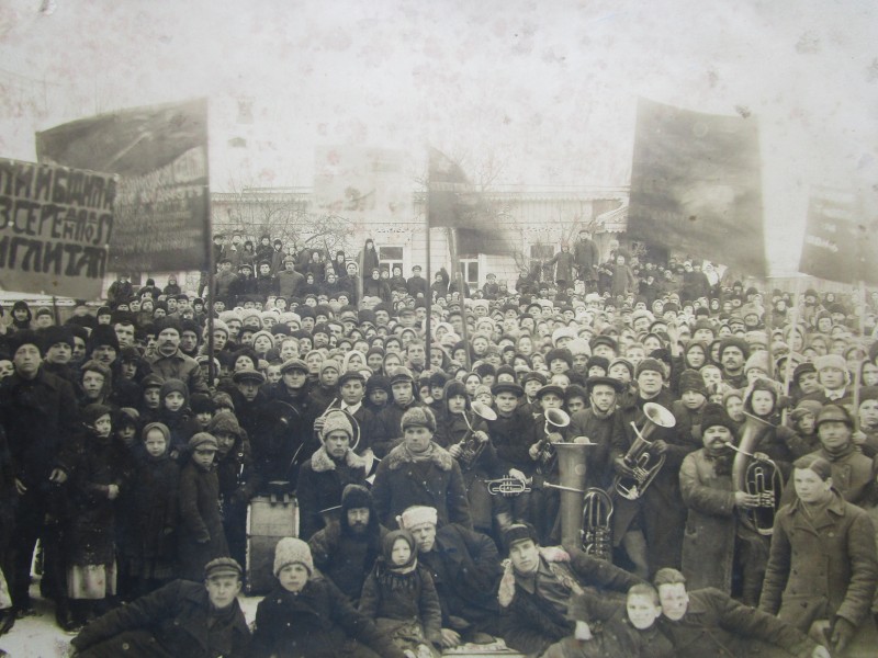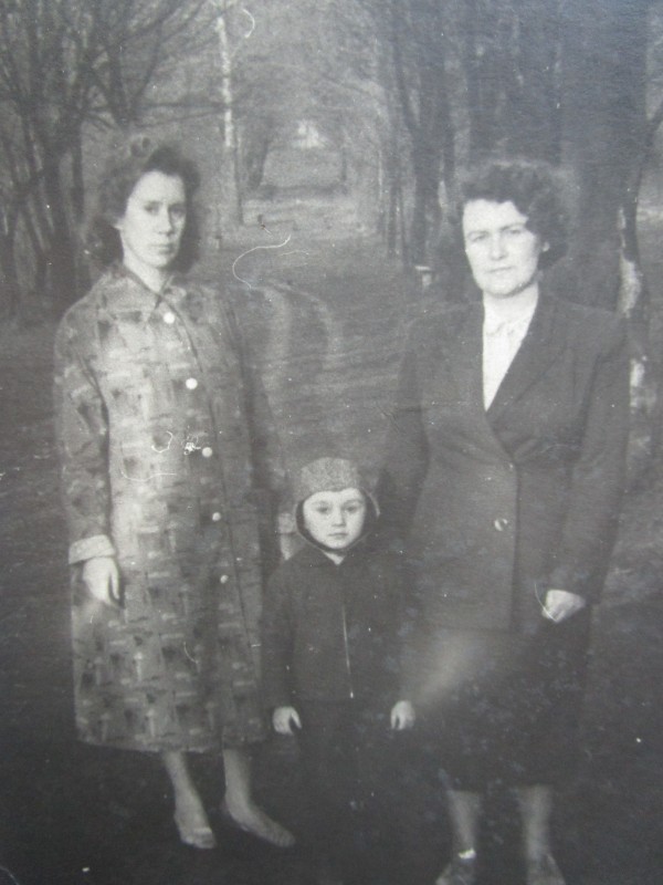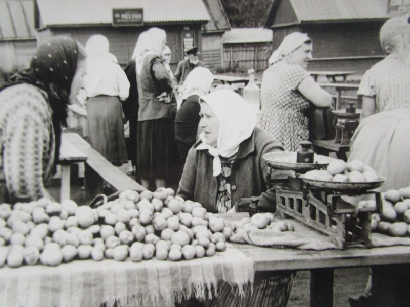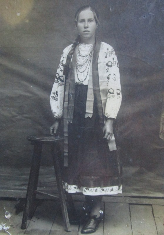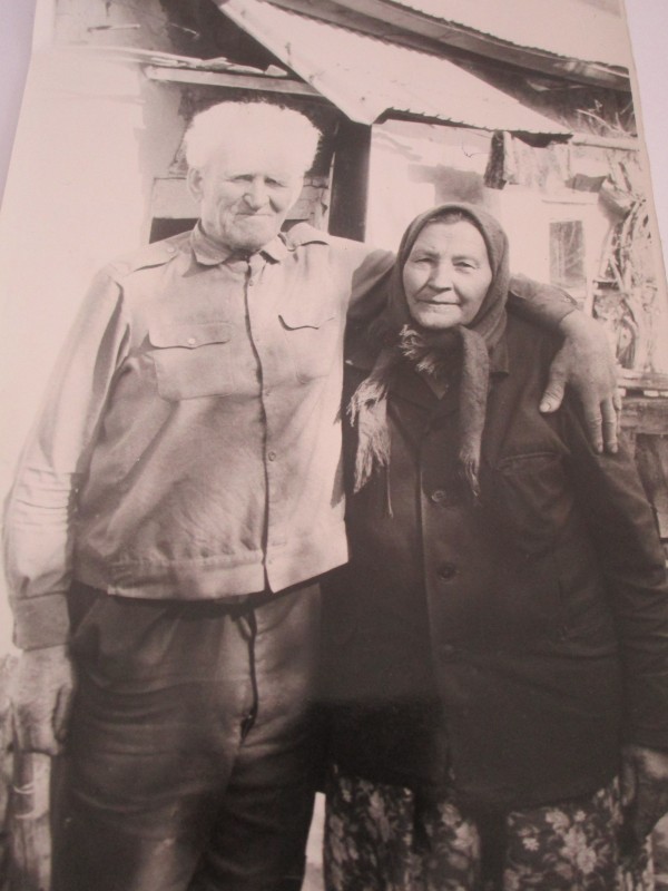 Біля церкви. На фото група людей: церковний хор і прихожани Свято-Преображенської церкви після хресного ходу навколо церкви. По центру протоієрей Чаленко Іван Григорович та протодиякон Прокопенко Іван Федорович одягнені у церковний одяг. На задньому плані дерев'яна церква. м. Бахмач, 50-ті рр. ХХ ст.