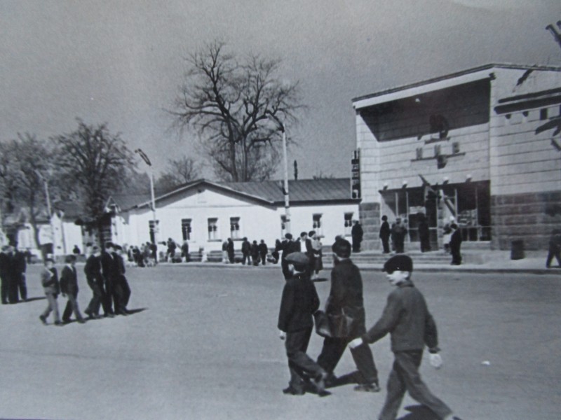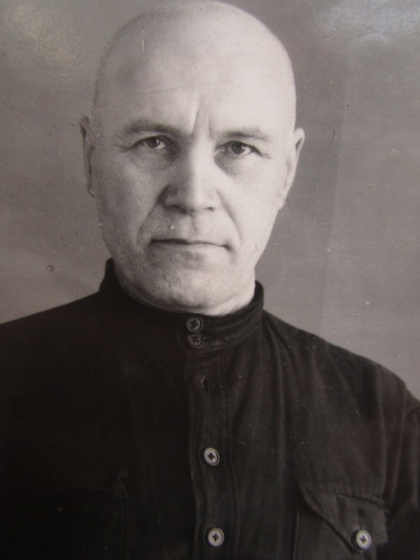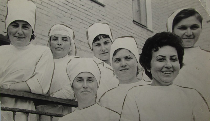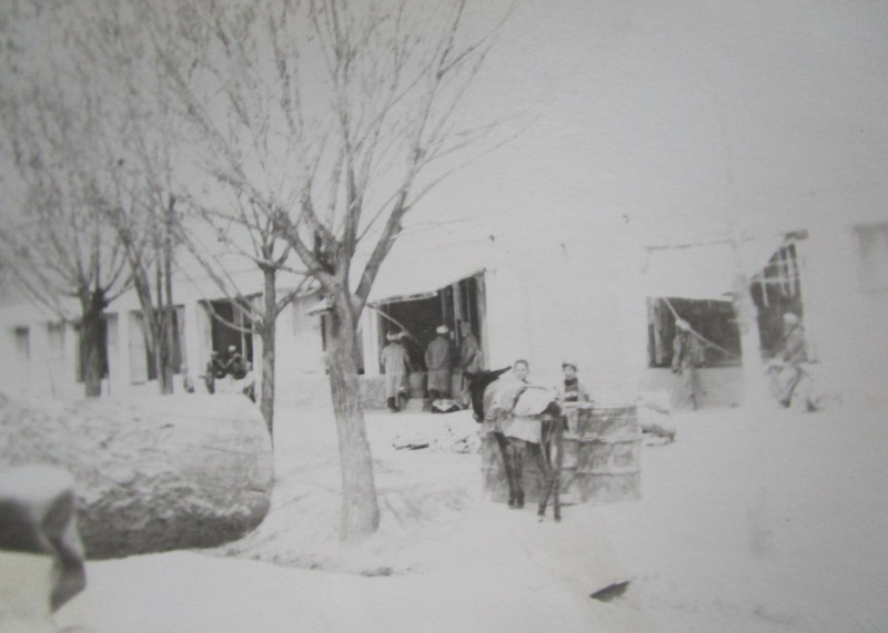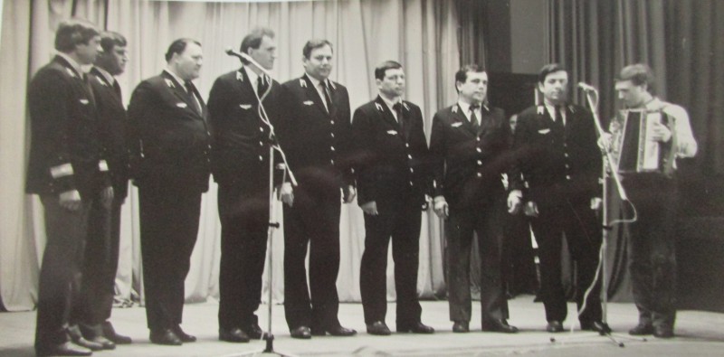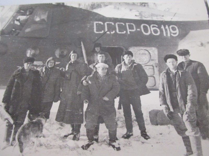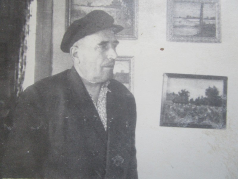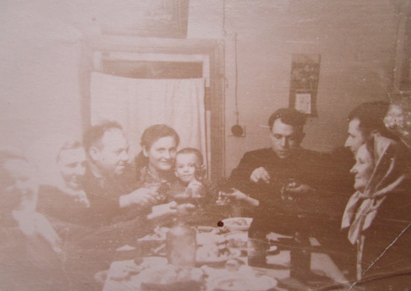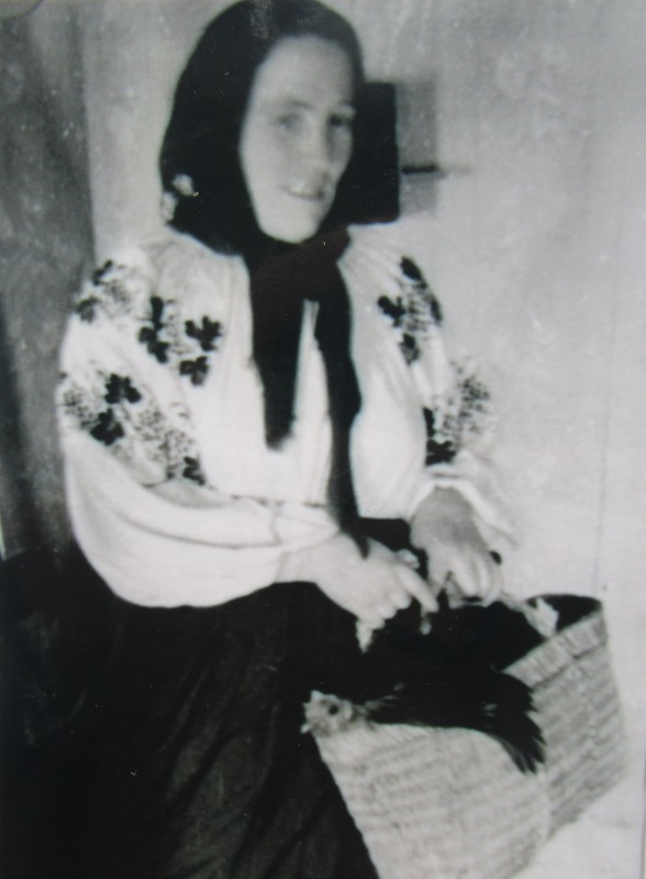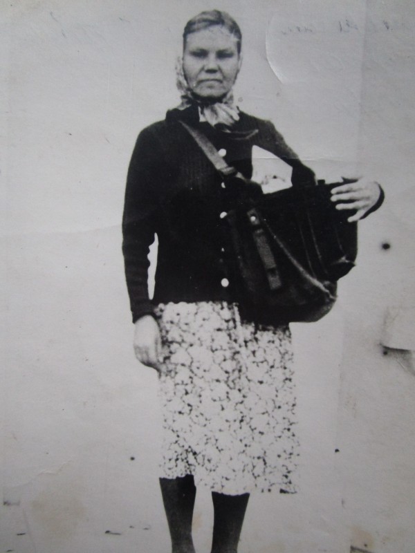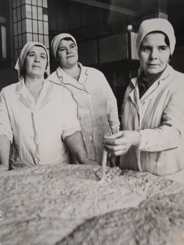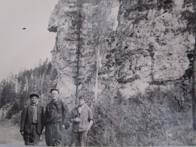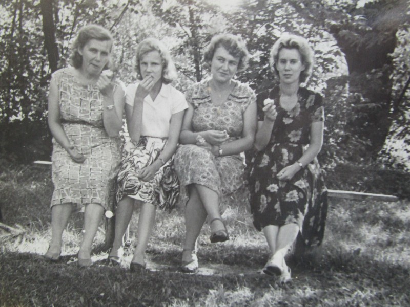 Біля церкви. На фото група людей: церковний хор і прихожани Свято-Преображенської церкви після хресного ходу навколо церкви. По центру протоієрей Чаленко Іван Григорович та протодиякон Прокопенко Іван Федорович одягнені у церковний одяг. На задньому плані дерев'яна церква. м. Бахмач, 50-ті рр. ХХ ст.