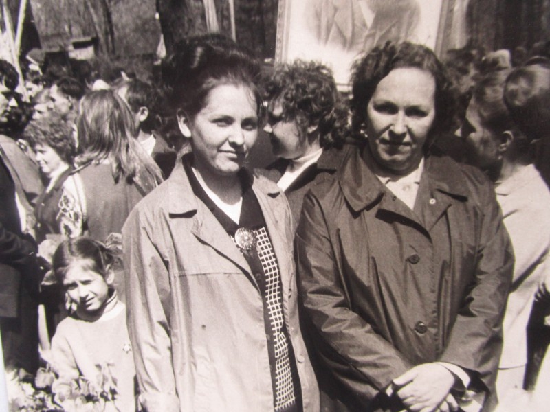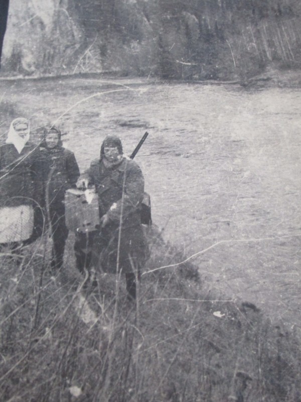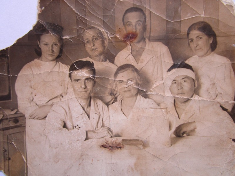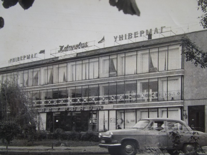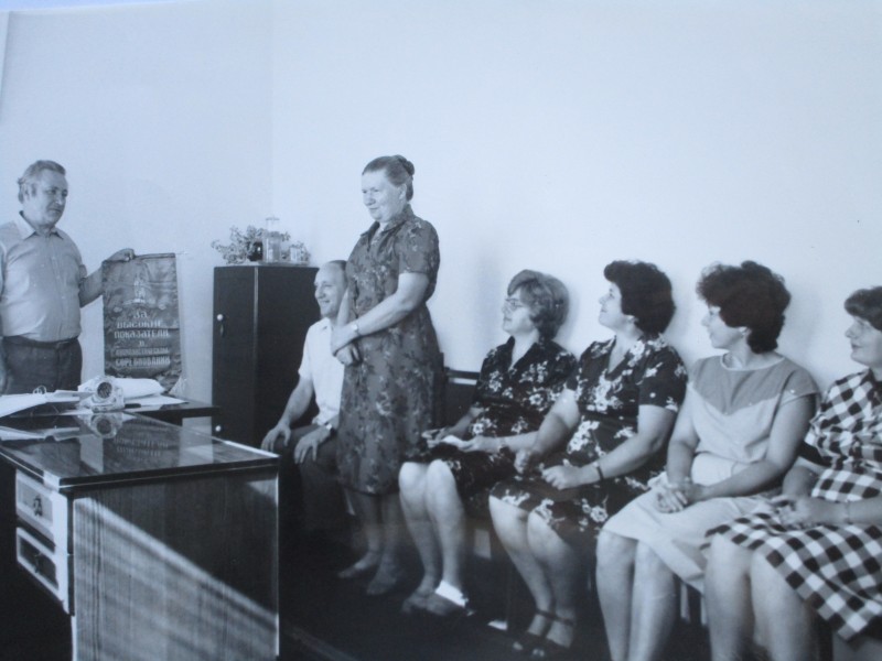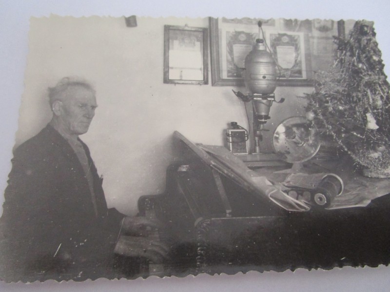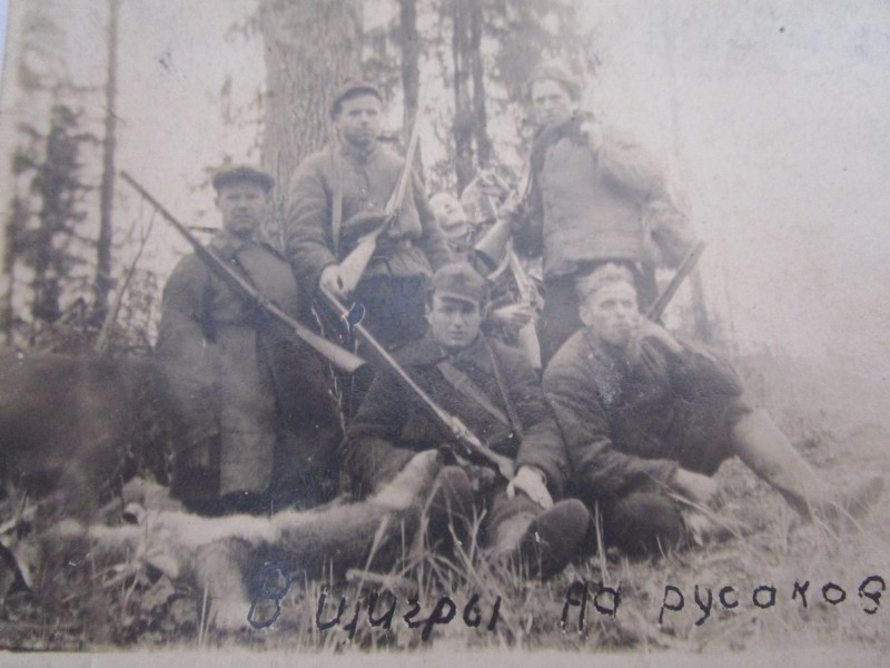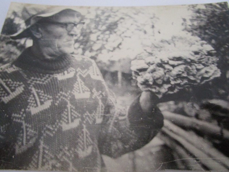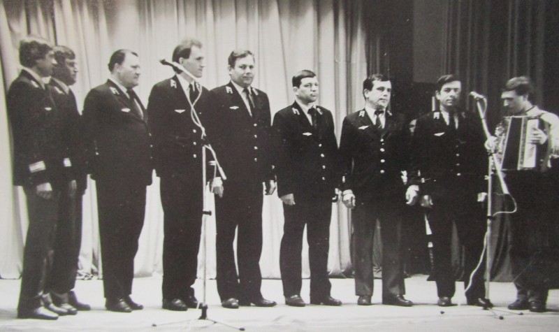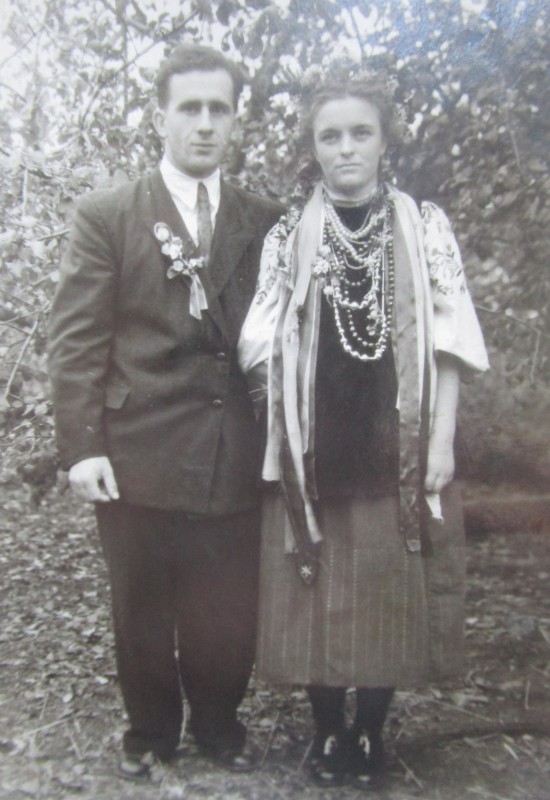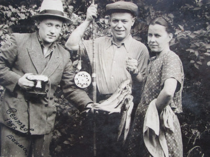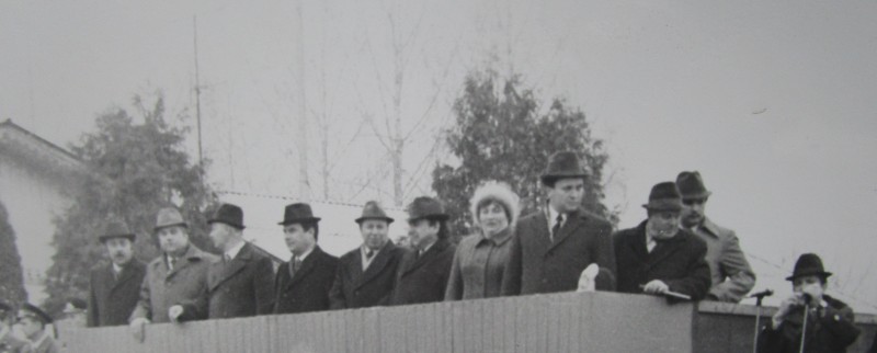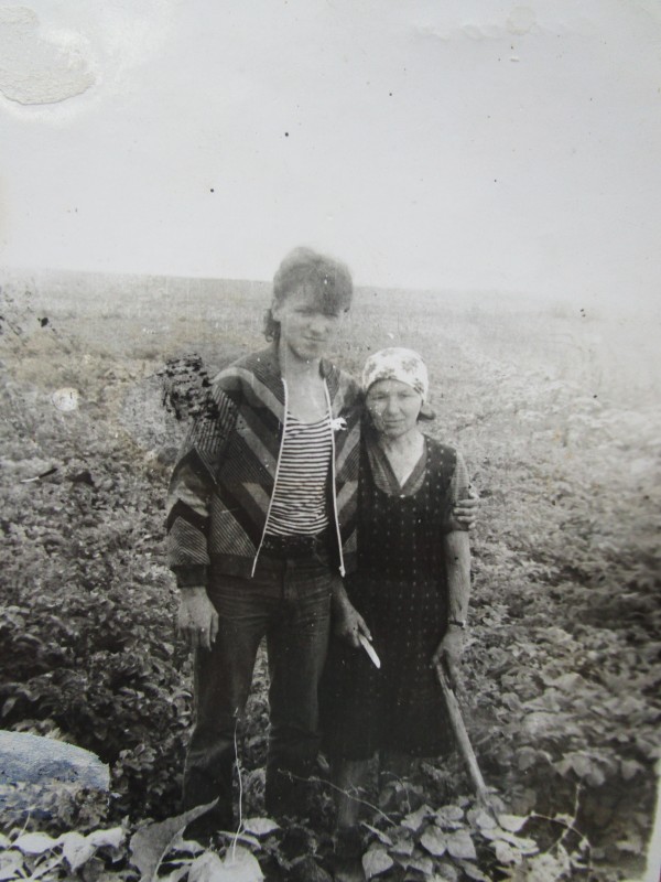 Біля церкви. На фото група людей: церковний хор і прихожани Свято-Преображенської церкви після хресного ходу навколо церкви. По центру протоієрей Чаленко Іван Григорович та протодиякон Прокопенко Іван Федорович одягнені у церковний одяг. На задньому плані дерев'яна церква. м. Бахмач, 50-ті рр. ХХ ст.