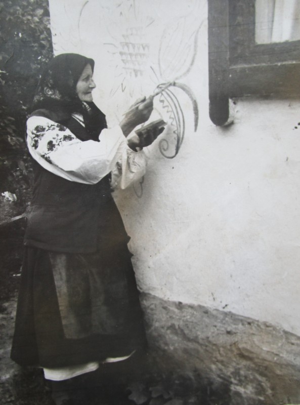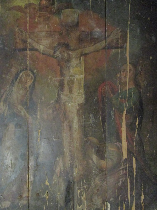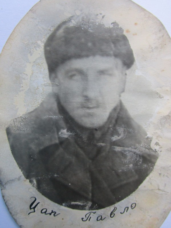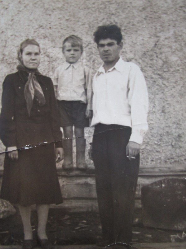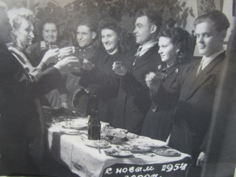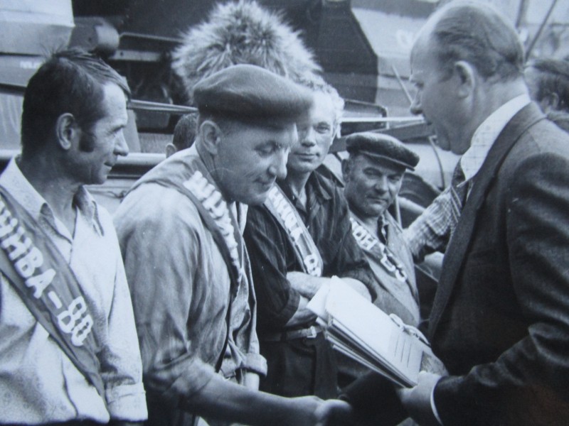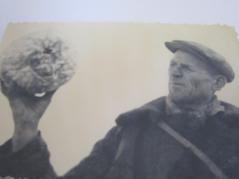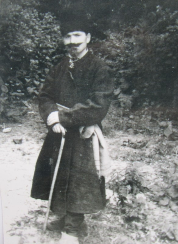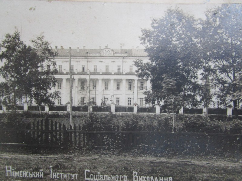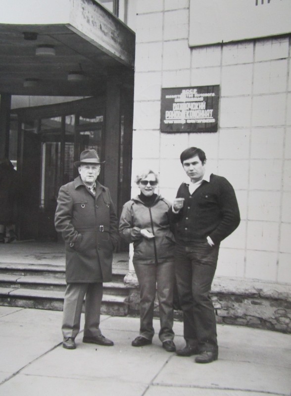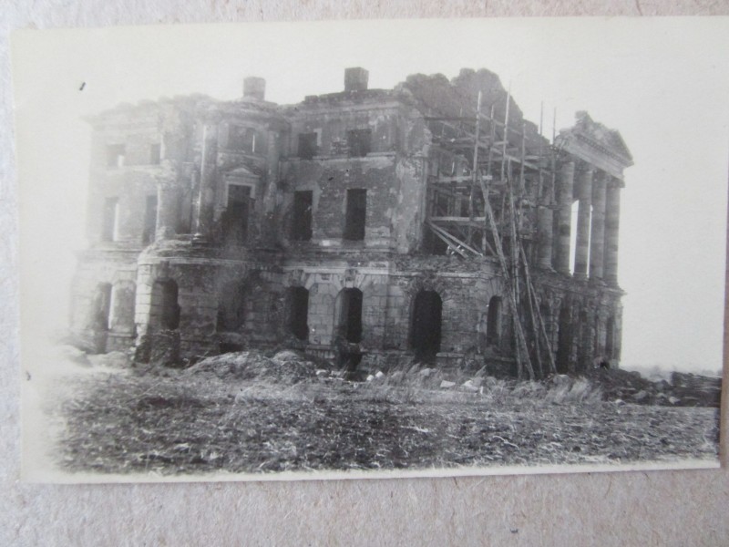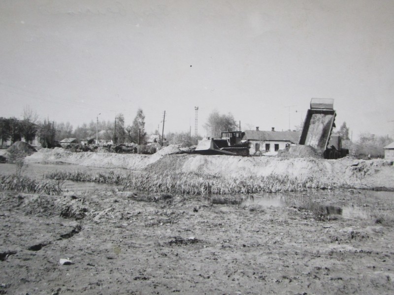 Біля церкви. На фото група людей: церковний хор і прихожани Свято-Преображенської церкви після хресного ходу навколо церкви. По центру протоієрей Чаленко Іван Григорович та протодиякон Прокопенко Іван Федорович одягнені у церковний одяг. На задньому плані дерев'яна церква. м. Бахмач, 50-ті рр. ХХ ст.