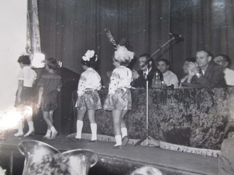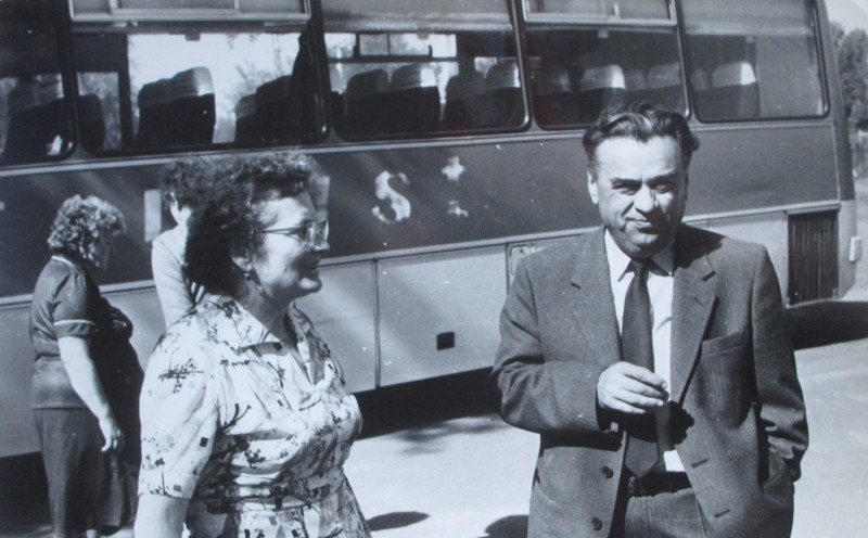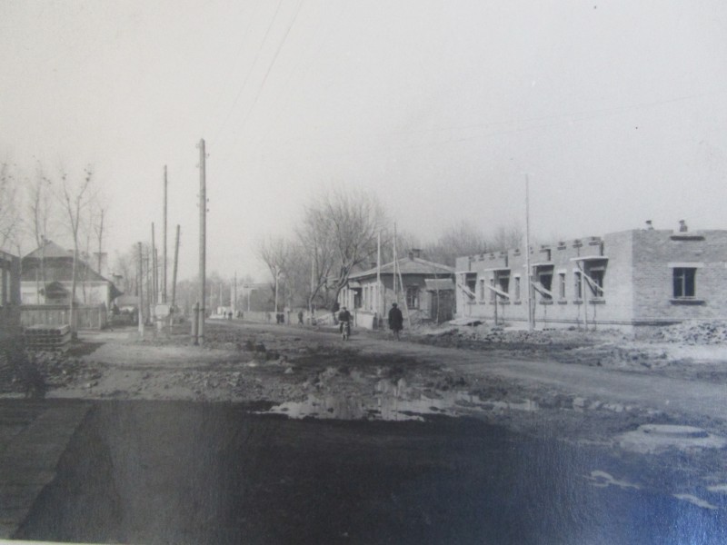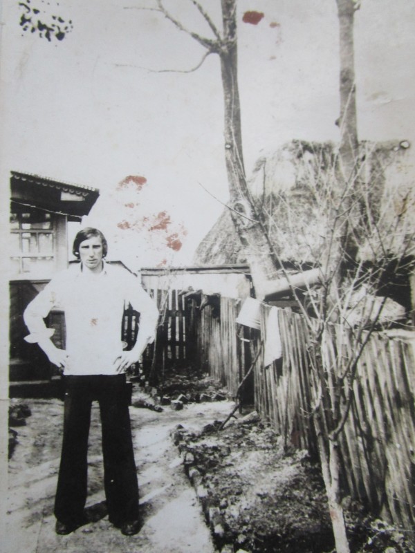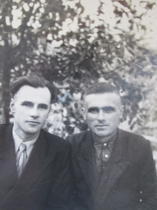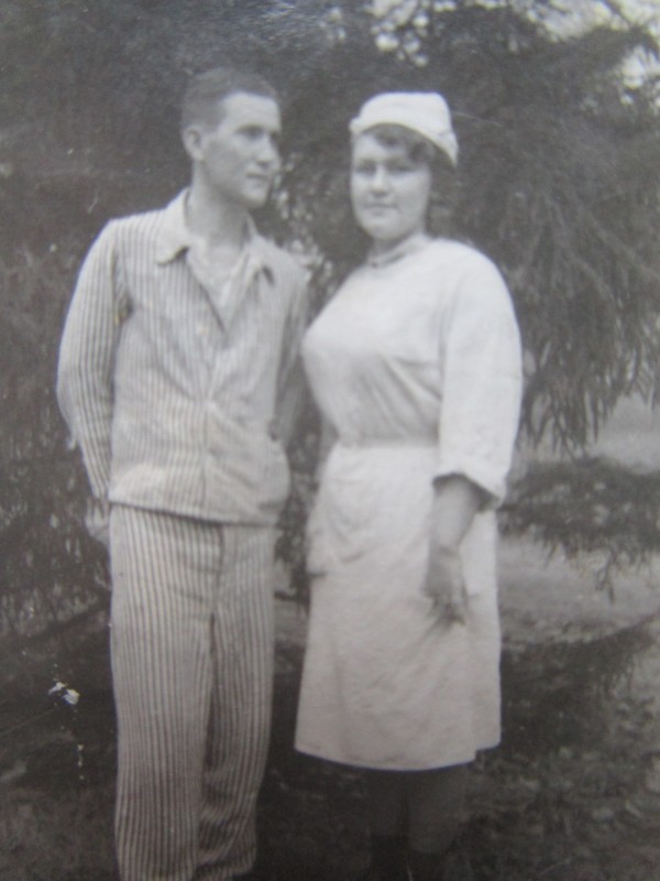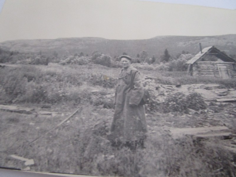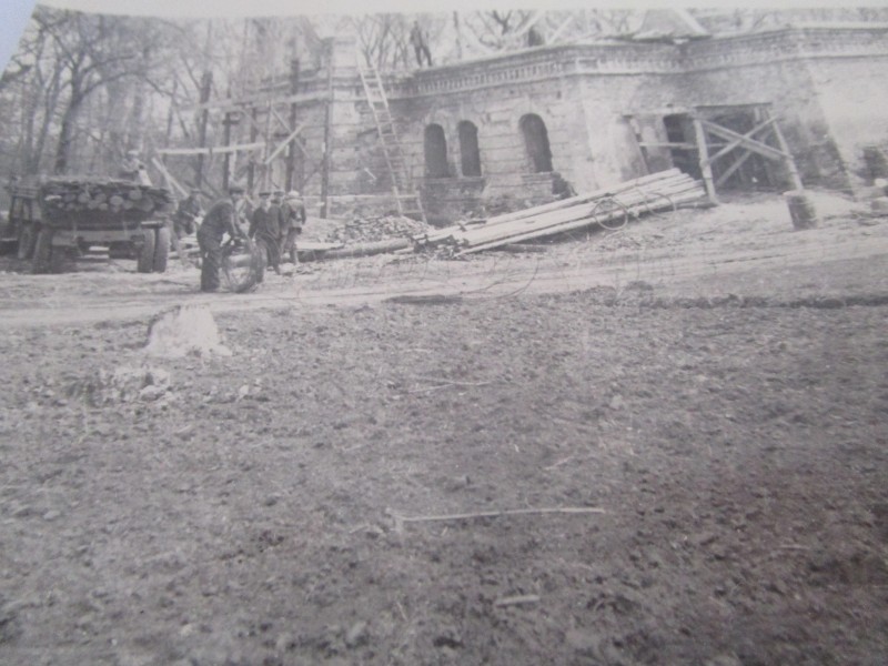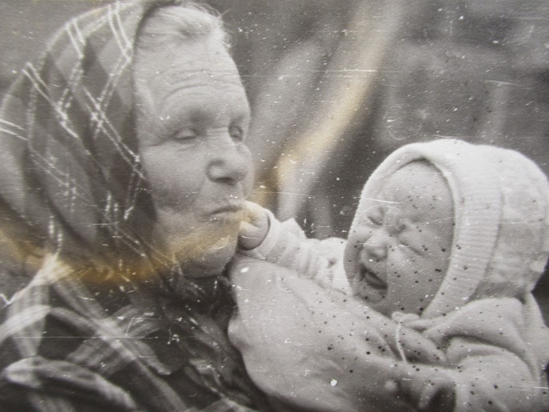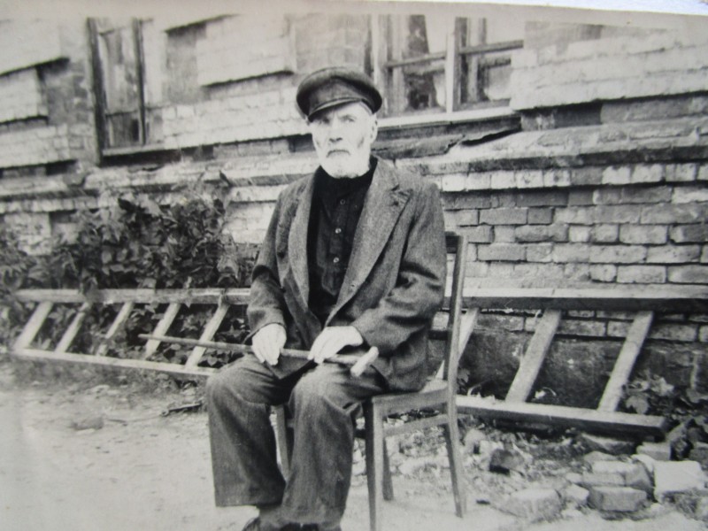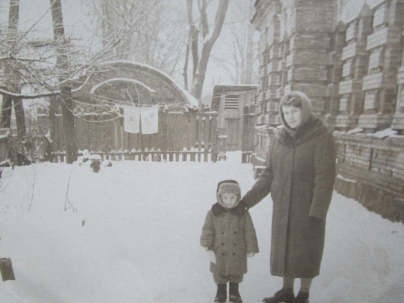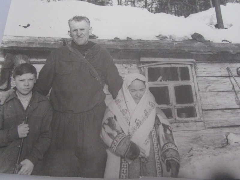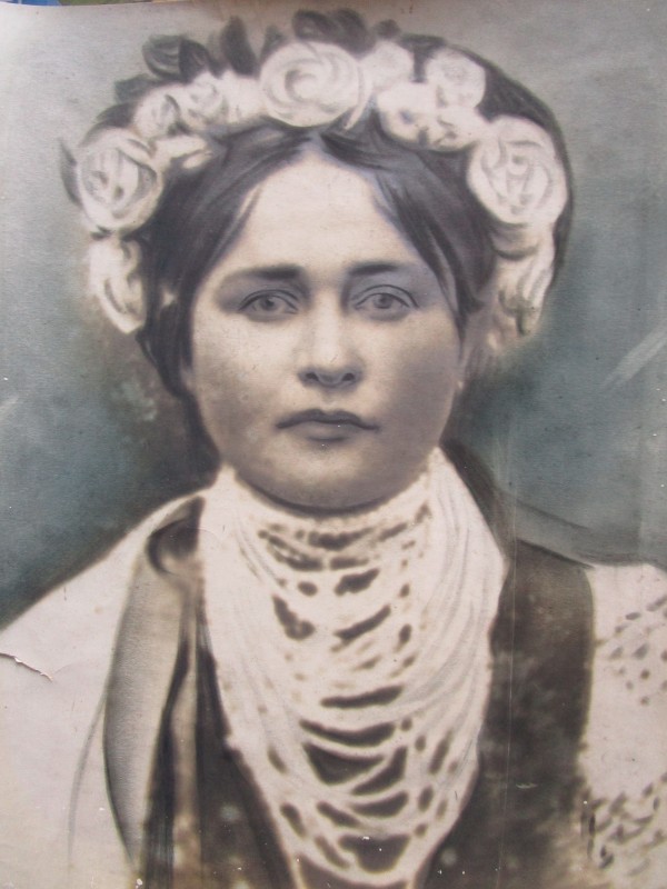 Біля церкви. На фото група людей: церковний хор і прихожани Свято-Преображенської церкви після хресного ходу навколо церкви. По центру протоієрей Чаленко Іван Григорович та протодиякон Прокопенко Іван Федорович одягнені у церковний одяг. На задньому плані дерев'яна церква. м. Бахмач, 50-ті рр. ХХ ст.