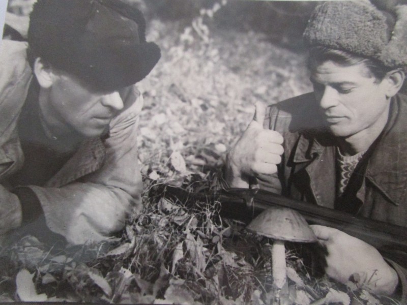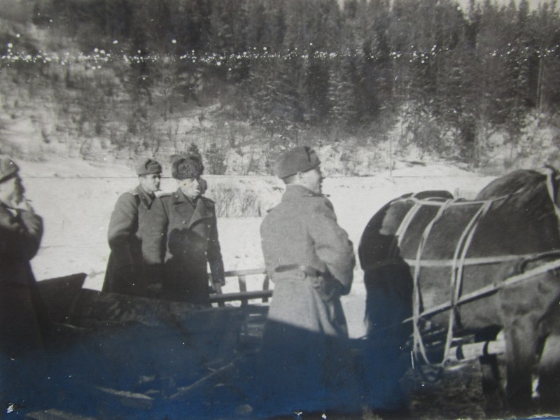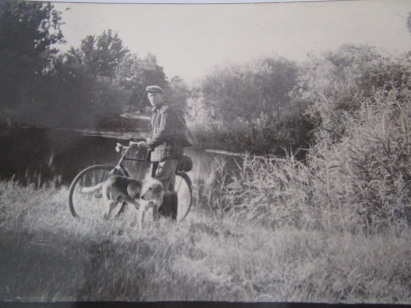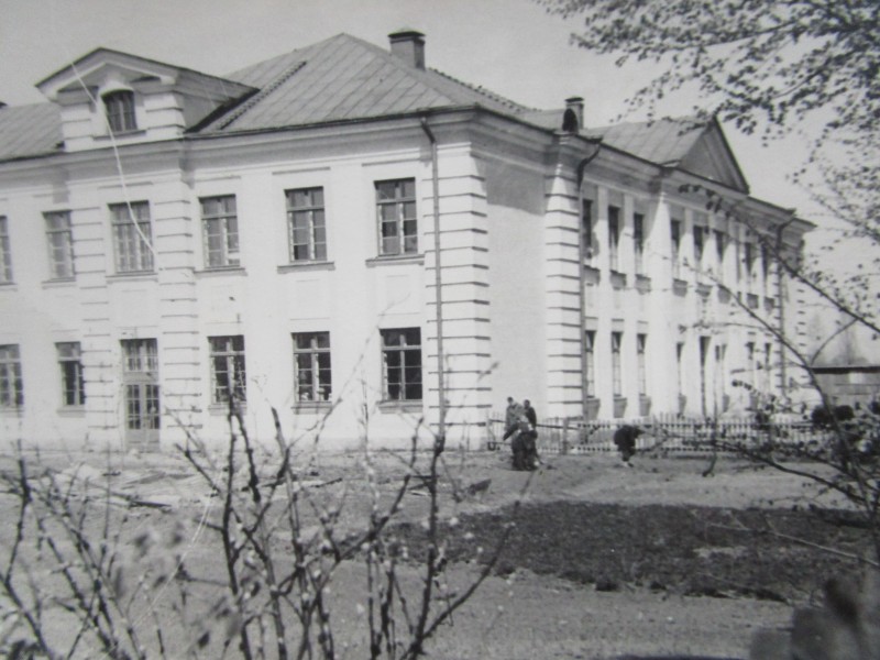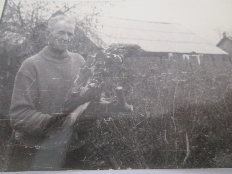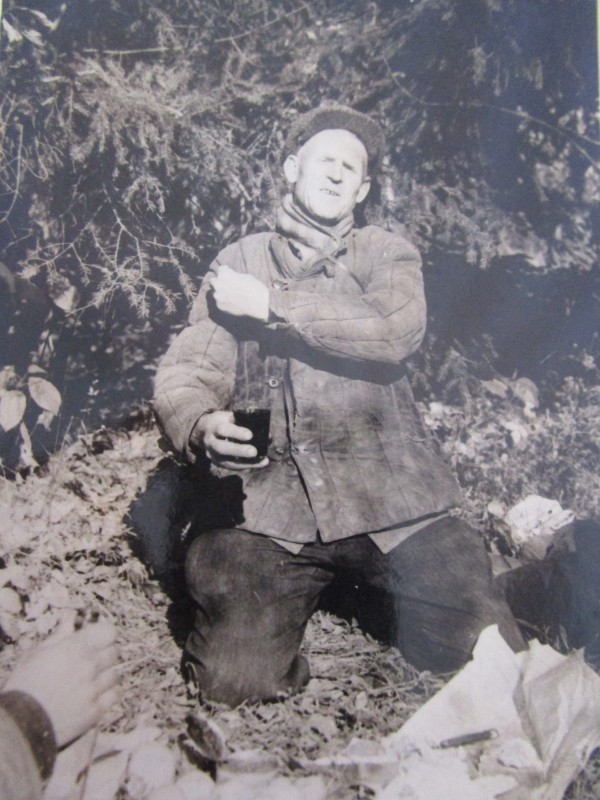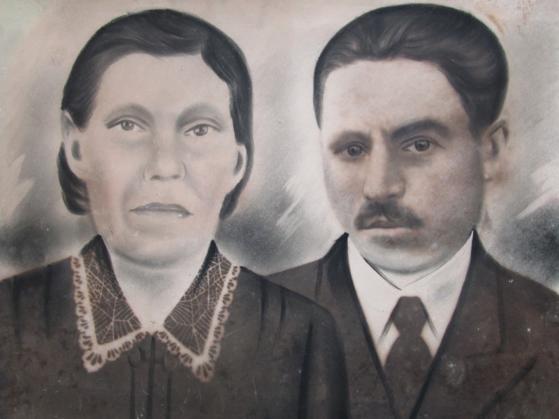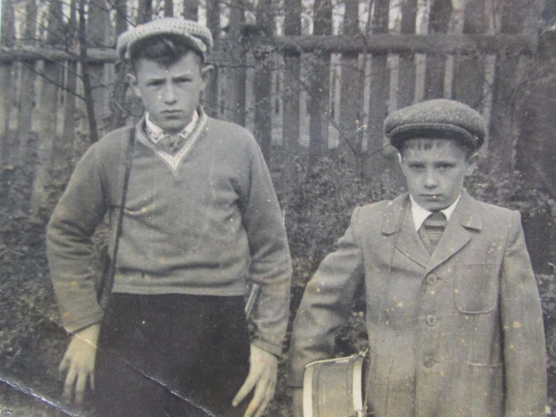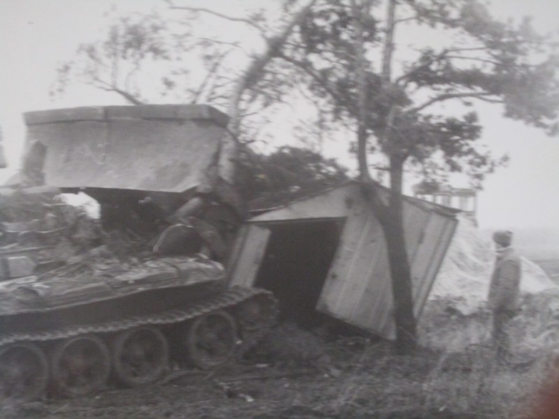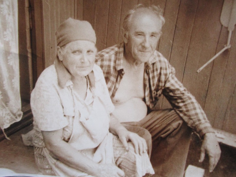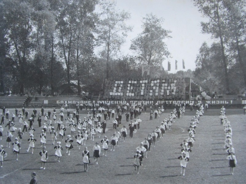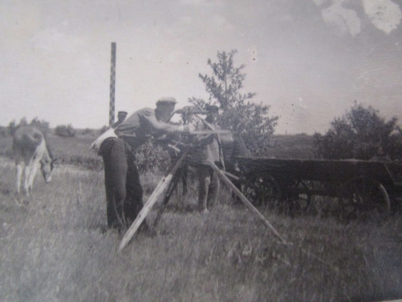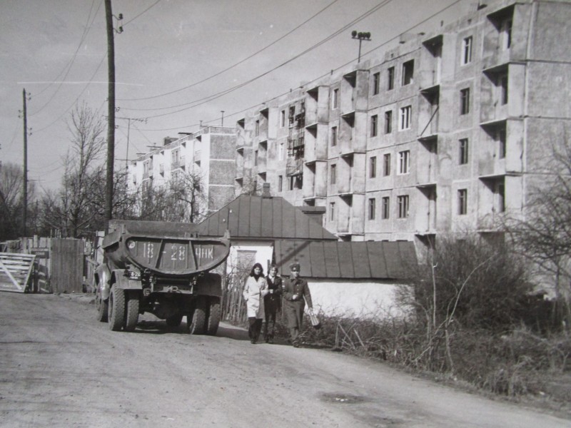 Біля церкви. На фото група людей: церковний хор і прихожани Свято-Преображенської церкви після хресного ходу навколо церкви. По центру протоієрей Чаленко Іван Григорович та протодиякон Прокопенко Іван Федорович одягнені у церковний одяг. На задньому плані дерев'яна церква. м. Бахмач, 50-ті рр. ХХ ст.