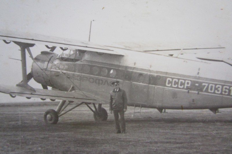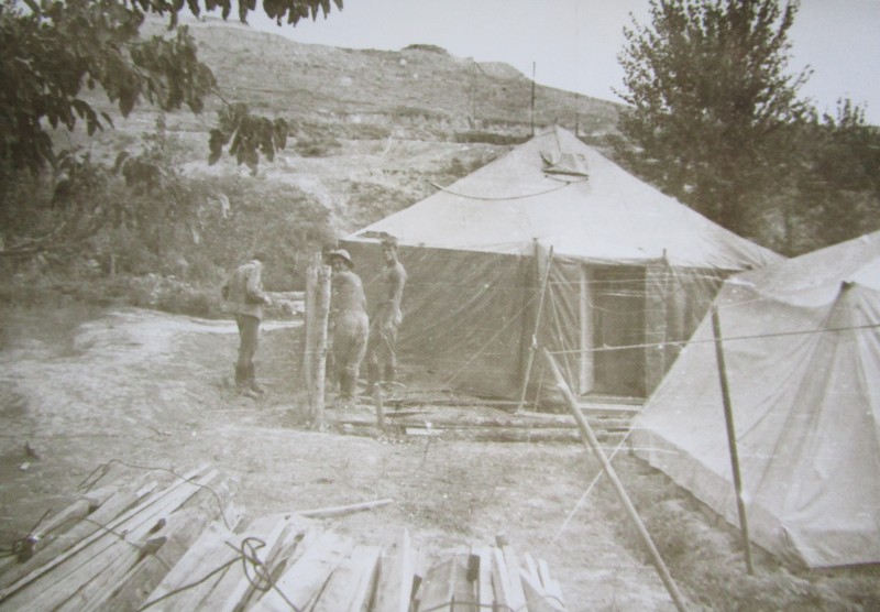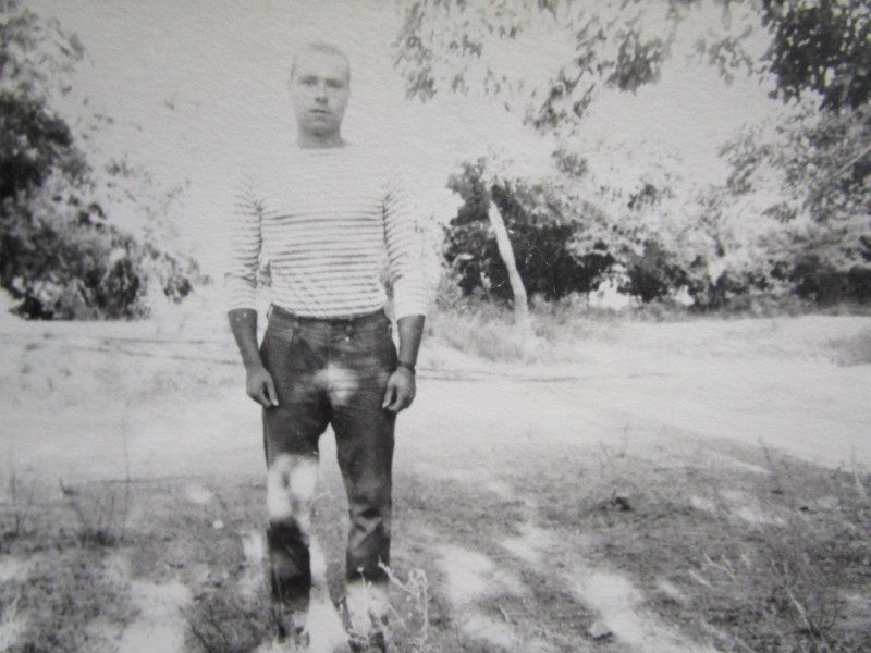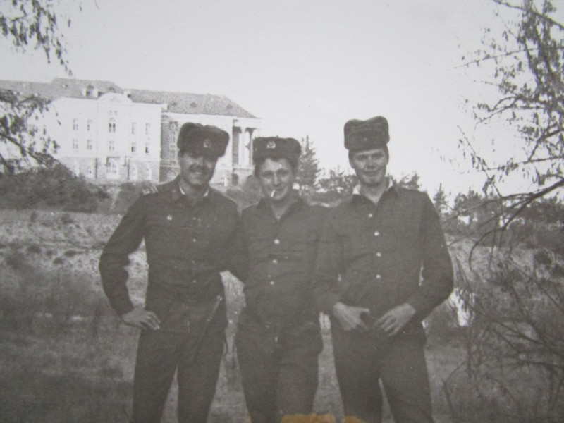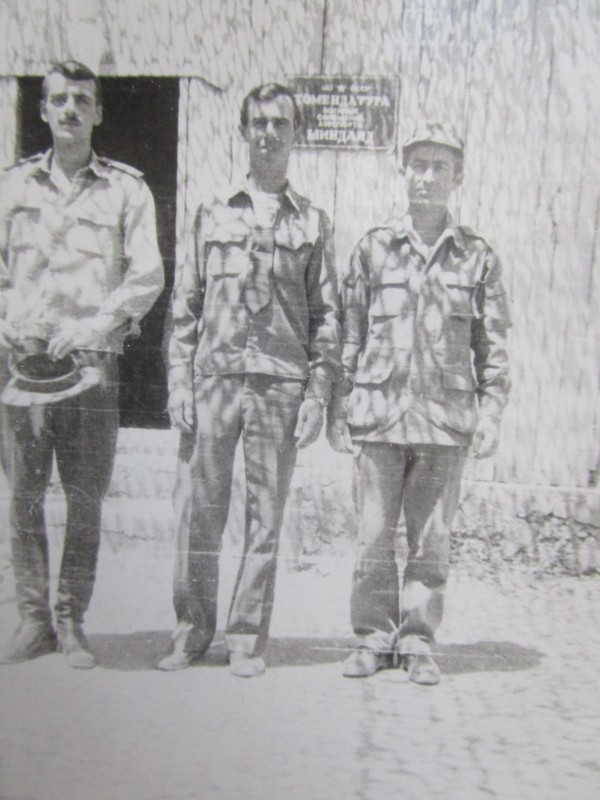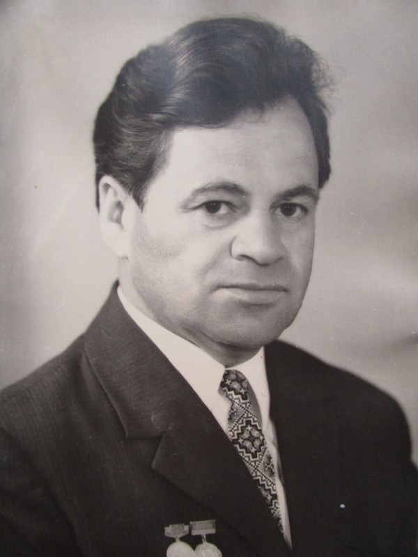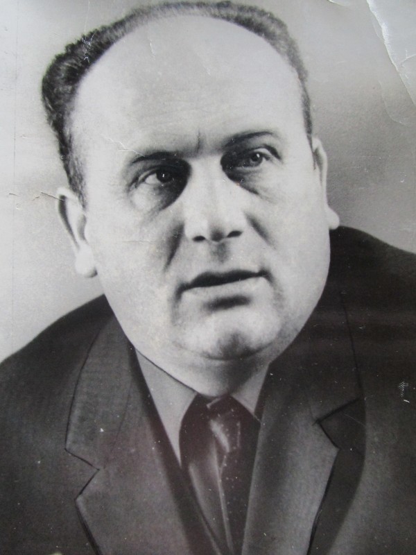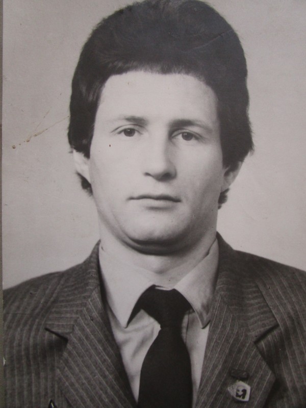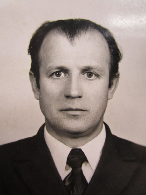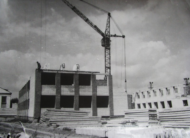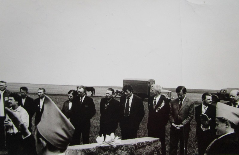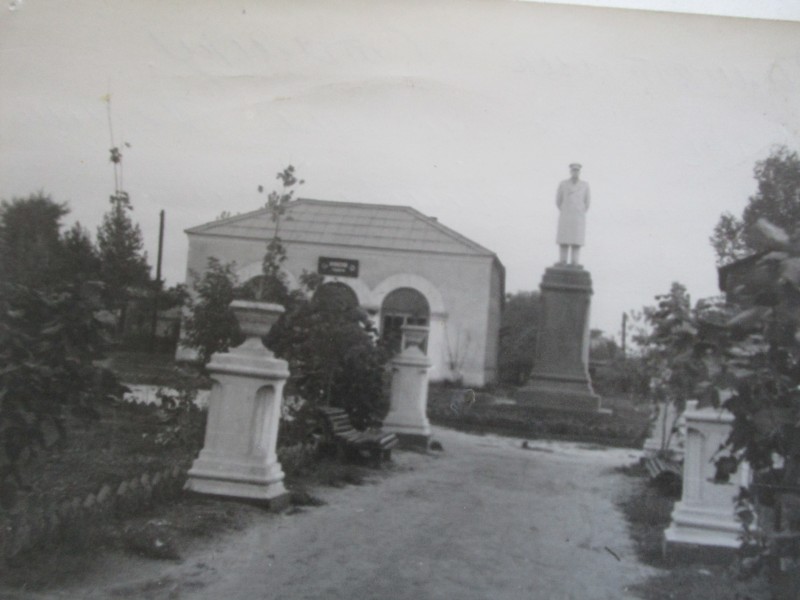 Святкування 1 травня м. Бахмач. По центру трибуна з написом "1-ше", на трибуні стоять люди. Виступає Арендар Петро Іванович - голова райвиконкому. Більшість людей одягнені у костюми. На задньому плані дерева без листочків. м. Бахмач, 1978 рік.