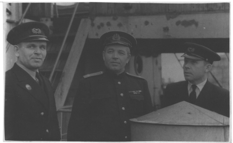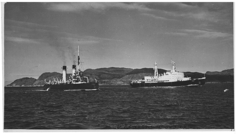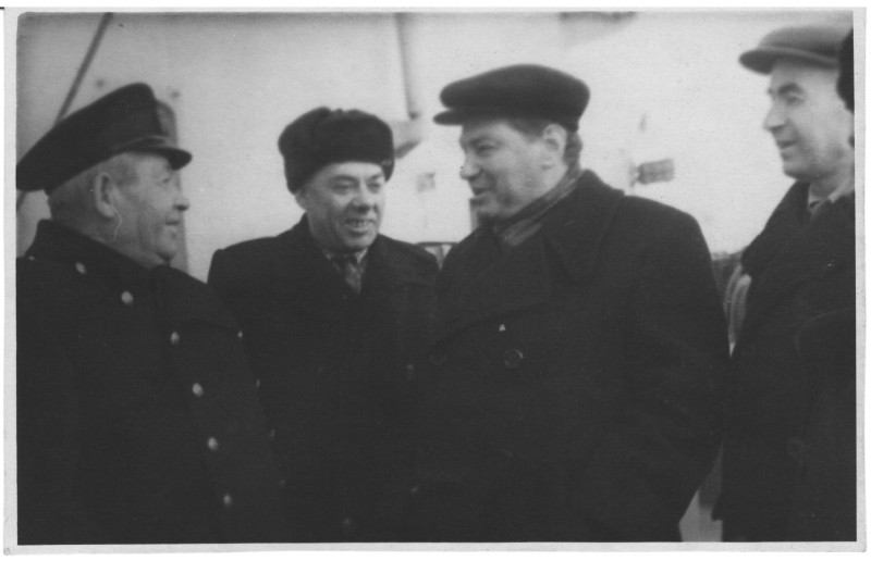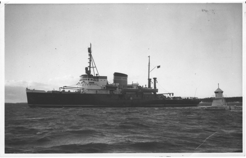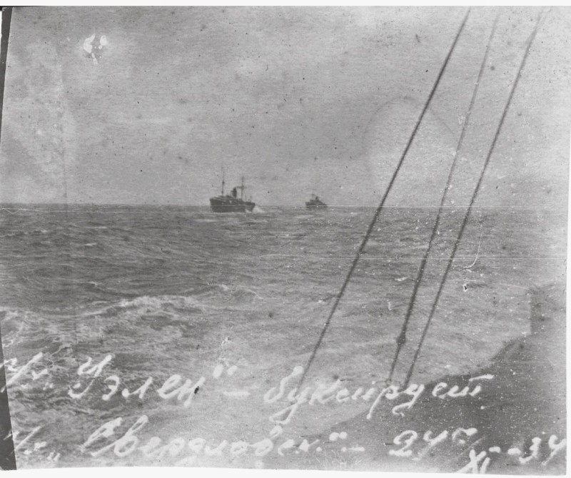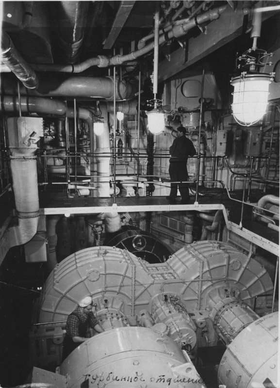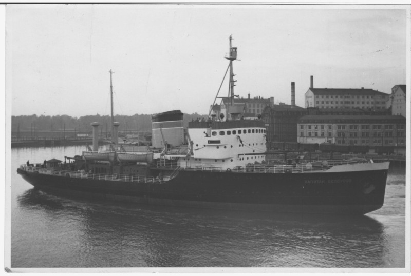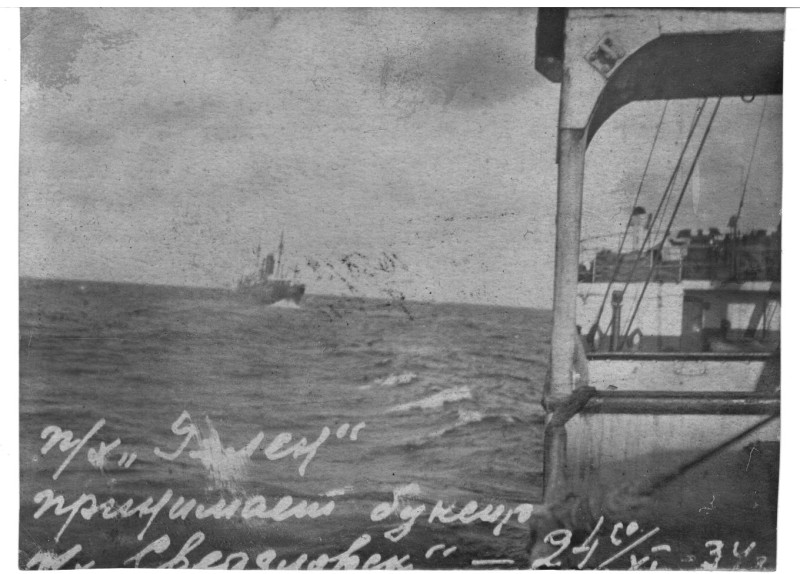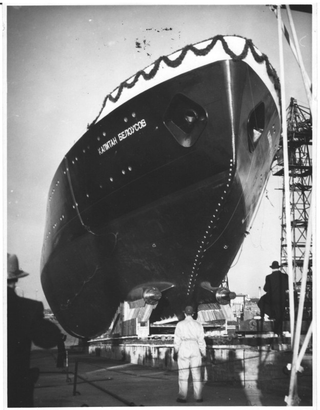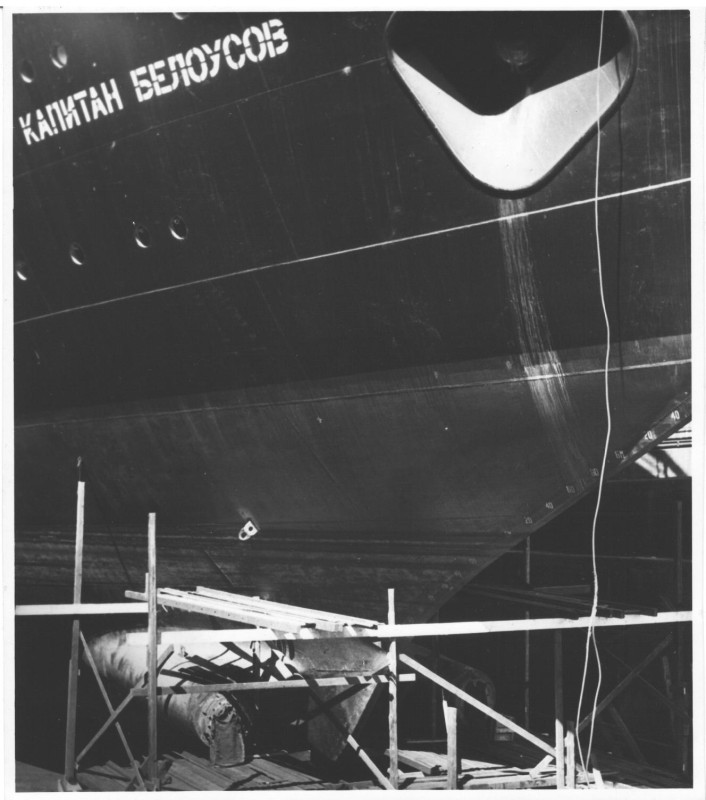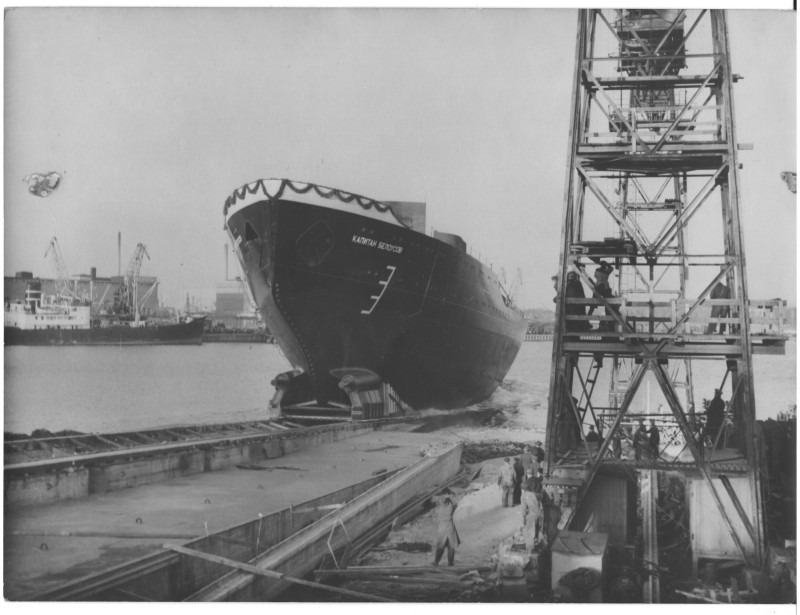 Фото. П/п «Севан» БМП. 1958 р. Занурення пароплава у воду. П/п "Севан" побудований в Турку, Фінляндія у 1945 р. 30.08.1958 р. судно було розчавлено кригою у Карському морі і загинуло.