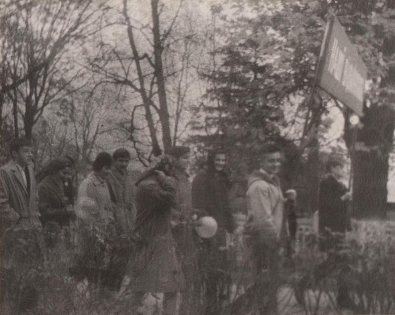 Фотографія. Чорно-біла. Сюжетна. В. Івасюк. Поясне зображення. Профіль справа. Одягнутий у светр. Навпроти нього стоїть сестра Галя з кінокамерою, знімає його. Справа видно чоловіка. Позаду дерева. 1973 рік.