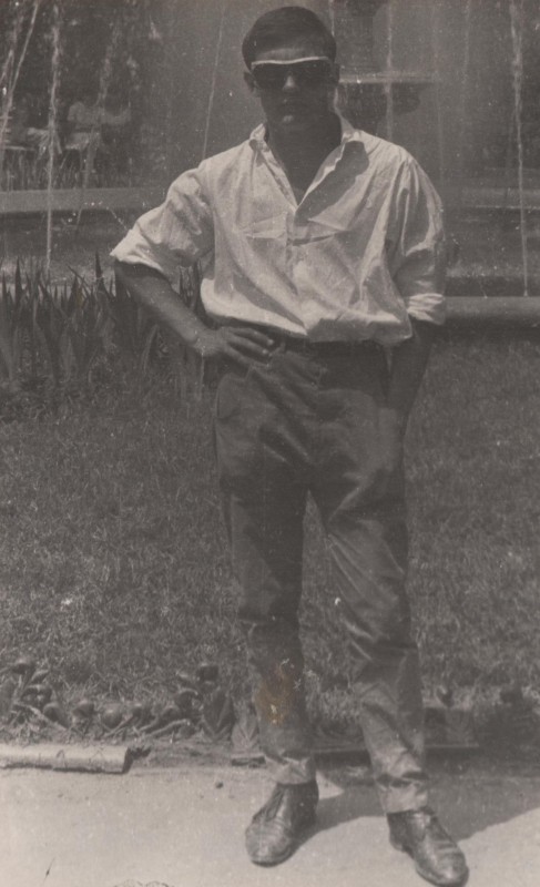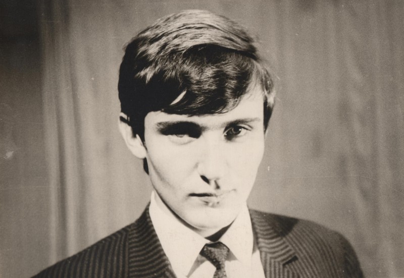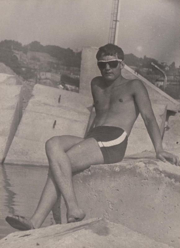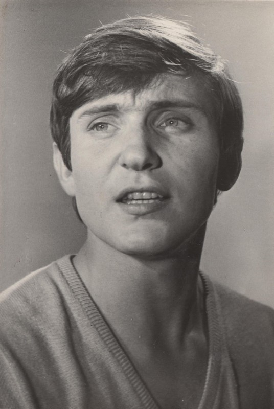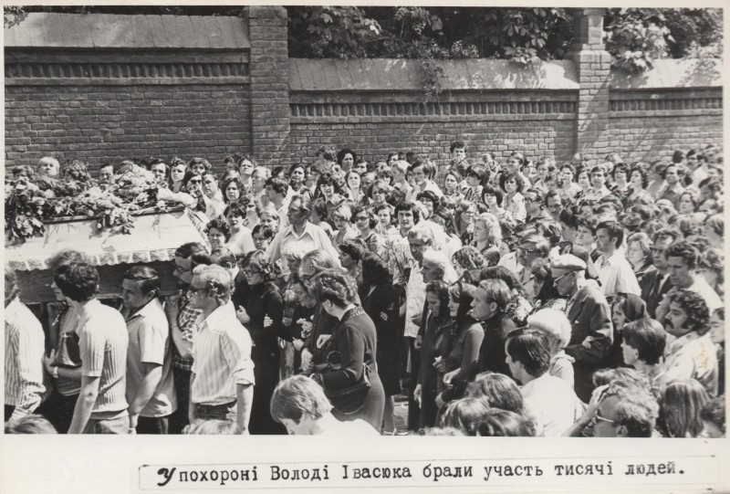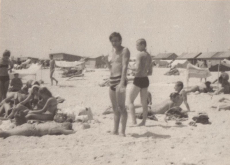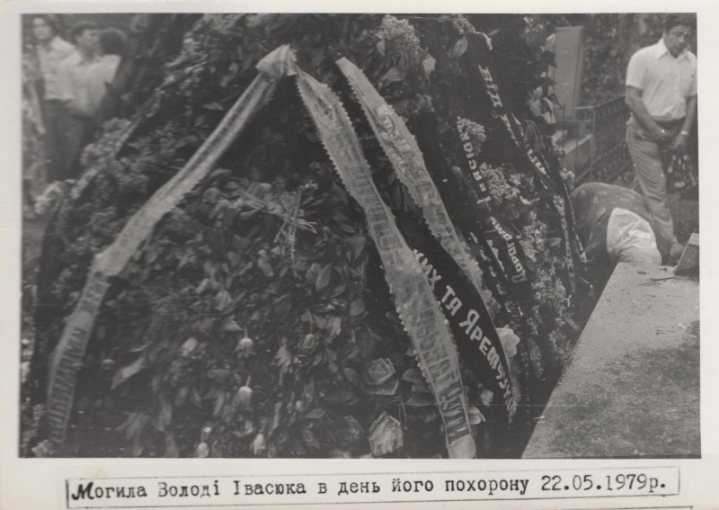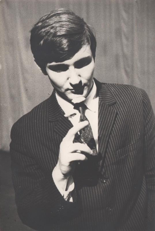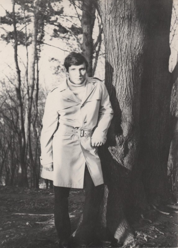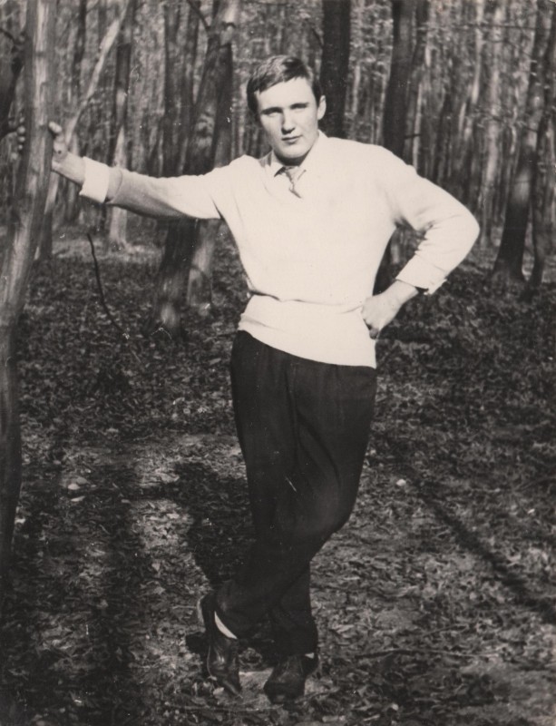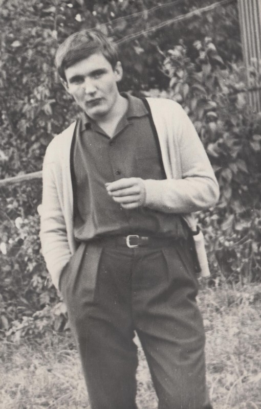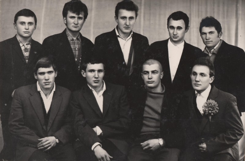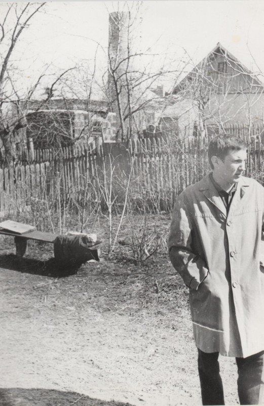 Фотографія. Чорно-біла. Сюжетна. В. Івасюк. Зображення вище колін. Анфас. Одягнутий у світлий піджак, темні брюки і сорочку в клітинку. Руки складені внизу. Поряд стоїть хлопець Микола Сторожук і щось тримає в руках. Позаду них видно будинок. Літо 1966 року. Кіцмань.