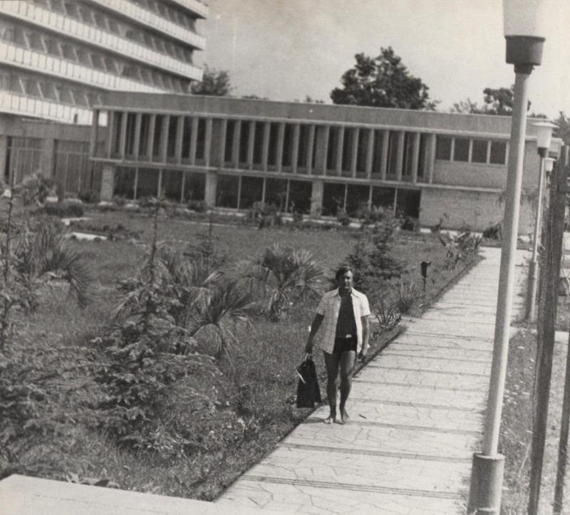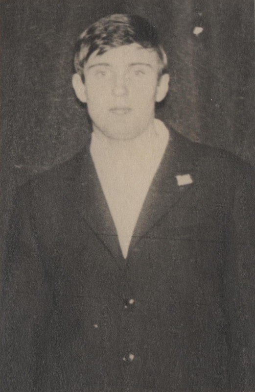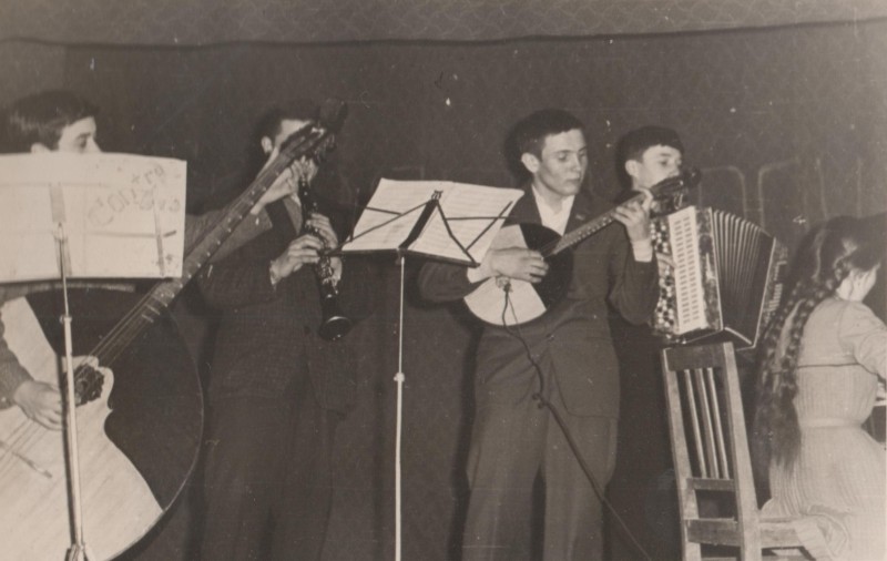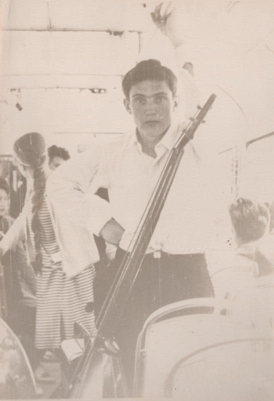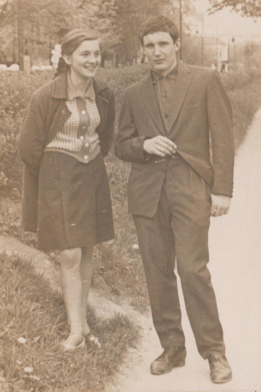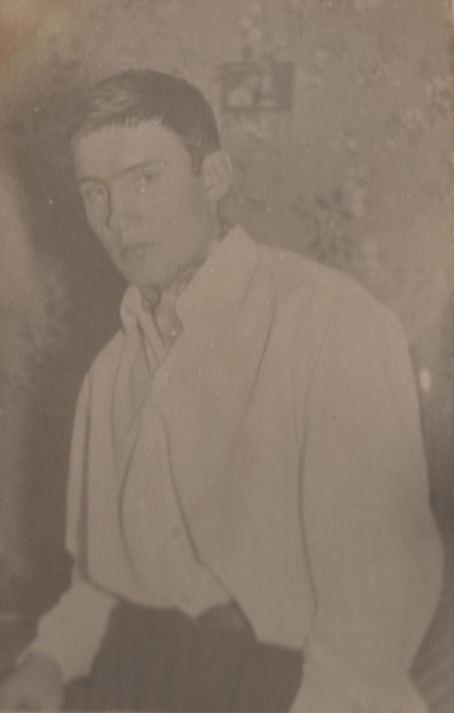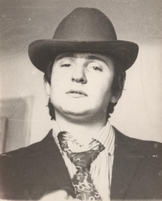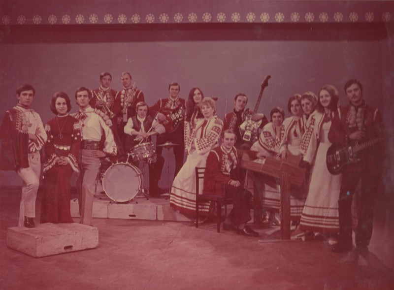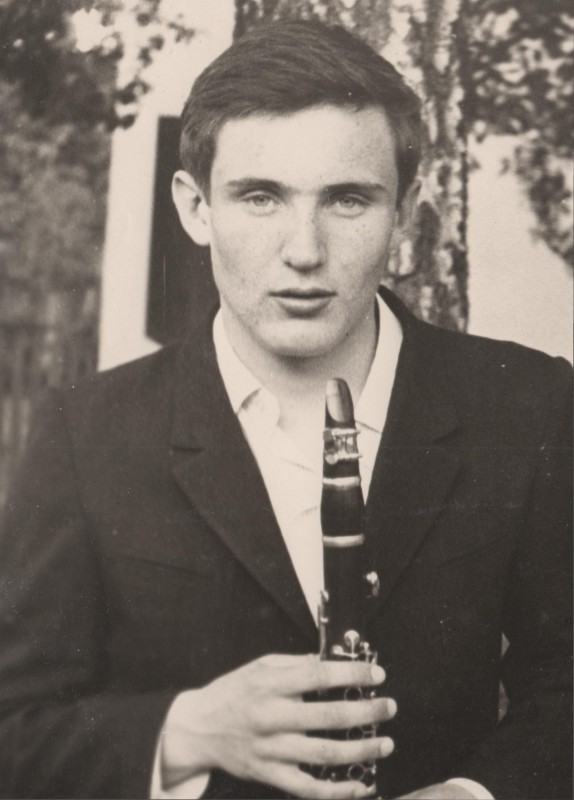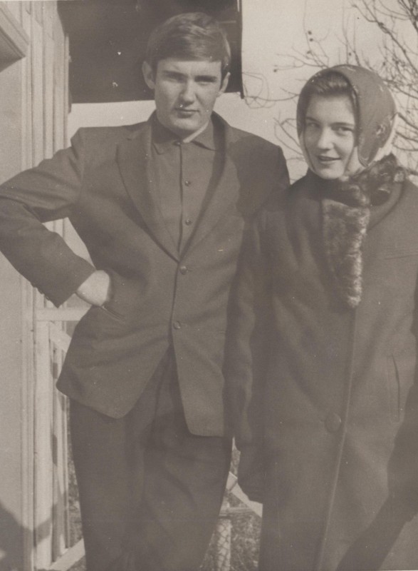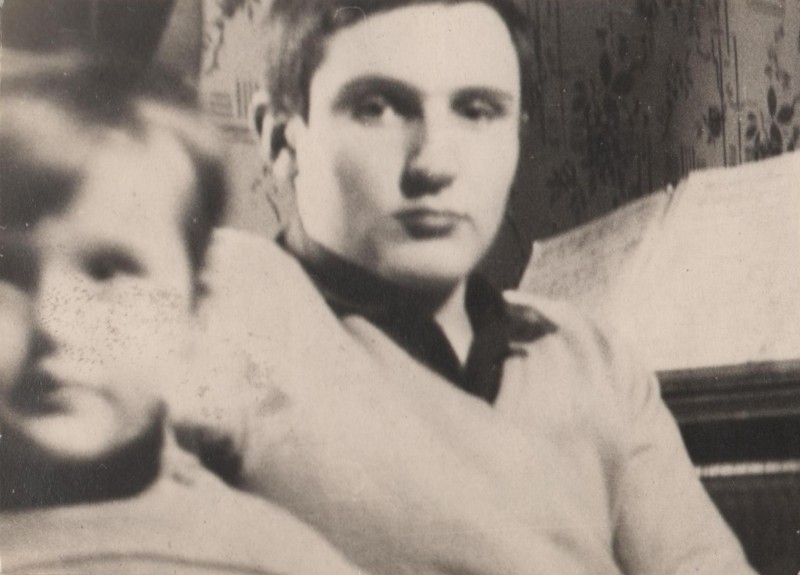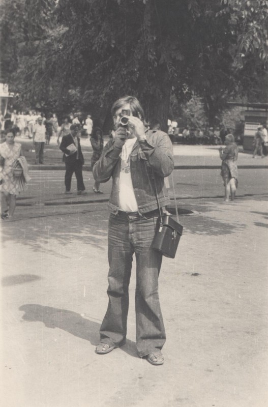 Фотографія. Чорно-біла. Сюжетна. В. Івасюк. Зображення вище колін. Анфас. Одягнутий у світлий піджак, темні брюки і сорочку в клітинку. Руки складені внизу. Поряд стоїть хлопець Микола Сторожук і щось тримає в руках. Позаду них видно будинок. Літо 1966 року. Кіцмань.
