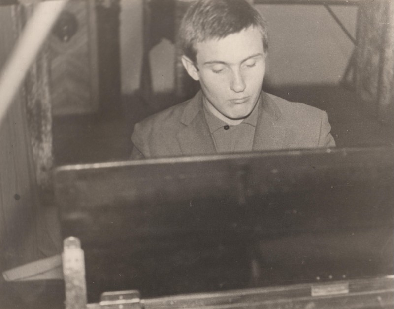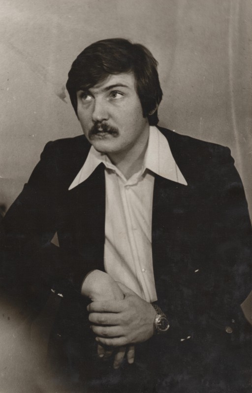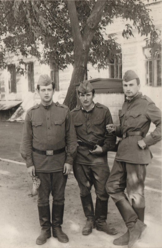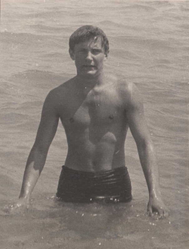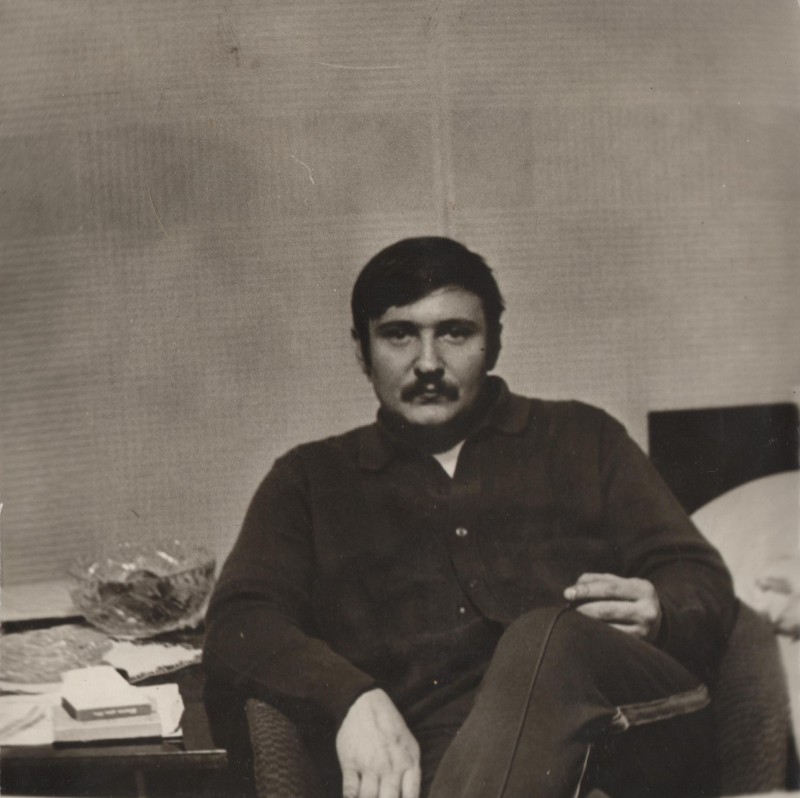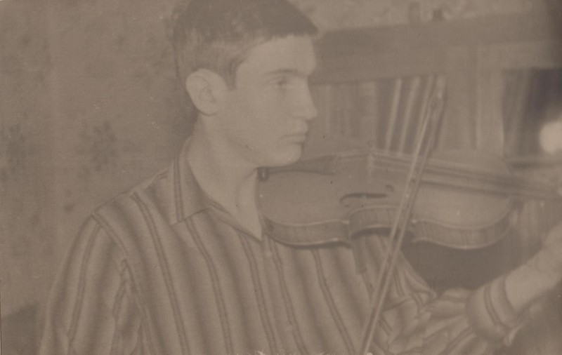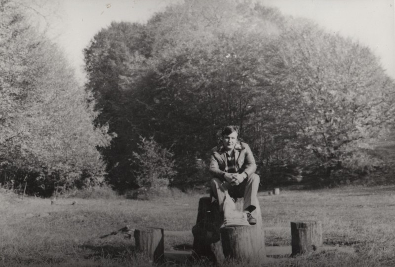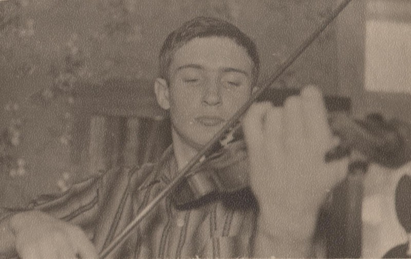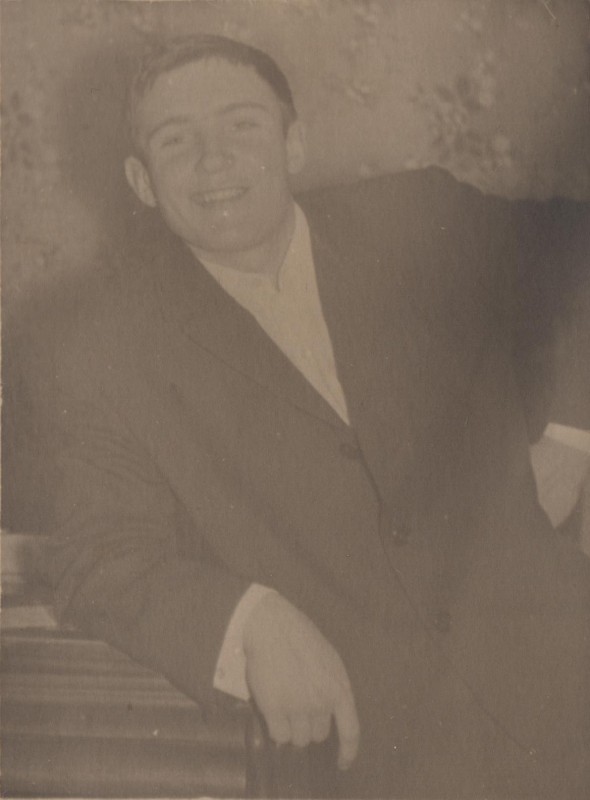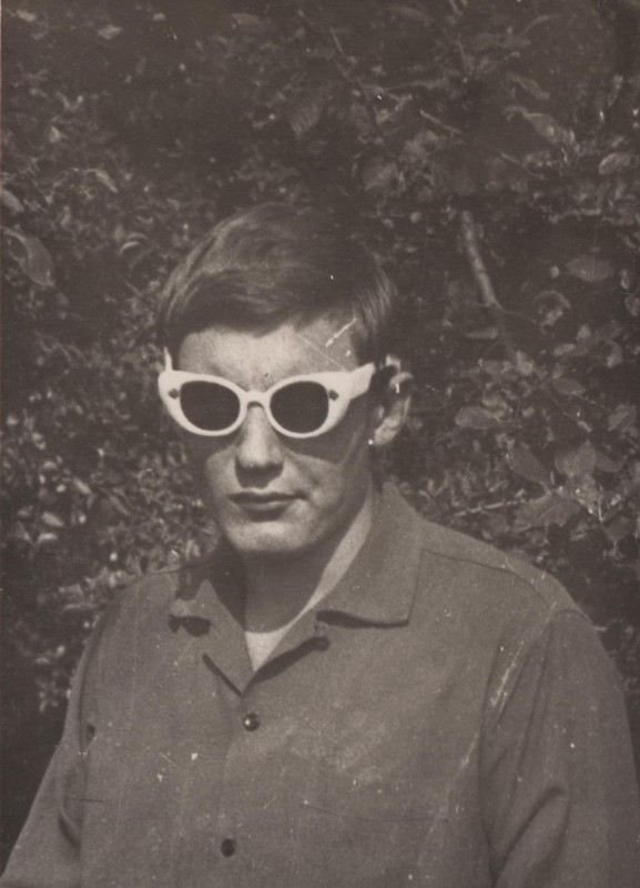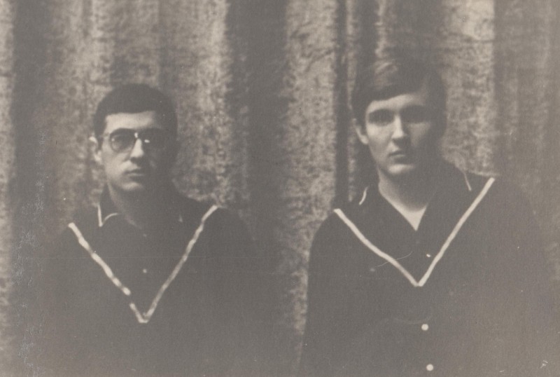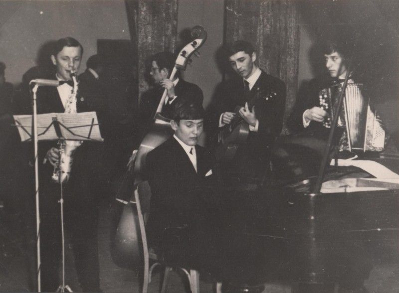 Фотографія. Чорно-біла. Сюжетна. В. Івасюк. Зображення вище колін. Анфас. Одягнутий у світлий піджак, темні брюки і сорочку в клітинку. Руки складені внизу. Поряд стоїть хлопець Микола Сторожук і щось тримає в руках. Позаду них видно будинок. Літо 1966 року. Кіцмань.