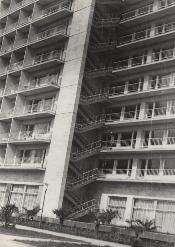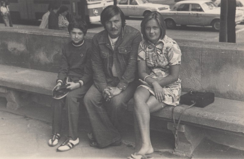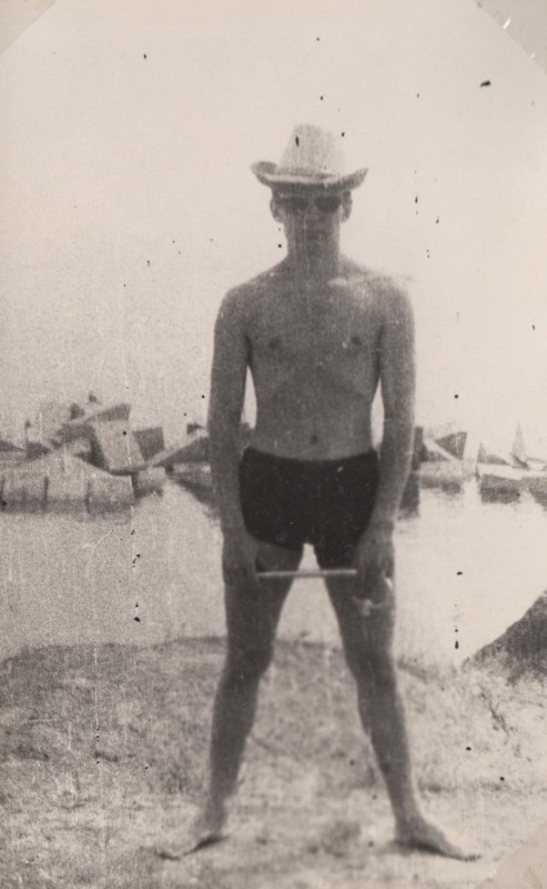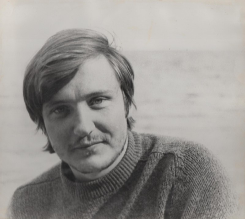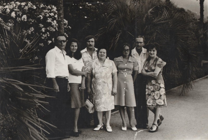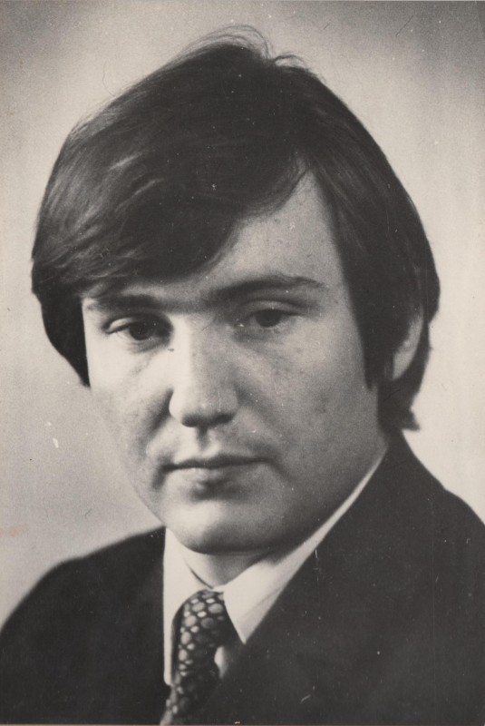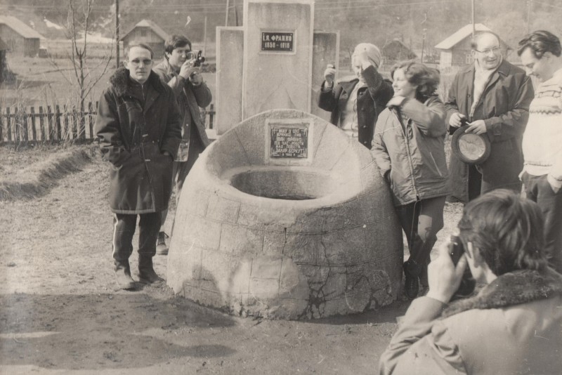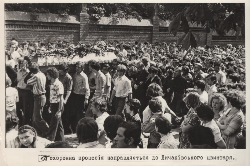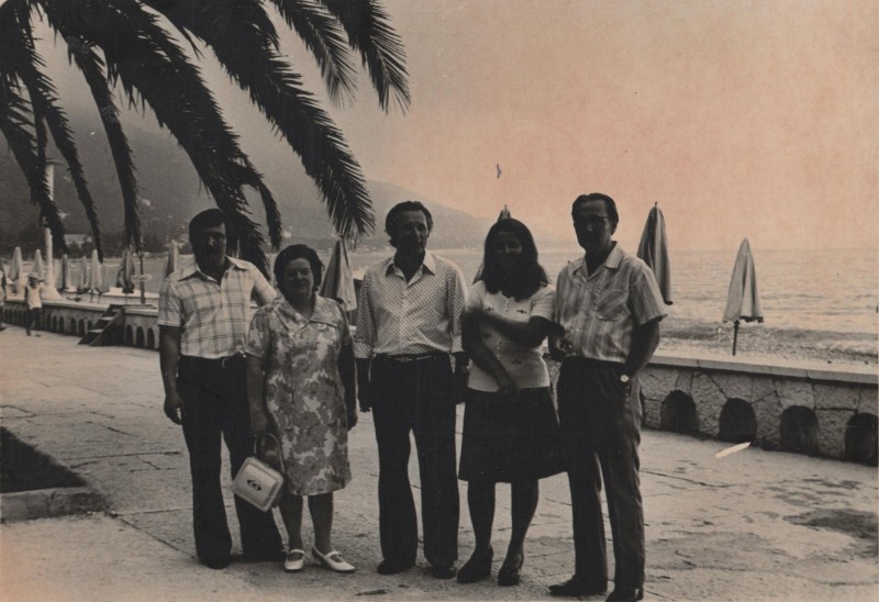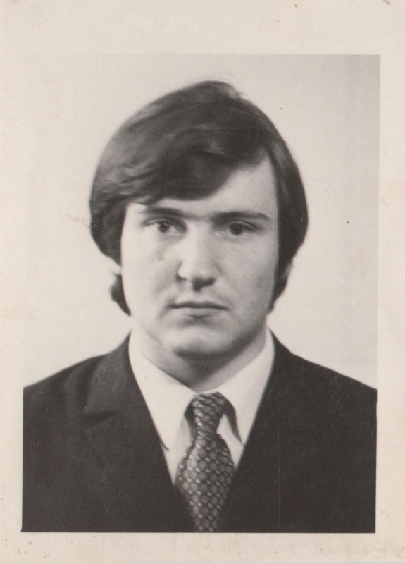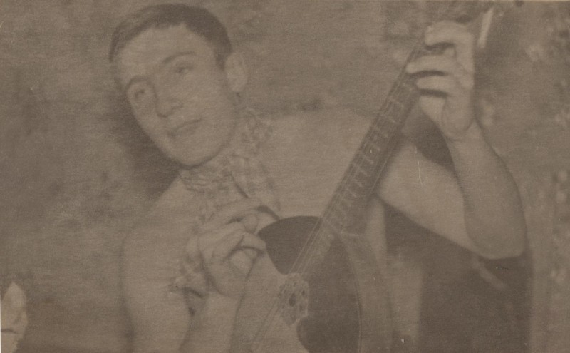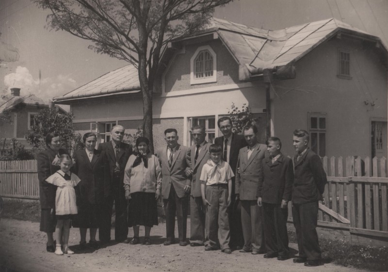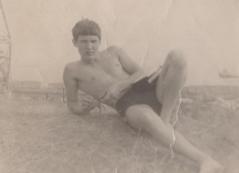 Фотографія. Чорно-біла. Сюжетна. В. Івасюк. Зображення вище колін. Анфас. Одягнутий у світлий піджак, темні брюки і сорочку в клітинку. Руки складені внизу. Поряд стоїть хлопець Микола Сторожук і щось тримає в руках. Позаду них видно будинок. Літо 1966 року. Кіцмань.