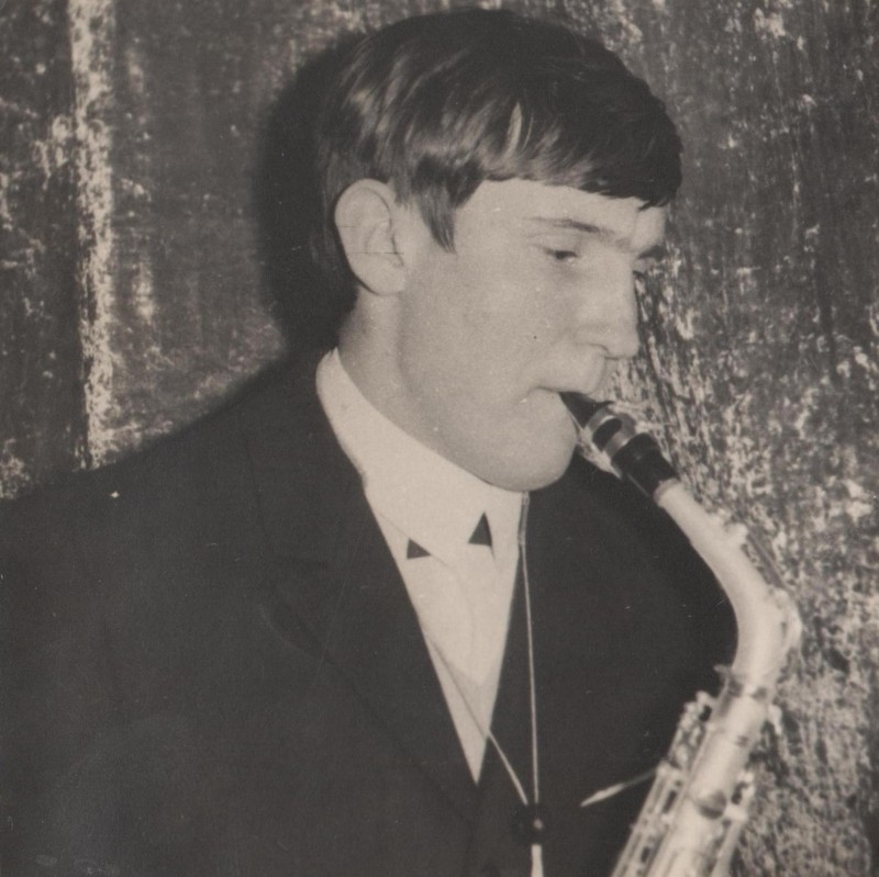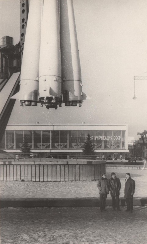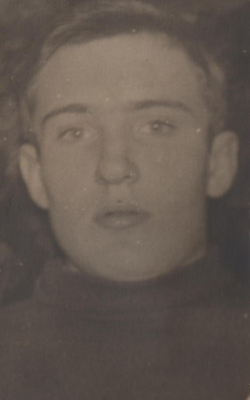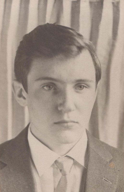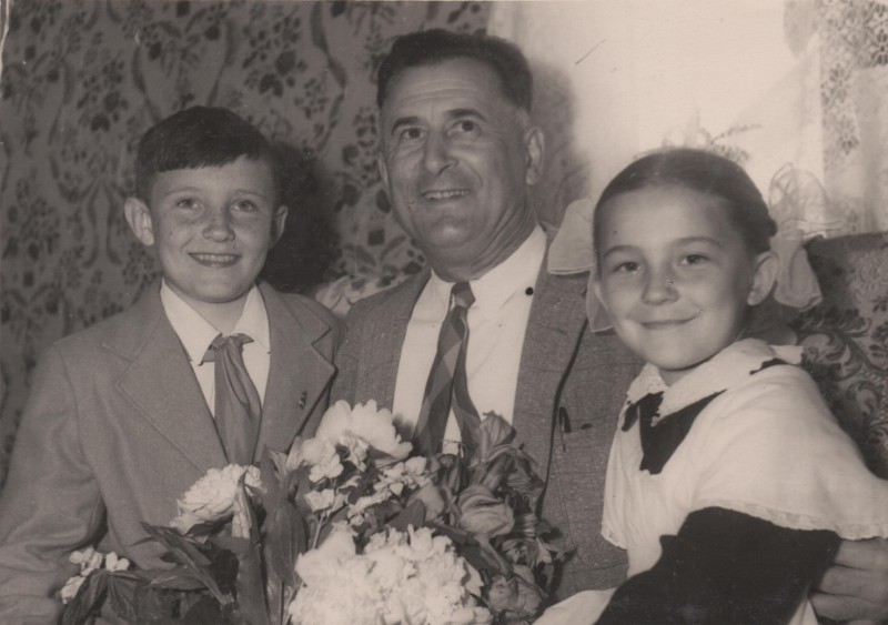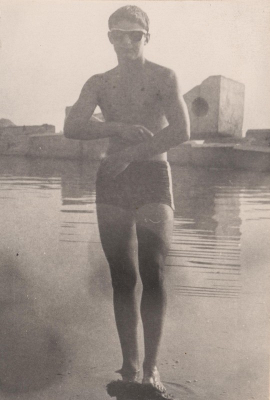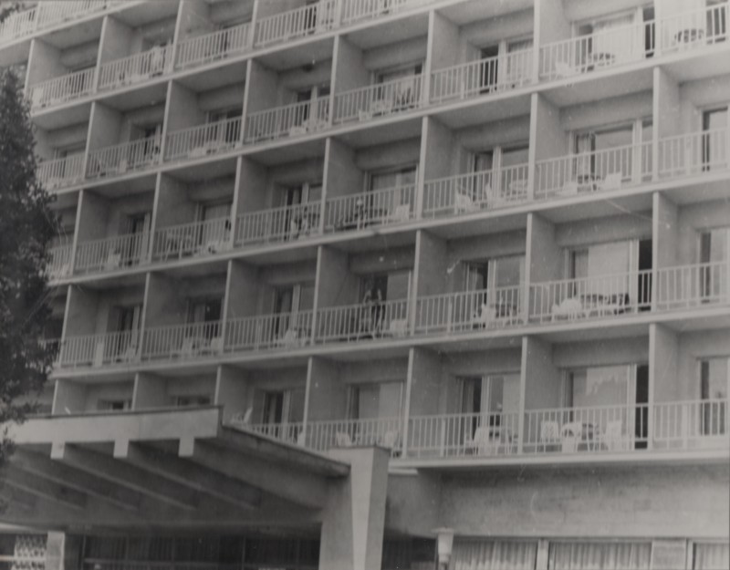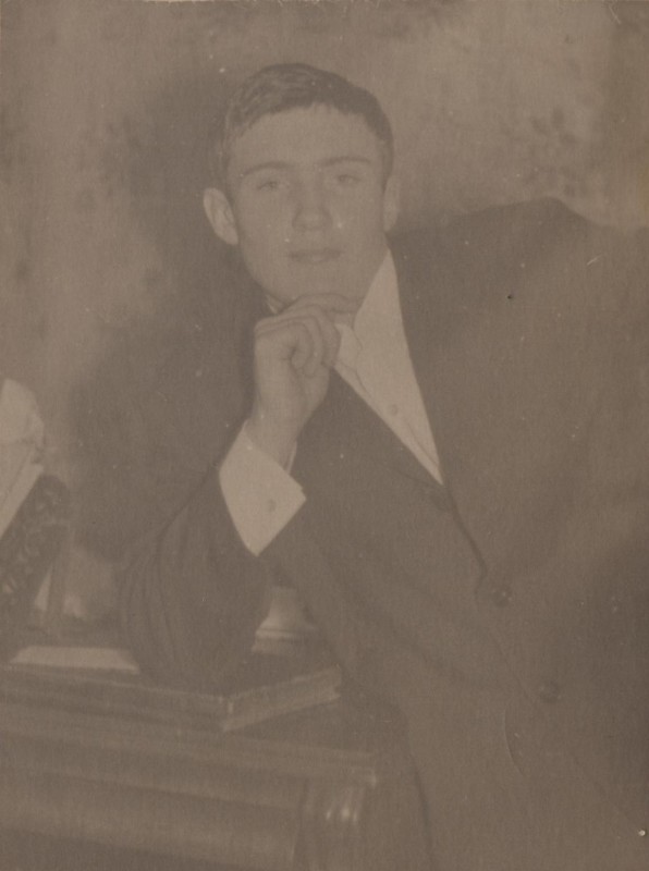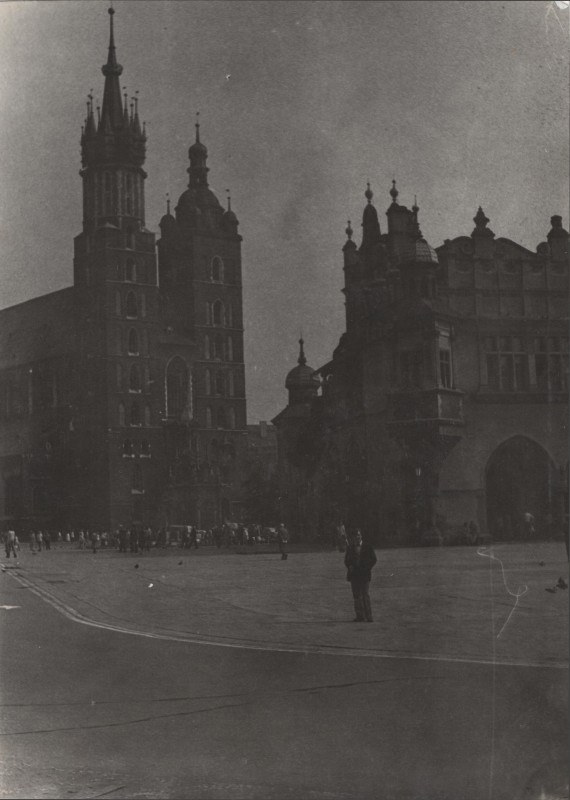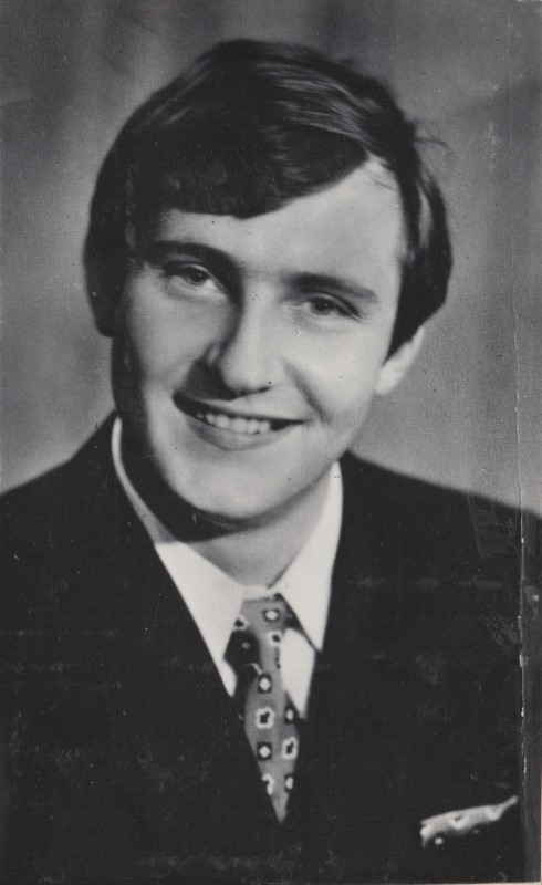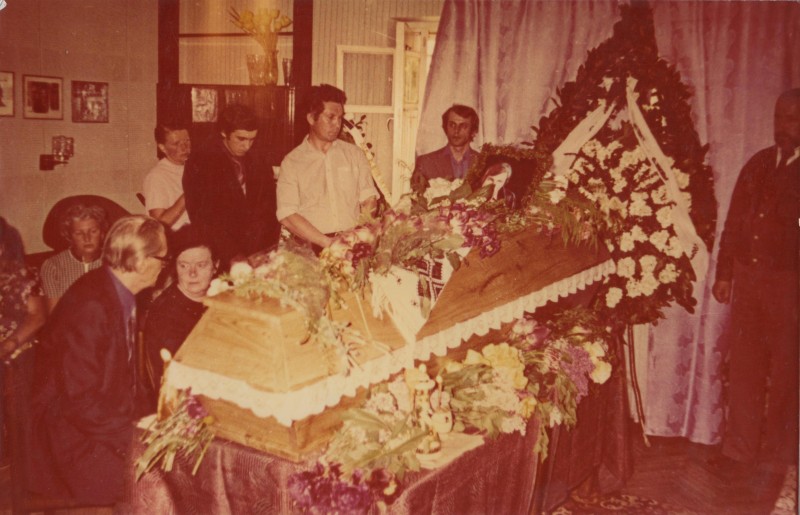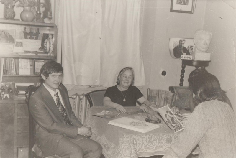 Фотографія. Чорно-біла. Сюжетна. В. Івасюк. Зображення вище колін. Анфас. Одягнутий у світлий піджак, темні брюки і сорочку в клітинку. Руки складені внизу. Поряд стоїть хлопець Микола Сторожук і щось тримає в руках. Позаду них видно будинок. Літо 1966 року. Кіцмань.