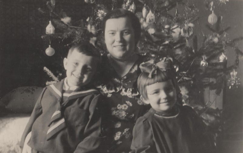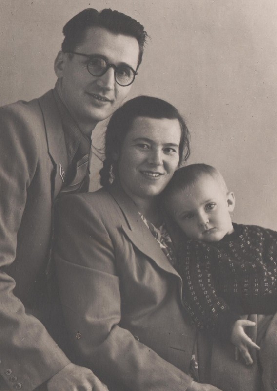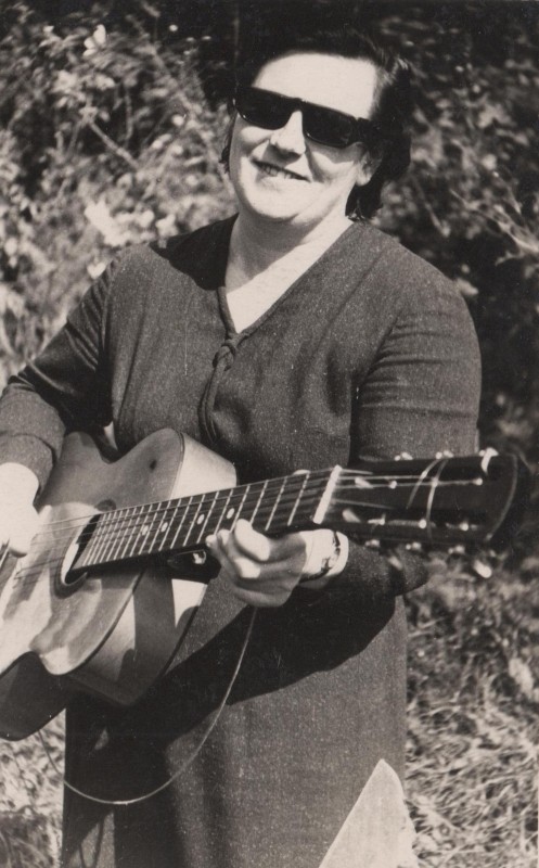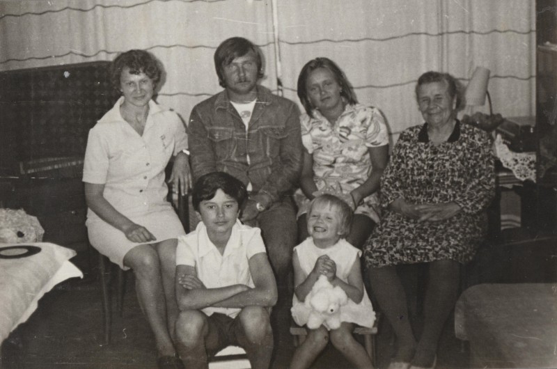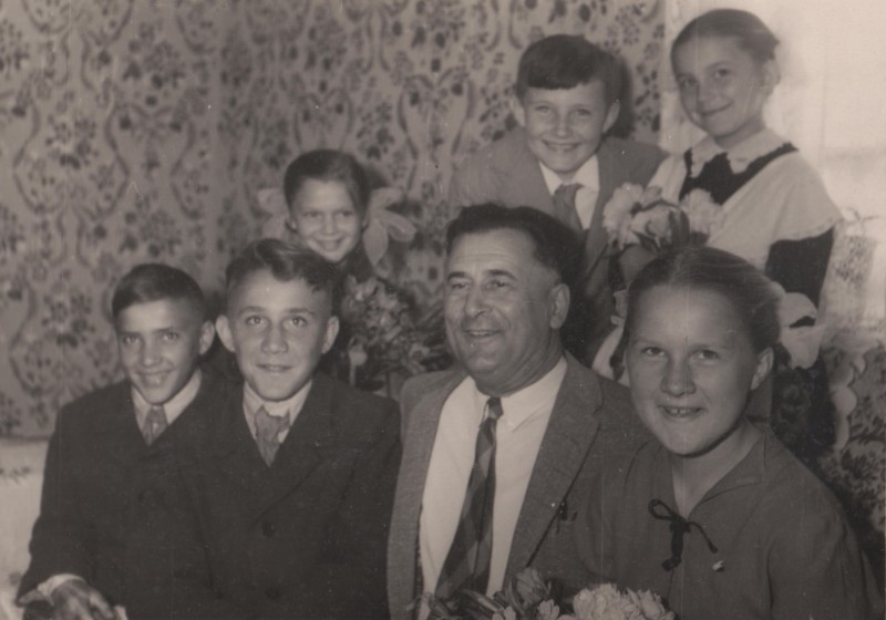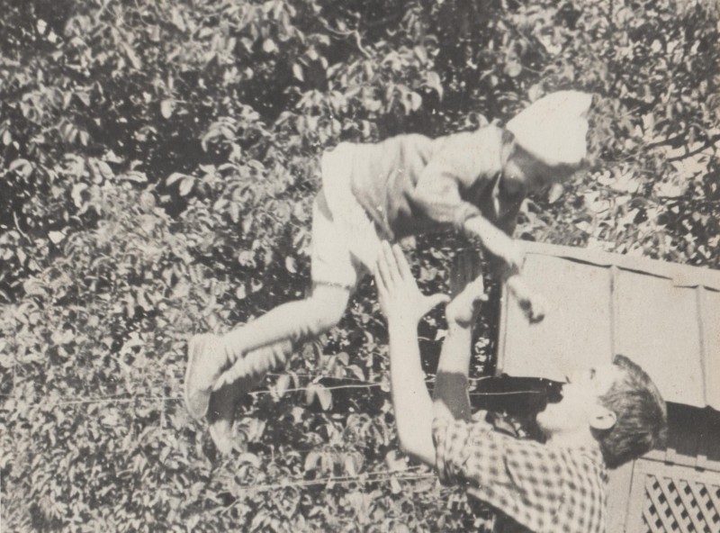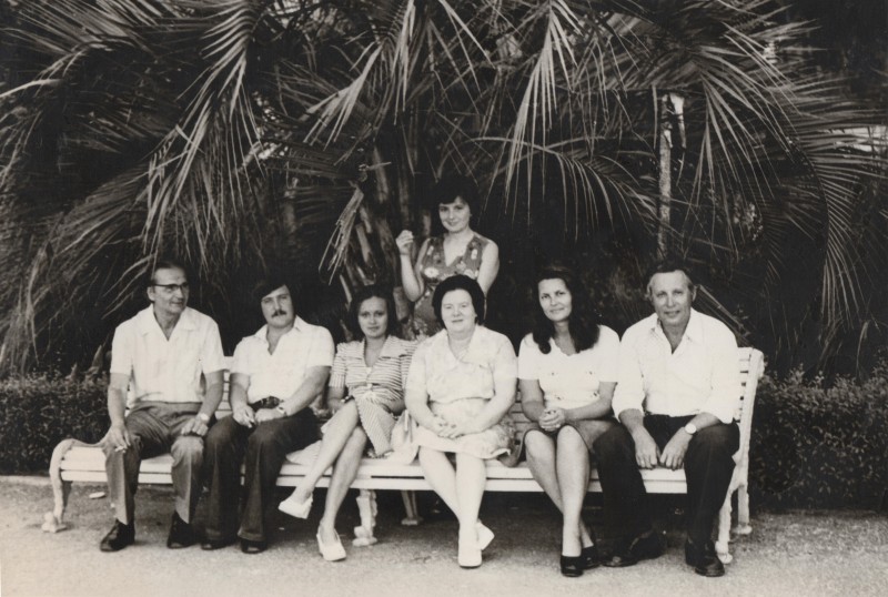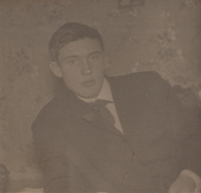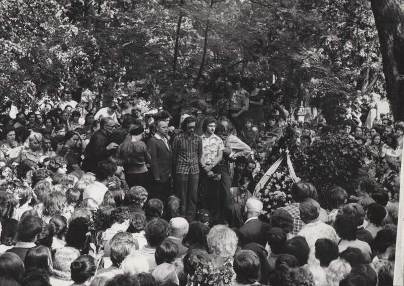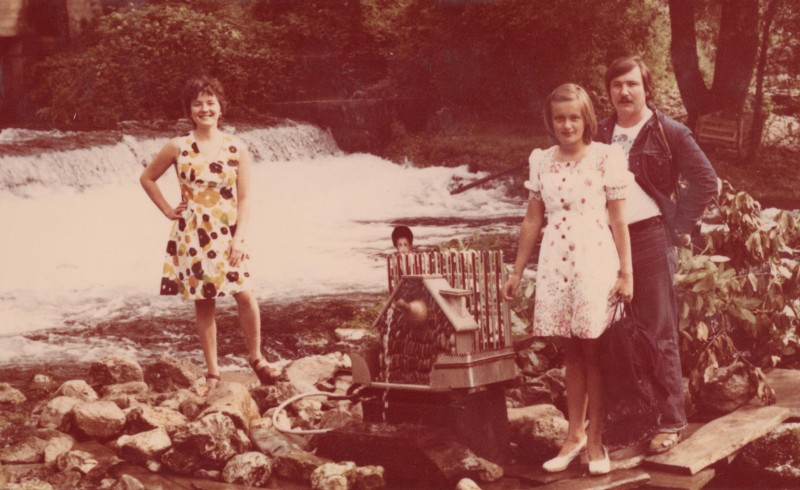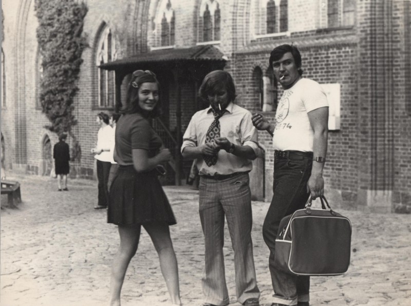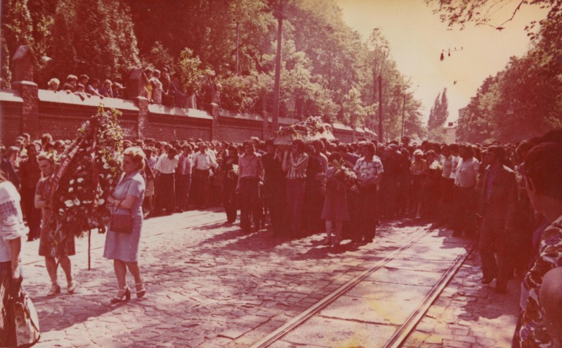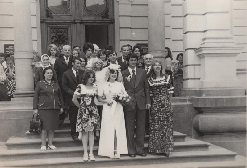 Фотографія. Чорно-біла. Сюжетна. В. Івасюк. Зображення вище колін. Анфас. Одягнутий у світлий піджак, темні брюки і сорочку в клітинку. Руки складені внизу. Поряд стоїть хлопець Микола Сторожук і щось тримає в руках. Позаду них видно будинок. Літо 1966 року. Кіцмань.