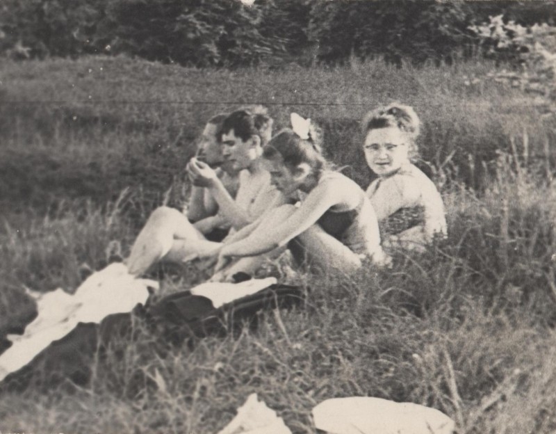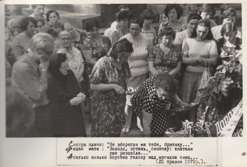 Фотографія. Чорно-біла. Сюжетна. В. Івасюк. Повний ріст. Анфас. Одягнутий у темний костюм і сорочку. Ноги перехрещені, праву руку тримає на боці. Поряд на ганку стоїть сестра Галя, одягнута у пальто з хутряним коміром і хустку. 1966 рік.
