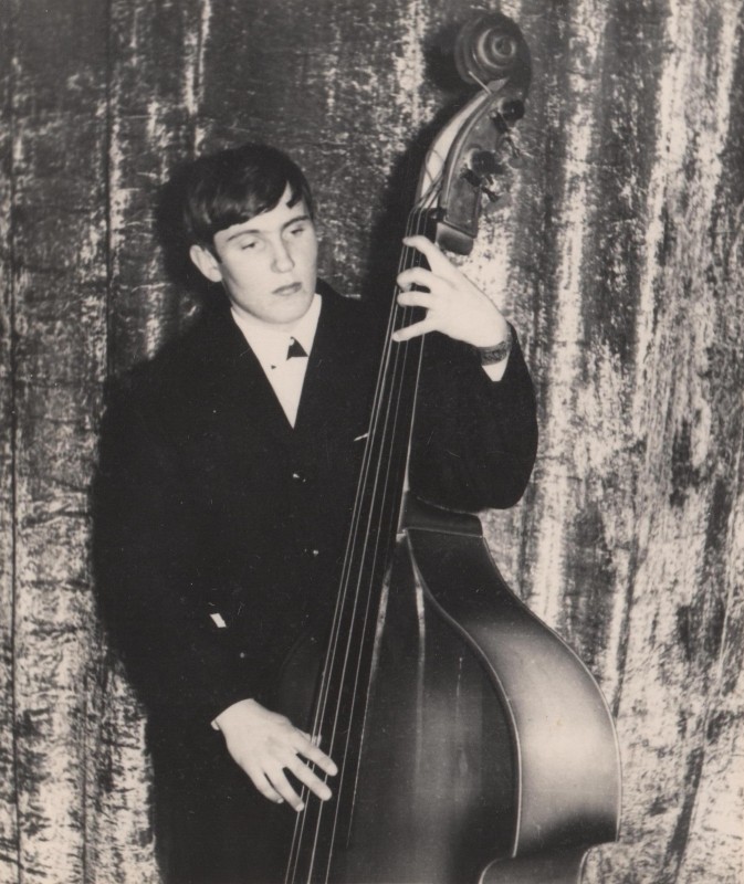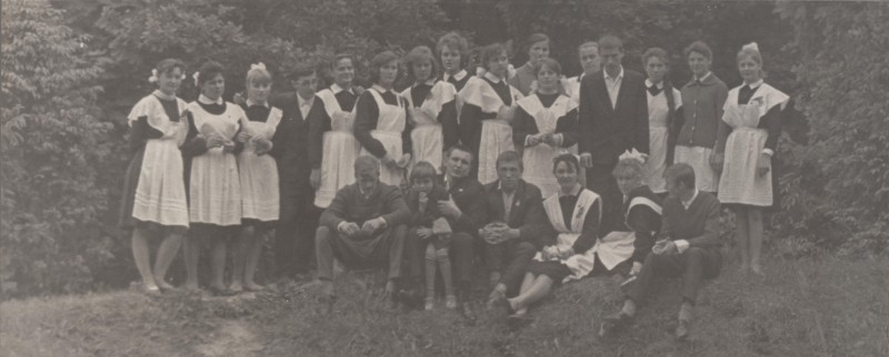 Фотографія. Чорно-біла. Сюжетна. В. Івасюк. Поясне зображення. Анфас. Він сидить за каменем, руки перед собою, щось тримає. Одягнутий у чорну жилетку. На передньому плані чоловік спиною тільки у брюках з ременем. На голові шапка, щось зав’язане на шиї. Рука ліва біля голови, на руці годинник. На фотографії багато каміння різного розміру. Кавказ. Серпень 1969 року.