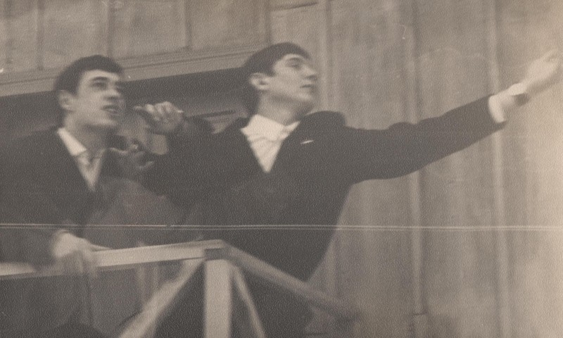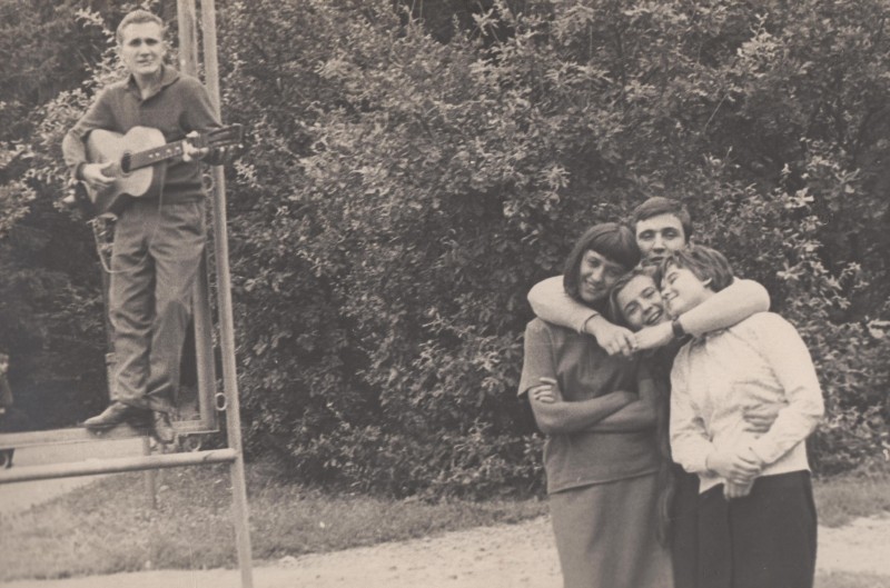 Фотографія. В. Івасюк сидить за каменем. На передньому плані чоловік. Кавказ. Серпень 1969 року.