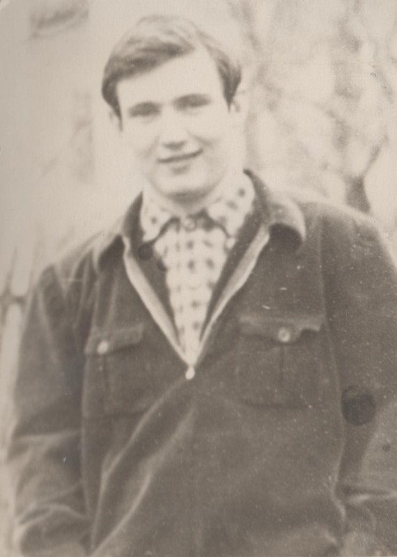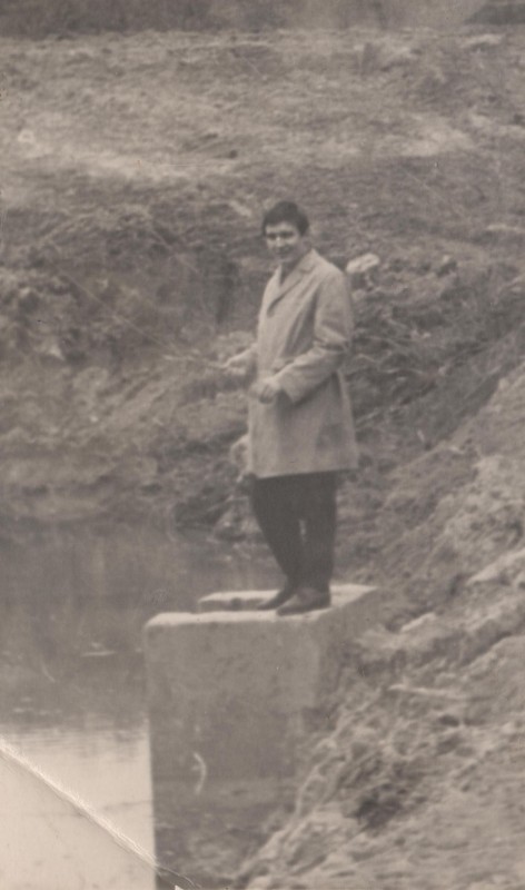 Фотографія. Чорно-біла. Сюжетна. В. Івасюк. Повний ріст. Анфас. Одягнутий у світлий плащ і темні брюки. Стоїть на кам’яній (бетонній) плиті біля води.