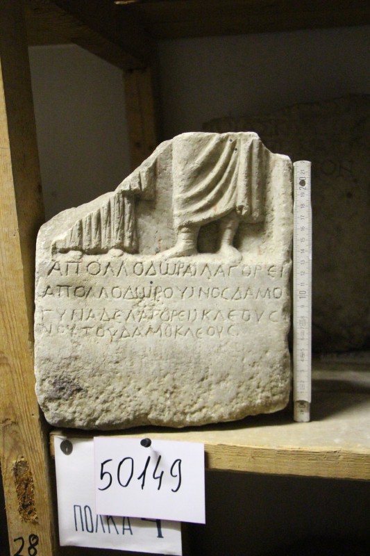 Фрагмент надгробної стели, рельєфне зображення нижніх частин фігур чоловіка і жінки. Під ними грецький напис у 4 рядки.
