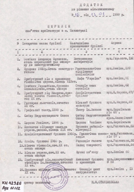 Грамота похвальна Диденко Наталці Гавриловні, учениці шостого класу Шандрівської школи Юр'ївського району Дніпропетровської області с. Шандрівка за відмінні успіхи та зразкову поведінку від 5 червня 1941 р. ( українською мовою). Грамота на художньому бланку. У верхній частині посередині герб УРСР, з лівого боку портрет В. І. Леніна, з правого портрет І. В. Сталіна, нижче текст. Грамота завірена круглою печатткою та підписами директора школи та вчителя.