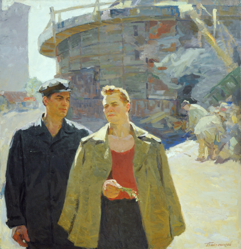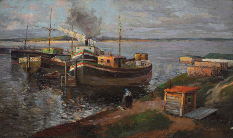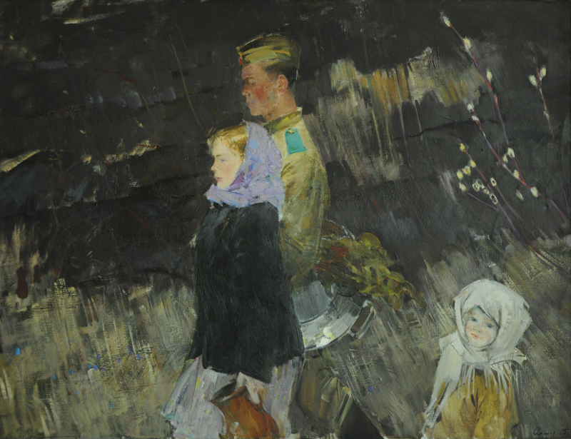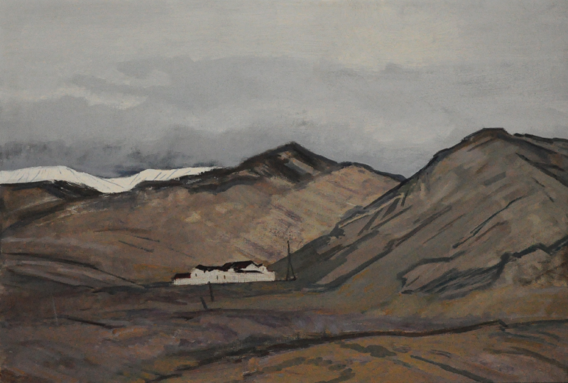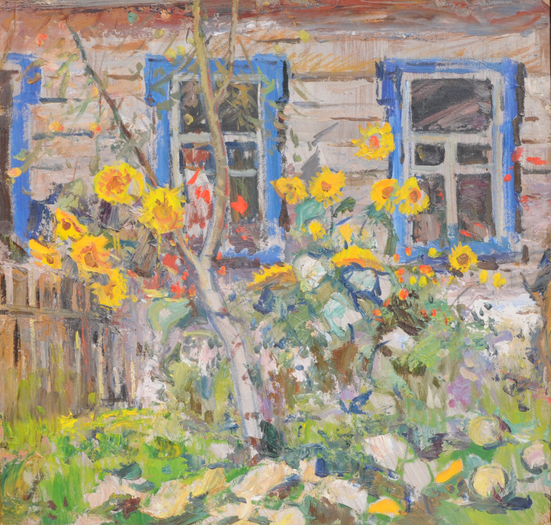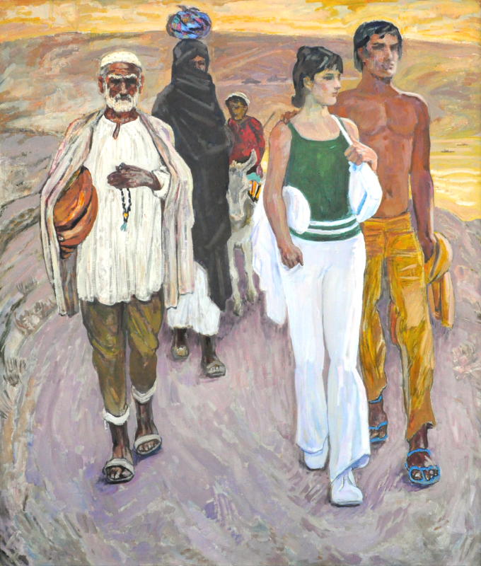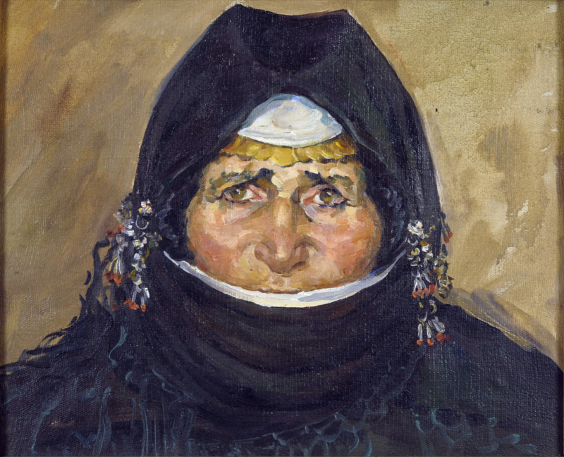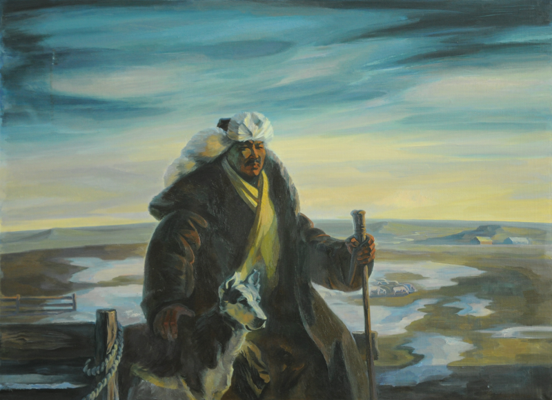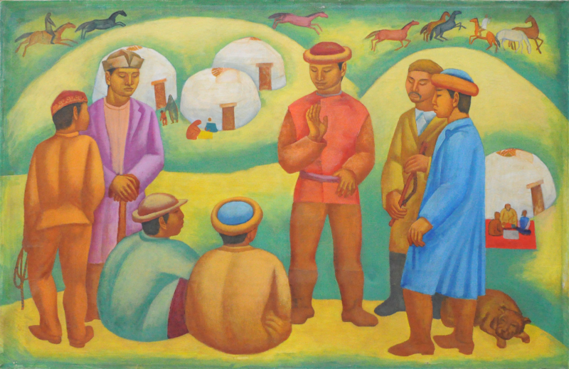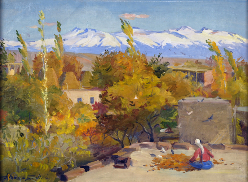 Автор Байрамов Ярли. Площинно-декоративна композиція. На першому плані, посередині – жовто-зелена піч-тандир з червоним круглим отвором, ліворуч правим профілем зображена туркменка, що сидить на колінах. Одягнута у червону сукню, блакитне покривало та блакитний головний убір з червоною пов’язкою. В протягнутих вперед руках жінки круглий золотисто-жовтий хліб. Поруч на блакитно-бузковій тканині два спечених хліба. Праворуч від печі на зеленому та фіолетовому тлі зеленувато-блакитний баранчик, що зображений лівим профілем. На другому плані, в центрі на темно-зеленому тлі – великі квіти. Ліворуч у перспективному скорочені світло-зелена стіна будинку з дверним та віконними отворами різного розміру. Дах будинку білий, плаский, посередині – надбудова. На жовто-охристому фоні третього плану – умовно-декоративне зображення червоним, синім, чорним, зеленим та помаранчевим кольорами стада корів та овець та двох пастухів, що гонять їх. Напрямок руху – вправо. Внизу праворуч авторський підпис зеленою фарбою: «Ярлы 72».