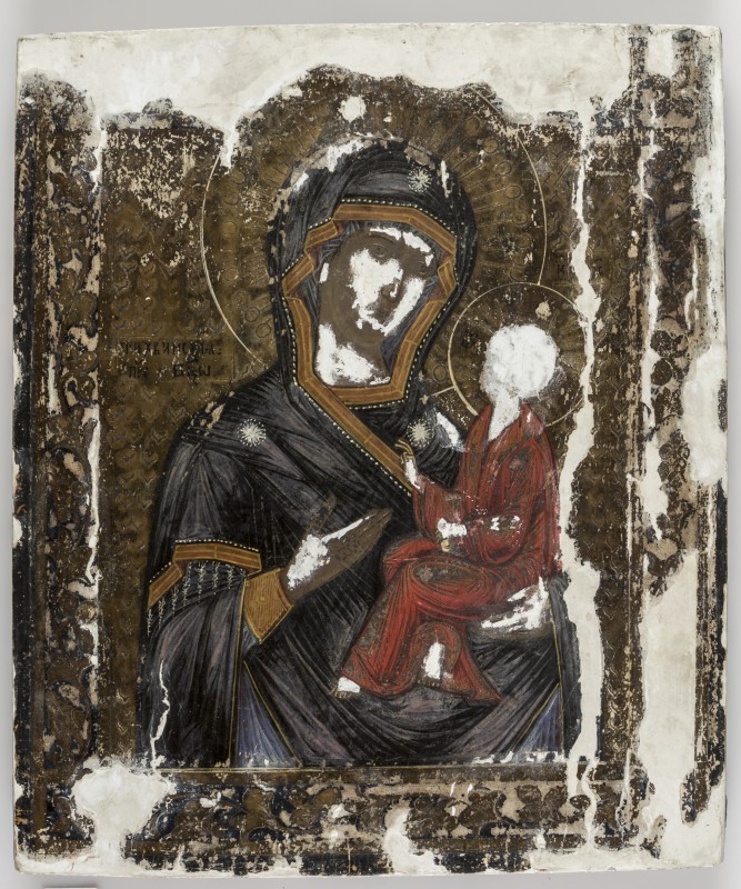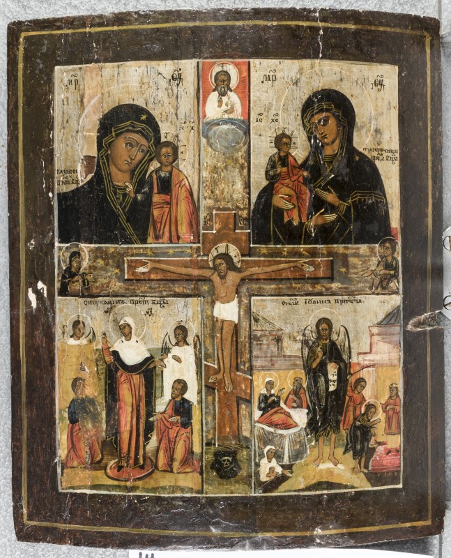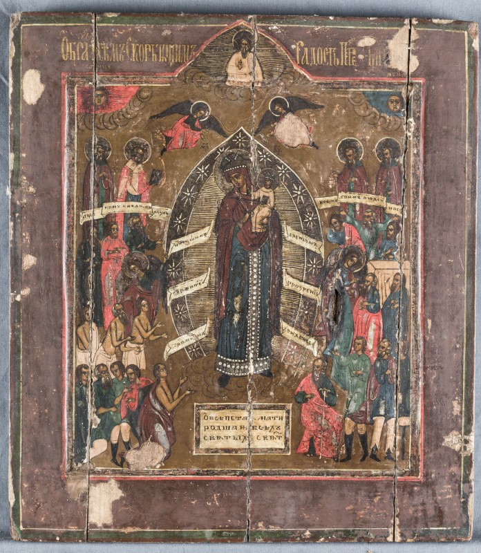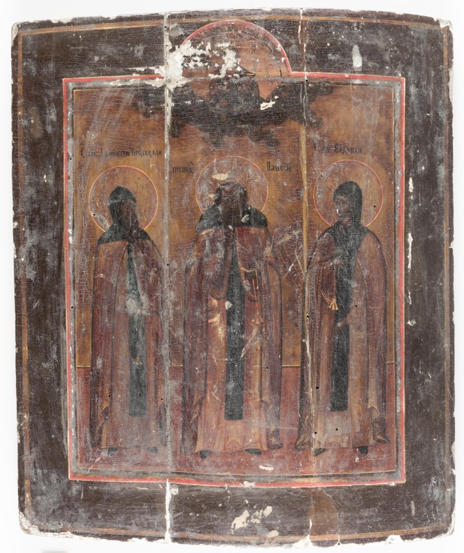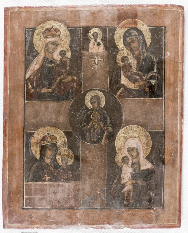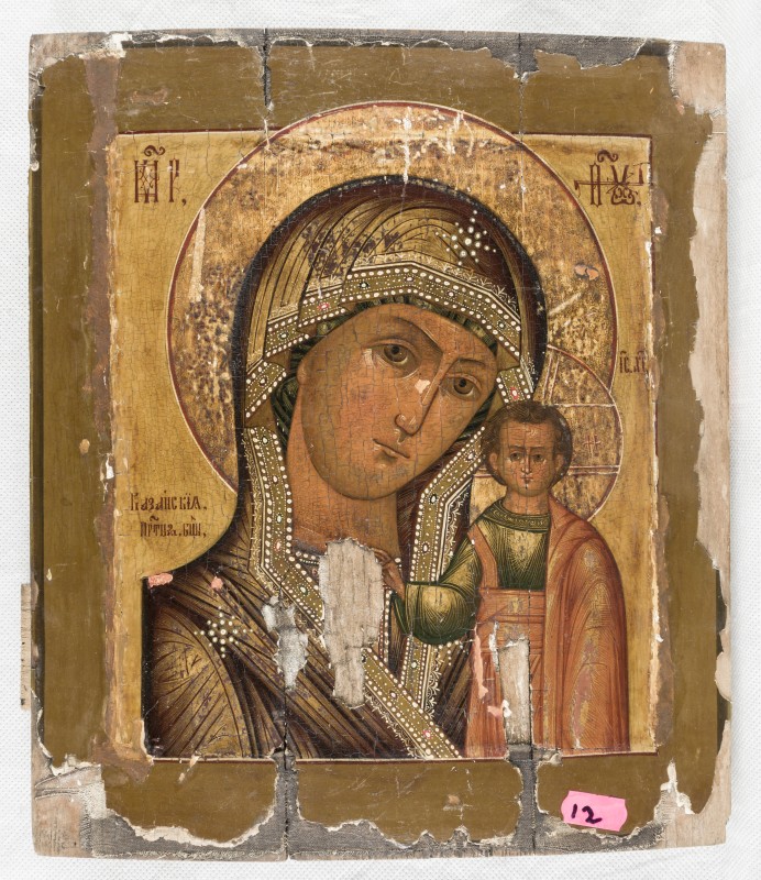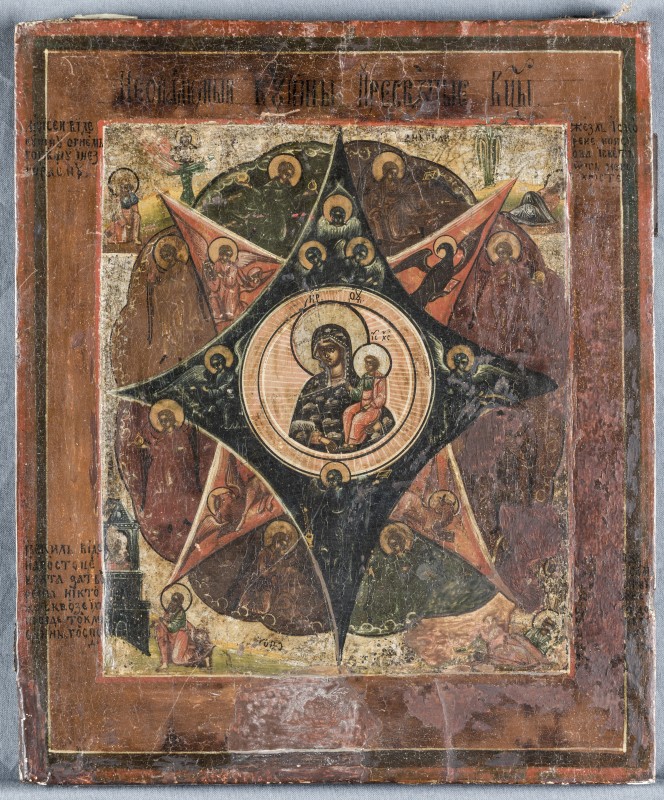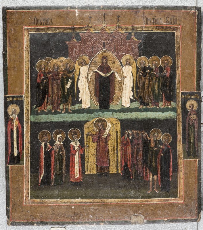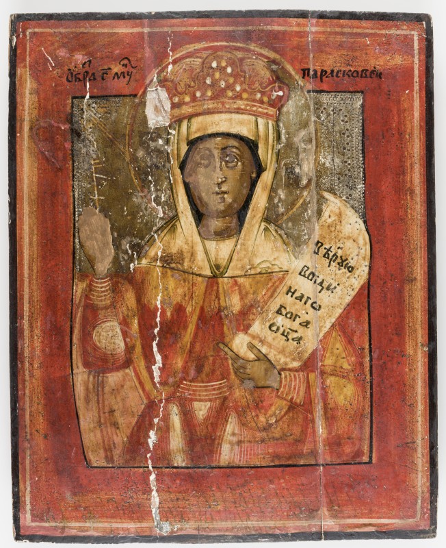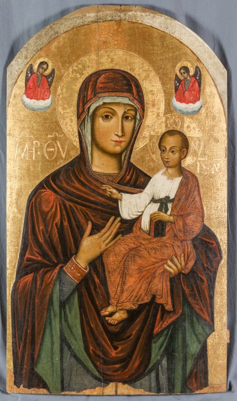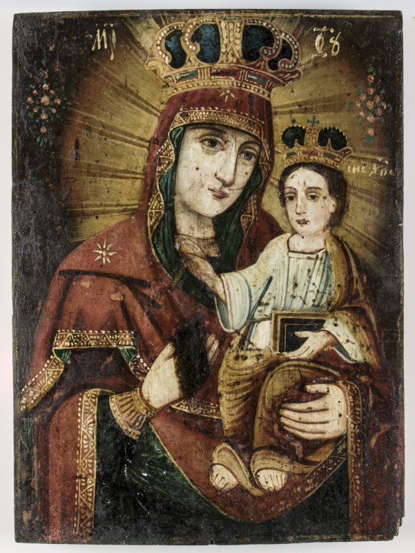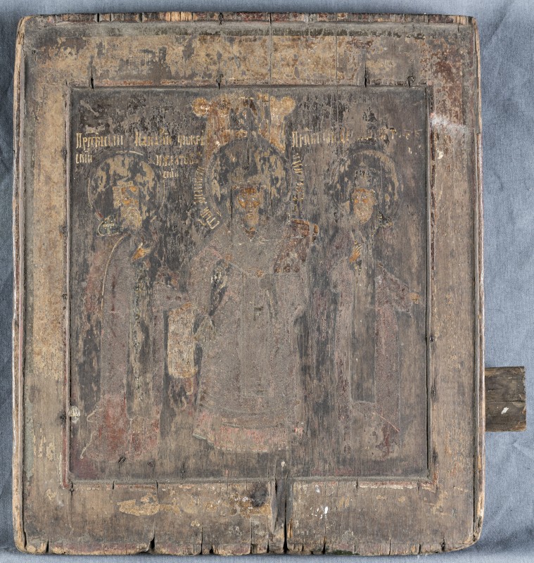 Ікона пречистої богородиці троєручиці. На золотистом фоні , прикрашеному орнаментом у стилі рокайль, зображена богородиця, яка тримає на правій руці Ісуса, ліва рука покоїться на грудях, третя рука виходить з правого низу і покоїться на животі. Одяг оздоблений теж в золотистий тон. З лівого боку богородиці напис "Троеручица Прест..."XVIIIст.