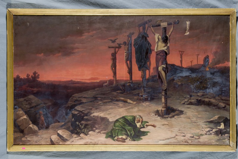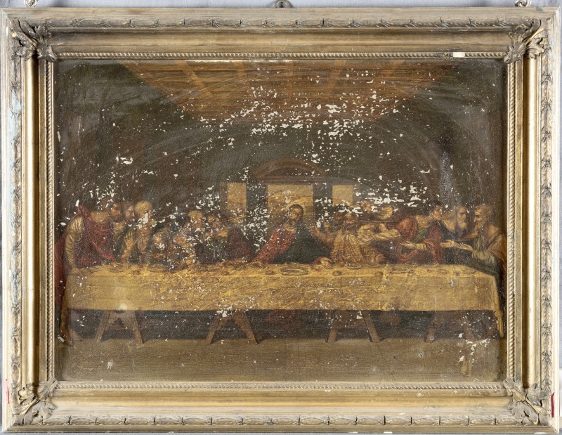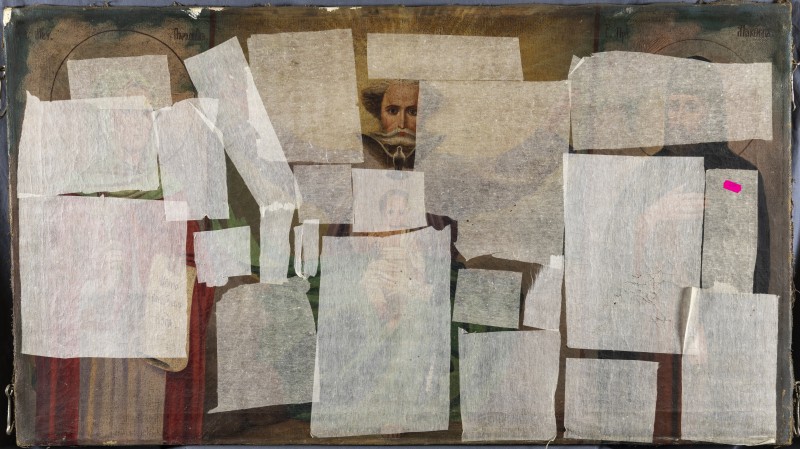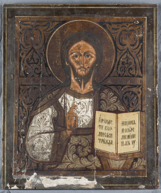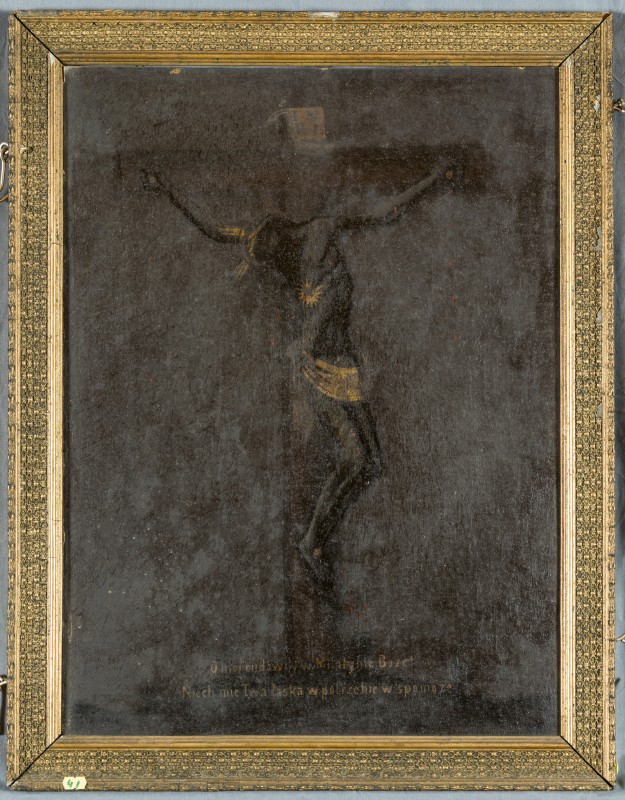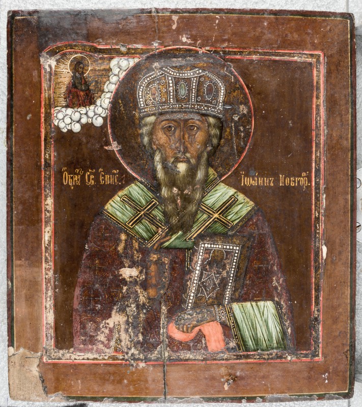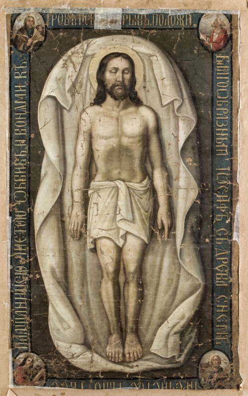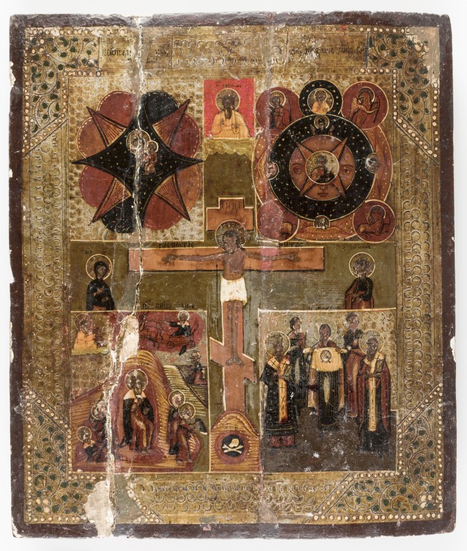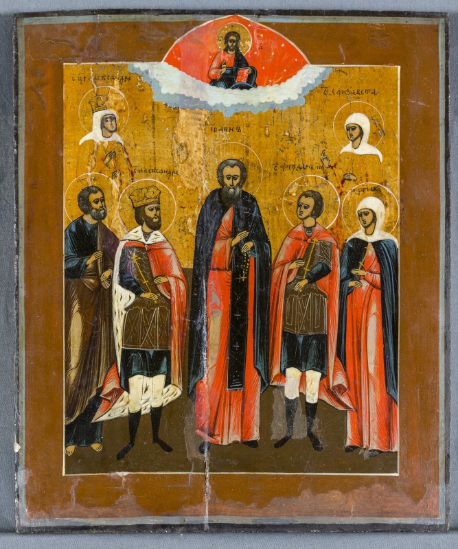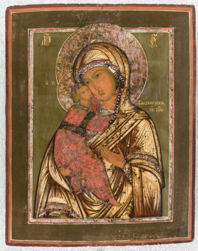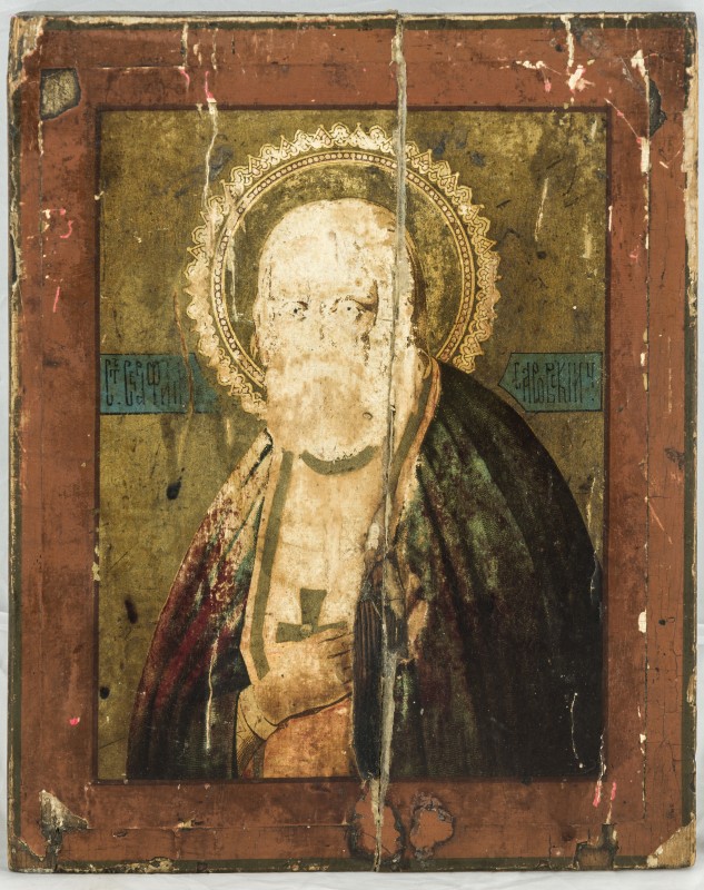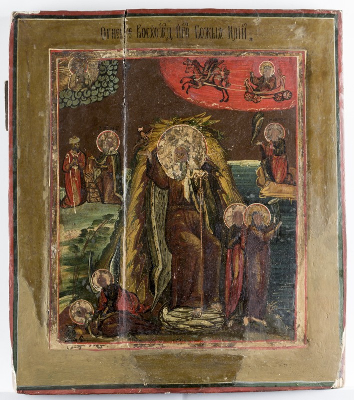 Ікона пречистої богородиці троєручиці. На золотистом фоні , прикрашеному орнаментом у стилі рокайль, зображена богородиця, яка тримає на правій руці Ісуса, ліва рука покоїться на грудях, третя рука виходить з правого низу і покоїться на животі. Одяг оздоблений теж в золотистий тон. З лівого боку богородиці напис "Троеручица Прест..."XVIIIст.