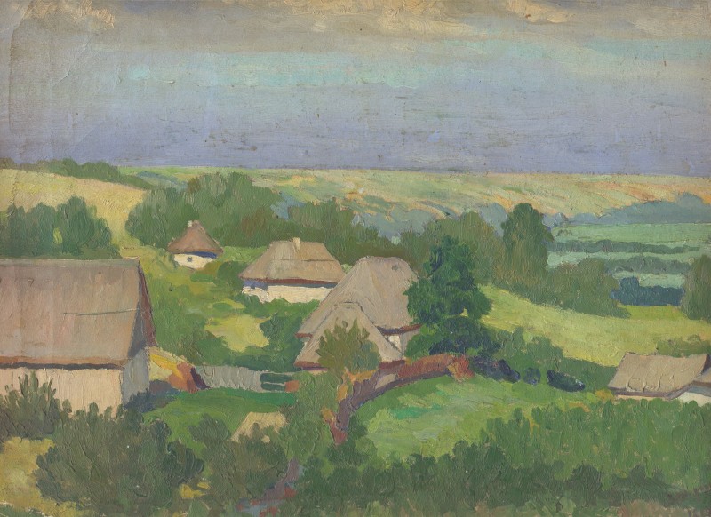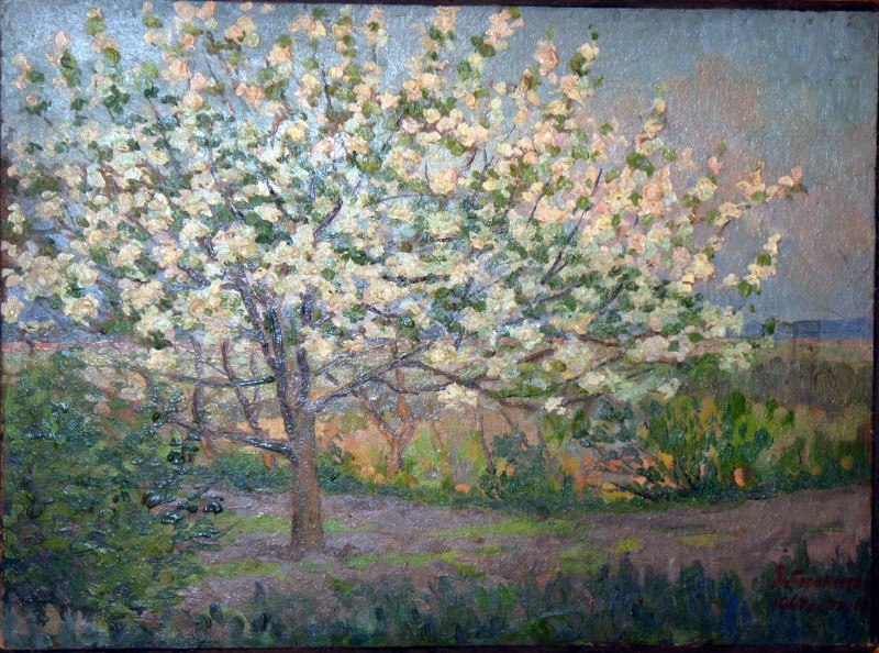 Зображення кольорове (переважають відтінки зеленого, бузкового та коричневого кольорів), вертикальне, виконане олійними фарбами на картоні. На картині зображено натюрморт. На столі, вкритому білою скатертиною, стоїть глиняний глечик з букетом бузку. В правому нижньому куті авторський підпис "І. Запорожченко 1941р. травень".