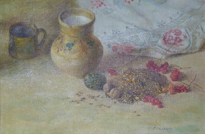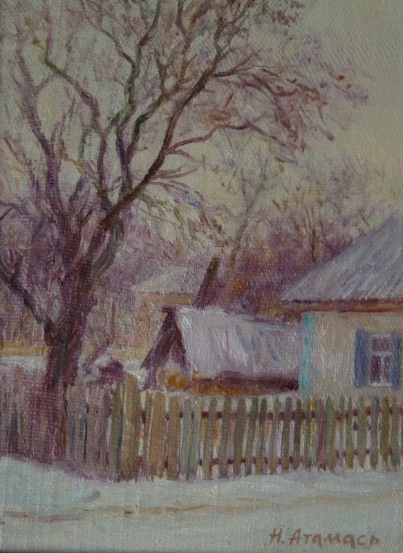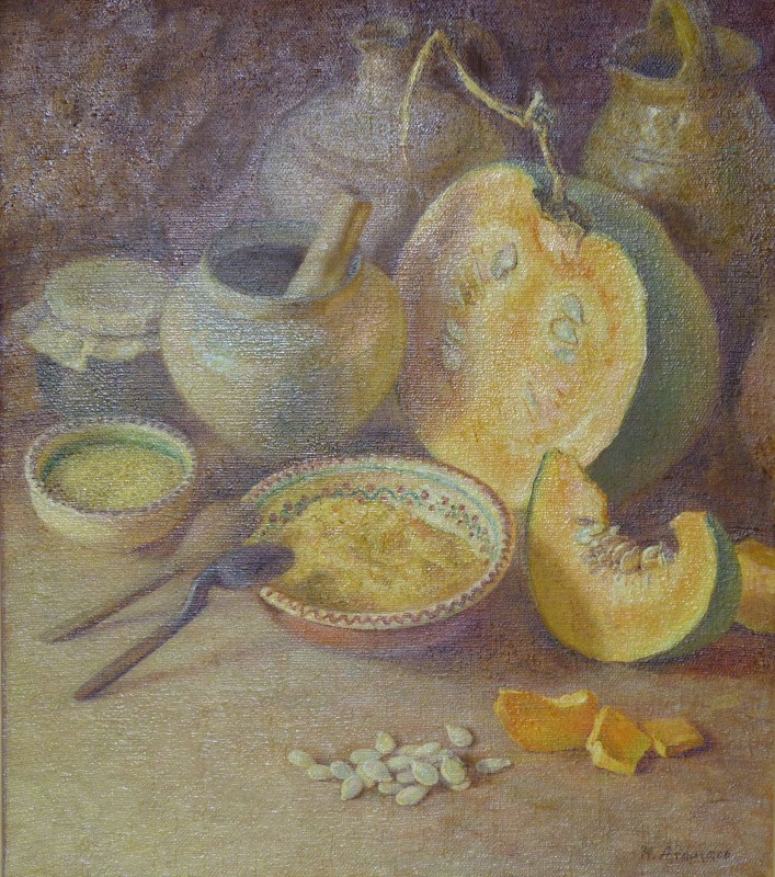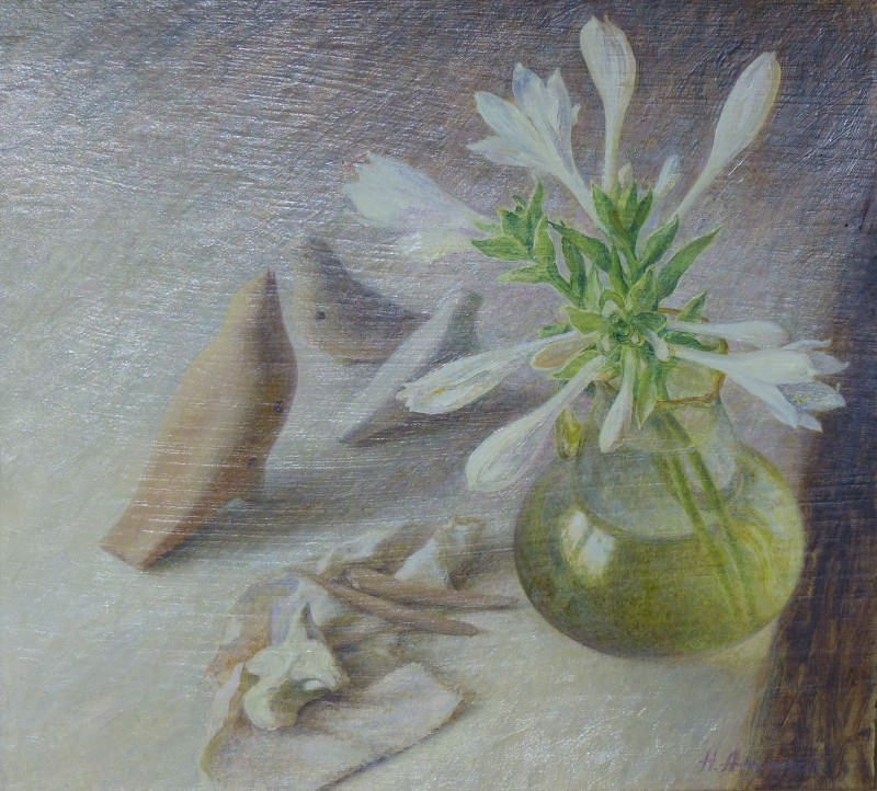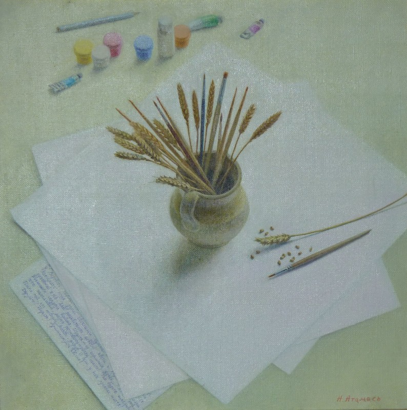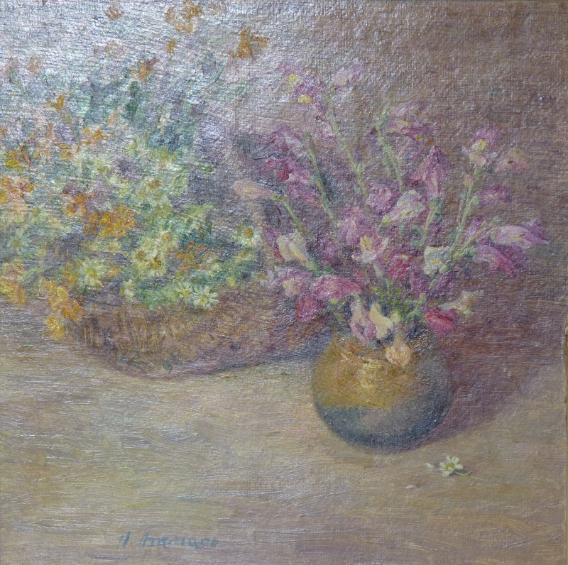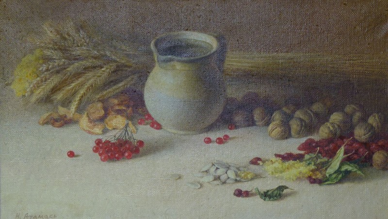 Зображення кольорове (домінують відтінки білого, зеленого, бузкового, рожевого та коричневого кольорів),вертикальне, виконане олійними фарбами на полотні. На картині зображено натюрморт. На світлій площині стоїть коричнева глиняна поливʼяна ваза з букетом рожевих та бузкових айстр. В нижньому правому куті авторський підпис "Н.Атамась".