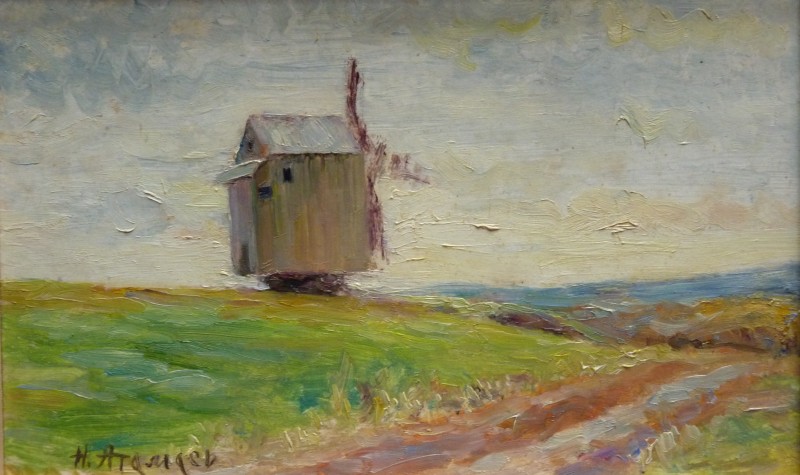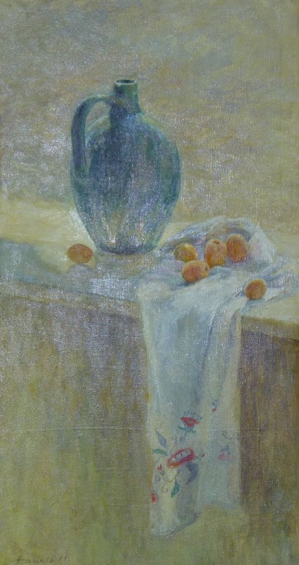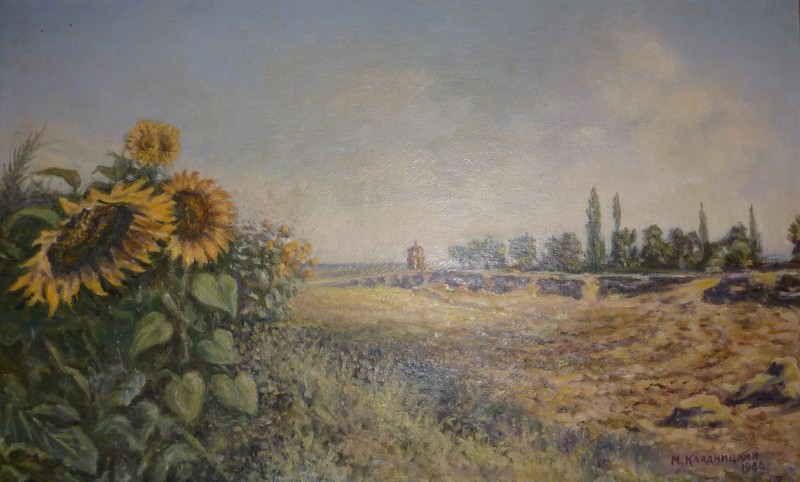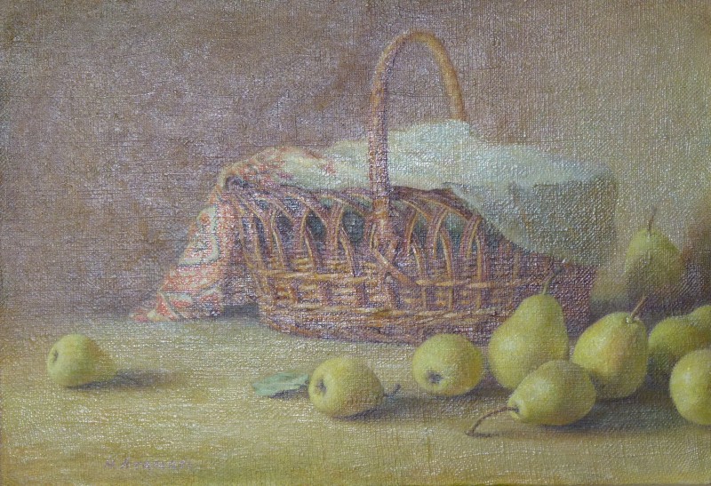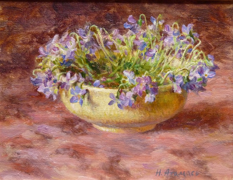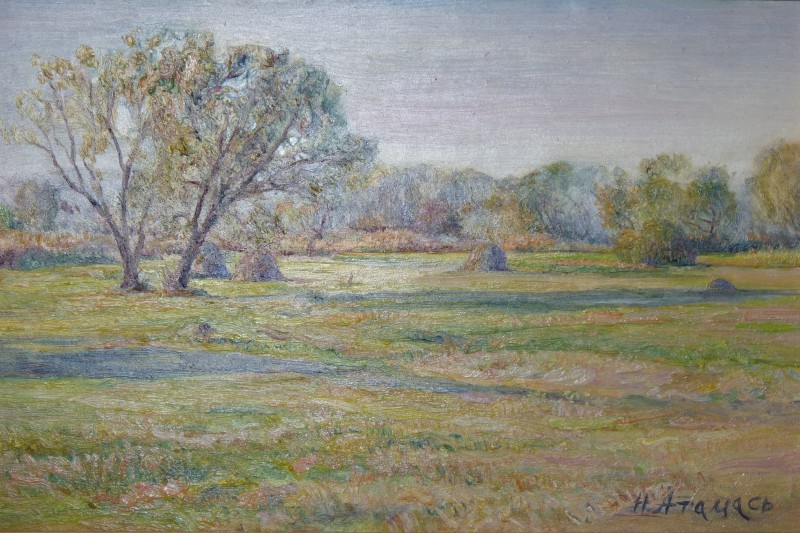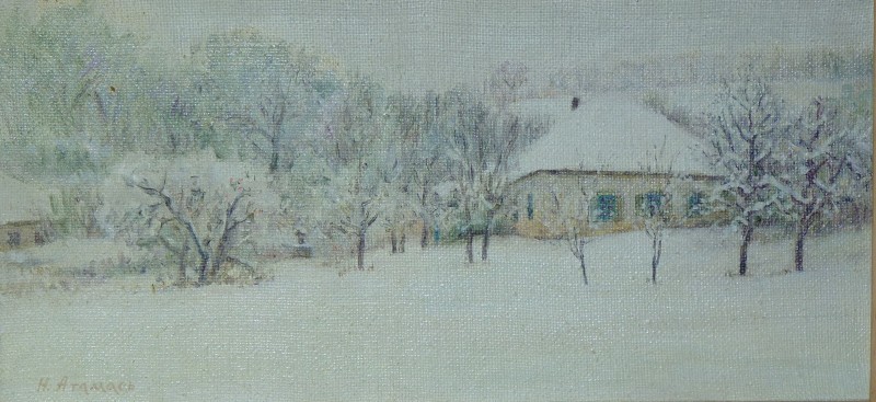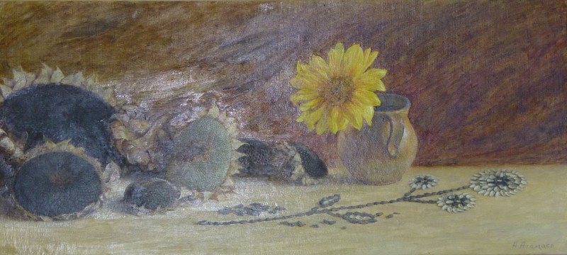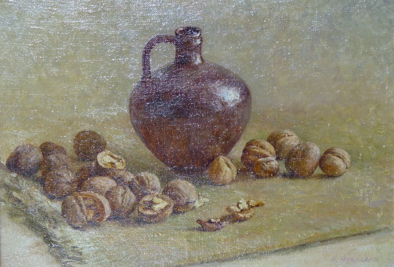 Зображення кольорове (домінують відтінки білого, зеленого, бузкового, рожевого та коричневого кольорів),вертикальне, виконане олійними фарбами на полотні. На картині зображено натюрморт. На світлій площині стоїть коричнева глиняна поливʼяна ваза з букетом рожевих та бузкових айстр. В нижньому правому куті авторський підпис "Н.Атамась".